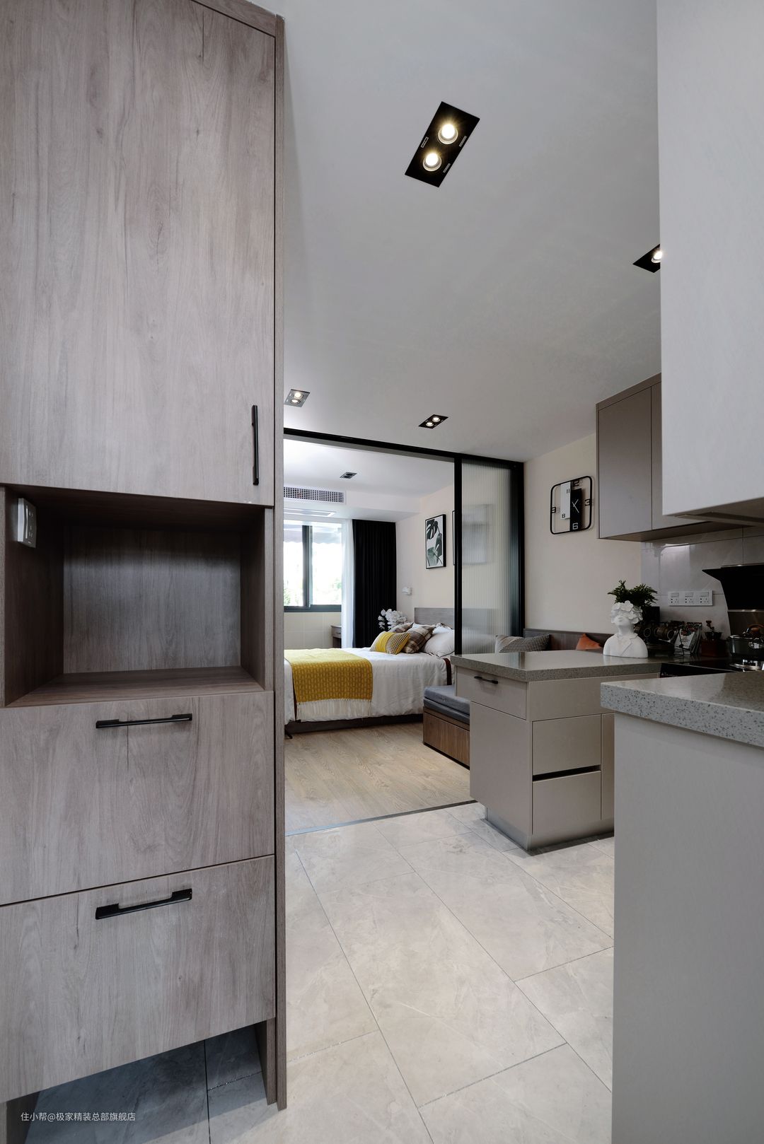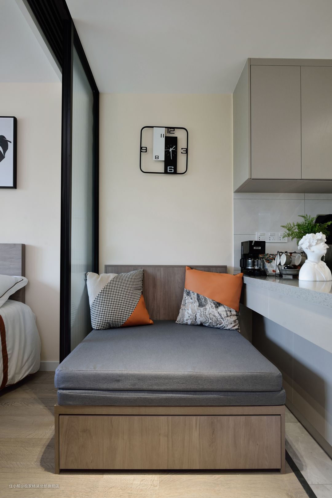 由于空间受限所以整体打通,动线布局更加合理并且大程度上解决厨房与暗厅之间的采光问题。一侧使用长虹玻璃做客厅与卧室间的隔断,采光性高。整体采用浅棕色搭配卡曼橘做装饰性点缀,简单大气整齐,麻雀虽小,五脏俱全!