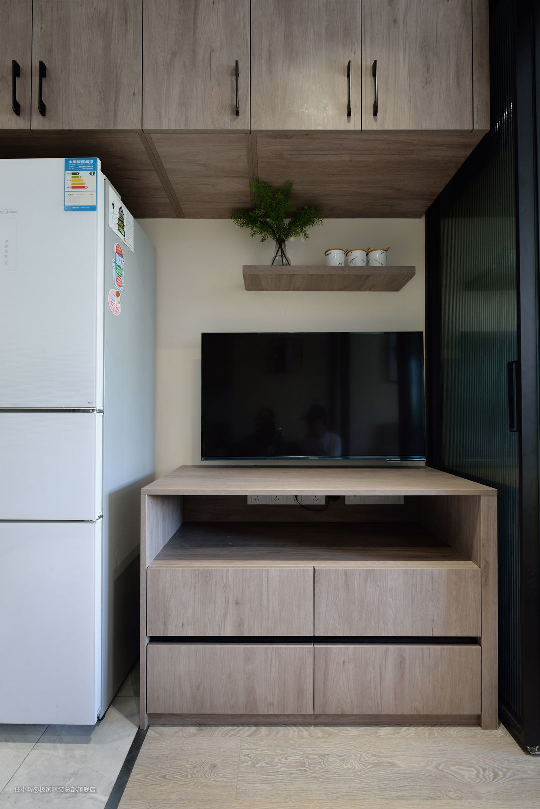电视背景墙整体做吊柜设计,并且内嵌冰箱,提升空间利用,色调一致,整体风格统一。