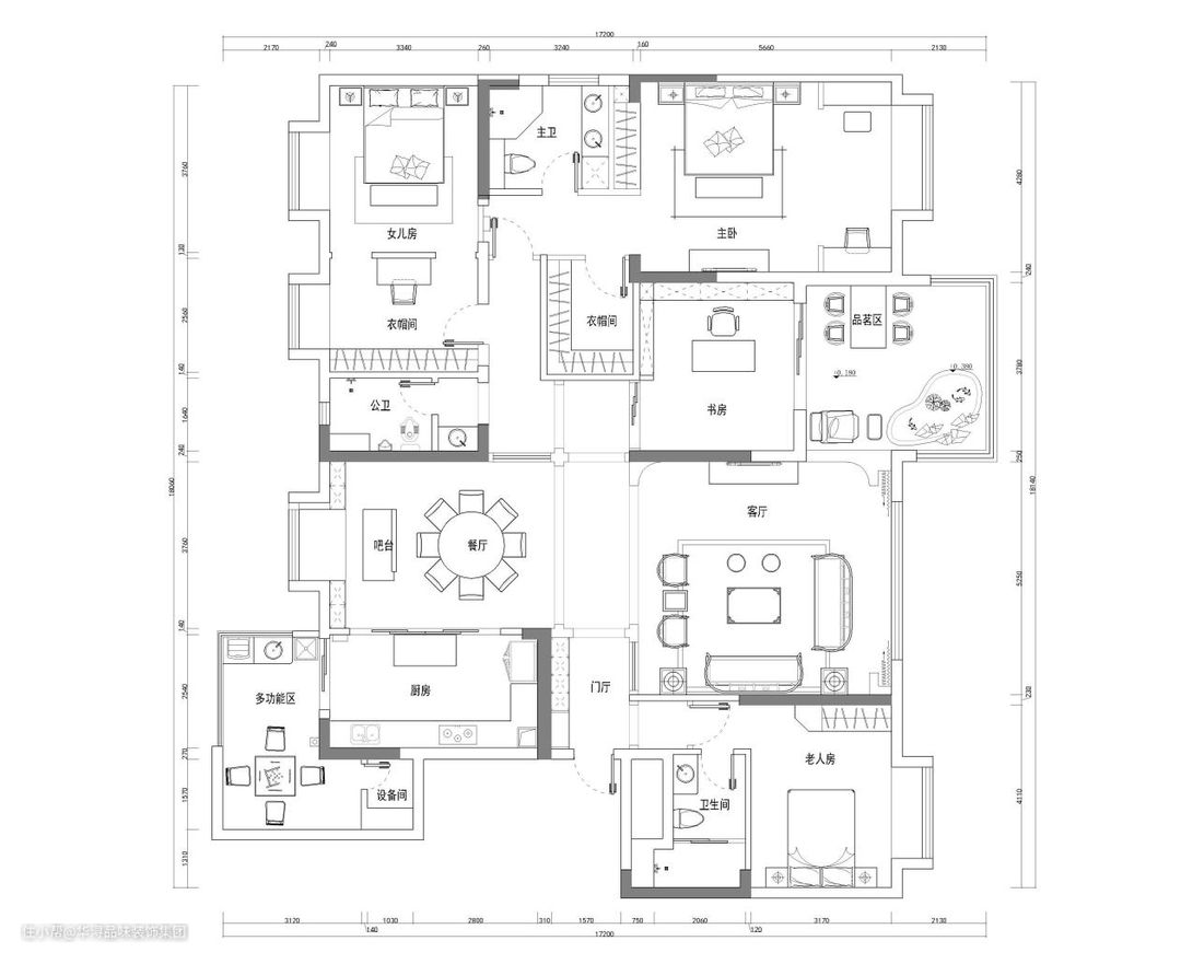 本案业主非常喜欢中国传统文化,并且希望自己家里能有传统文化的韵味,但是自己购买的新房是一套精装修房,里面自带的装修并不符合业主的审美。 经过再三考量,业主决定重新装修,对于现在这套房,业主希望我们在保留房间现代感、为自己和家人提供高端生活享受的同时,加入中式传统元素,打造一个现代与古典相融合的家庭空间。 对于这次重新装修业主非常重视,在前往现场实际测量时,就向我们提出了一些具体的设计要求: 1、这套房装修好之后,业主准备把家里的老人也接过来一起居住,所以要预留一间老人房。另外家里还有一个女儿,同样要给女儿留一间卧室。 2、预留一间书房,供业主读书使用。 3、业主喜欢中式传统的茶道,专门设计一个品茗区,让业主在空闲时间可以在这里喝茶休息。 4、女儿房和主卧室里要设置衣帽间和梳妆台。