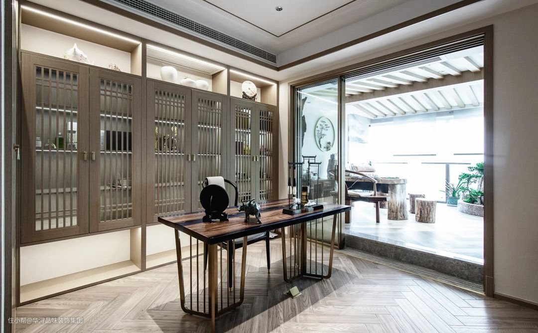 书房和品茶区连在一起,中间使用通透的玻璃推拉门进行连接。这两个空间是完全不同的两种氛围,书房的家具整体呈棕色调,使用大量的直线条和矩形进行组合,让空间显得淡雅且秩序井然。