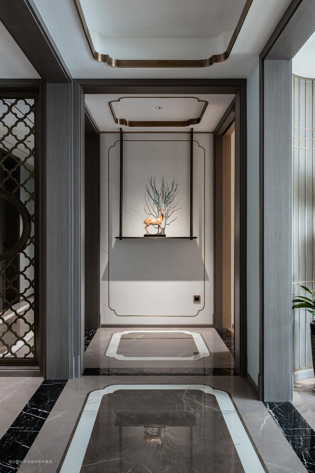 无论是墙面、地面还是吊顶之上,都使用了四角向内凹的矩形线框,这个造型多见于传统的“如意”之上,是祥云纹饰的一个变种,寓意吉祥,有强烈的中式古典韵味。在正对入户门的墙壁上镶嵌了一块白色的大理石,并在前面悬挂了“鹿”造型的摆件将玄关装饰的极为有韵味。