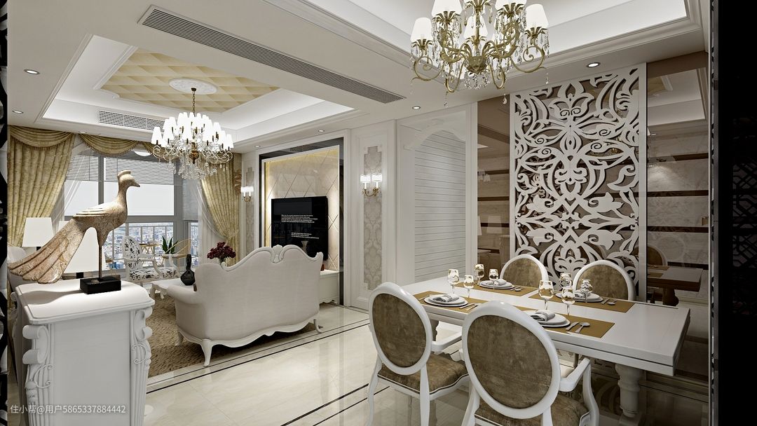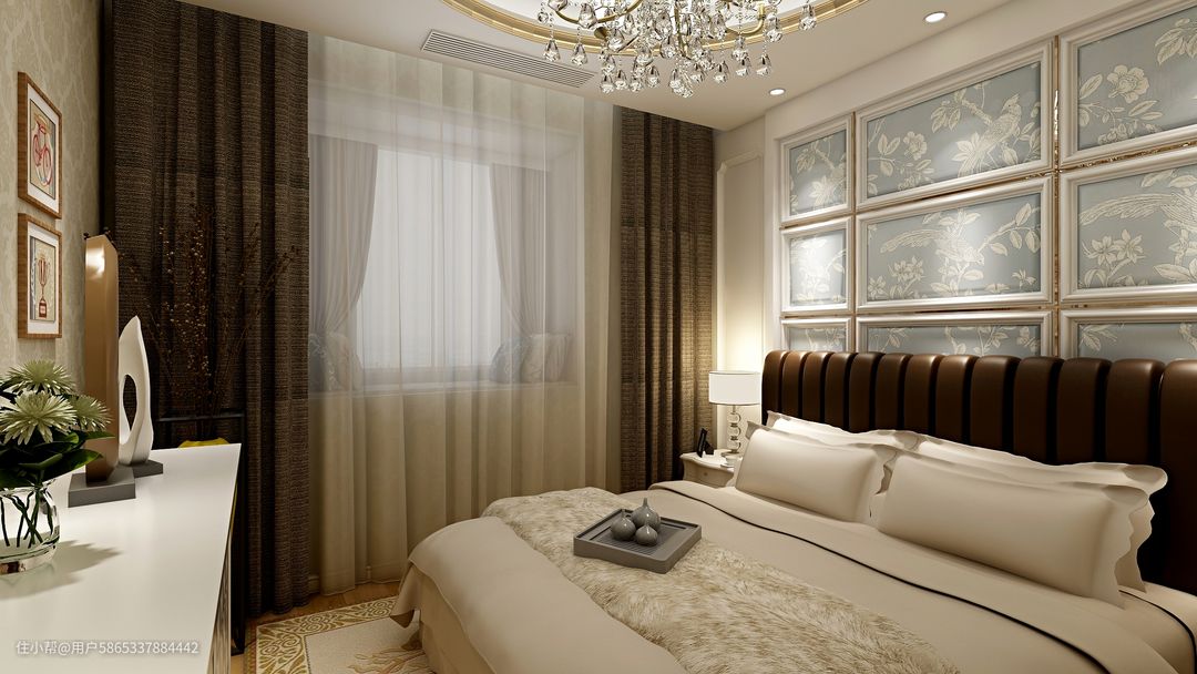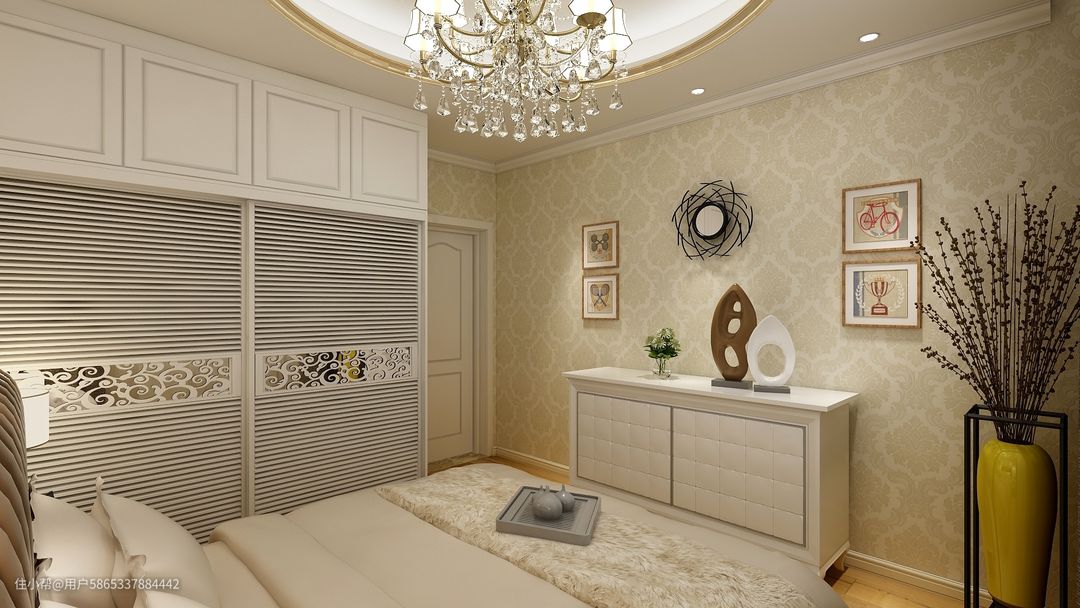 主卧的设计超级具有欧式风情,淡雅的背景色调上,融入金色的元素,展现空间主人的高贵和优雅,壁纸的搭配上还融入了雕花,空间更显浪漫~