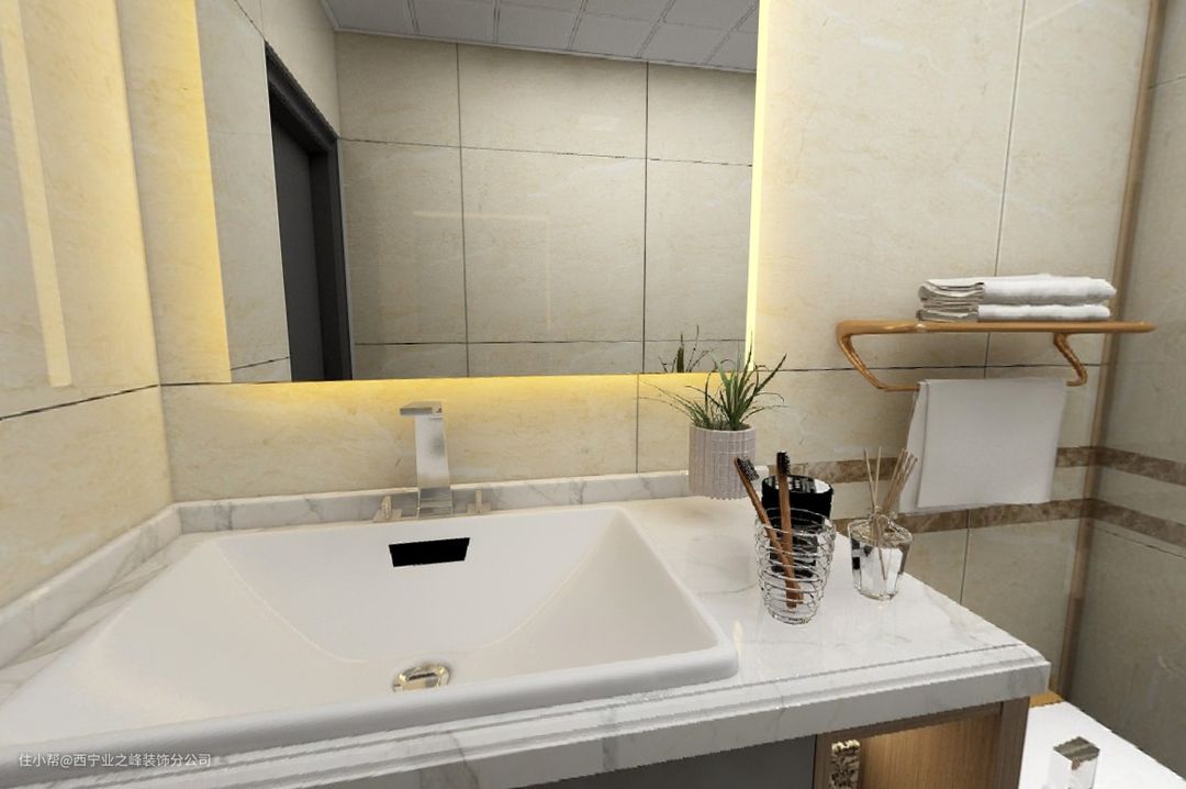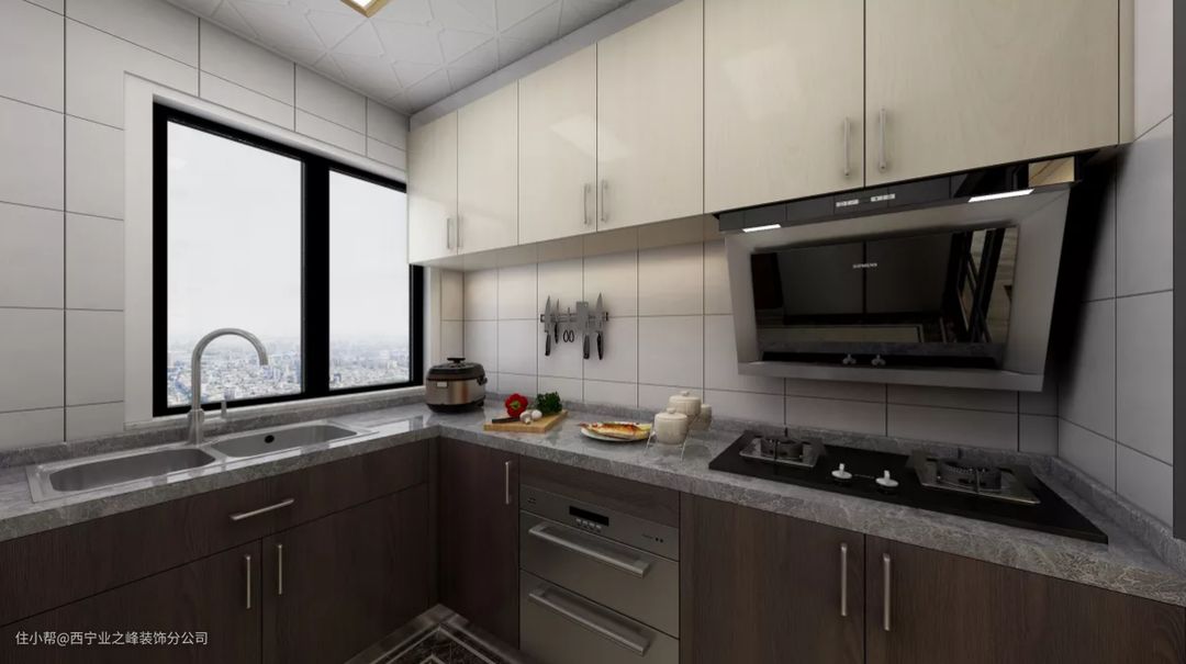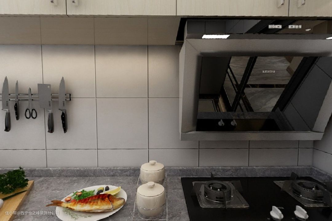 厨房是最需要人性化设计的地方,橱柜抛弃繁琐的外形,整体内敛简约,米色的墙砖和灰色石英石的台面相衬,白色增加空间感,灰色更耐脏,厨房空间稍窄,但是设计动线十分流畅,让做菜成为享受