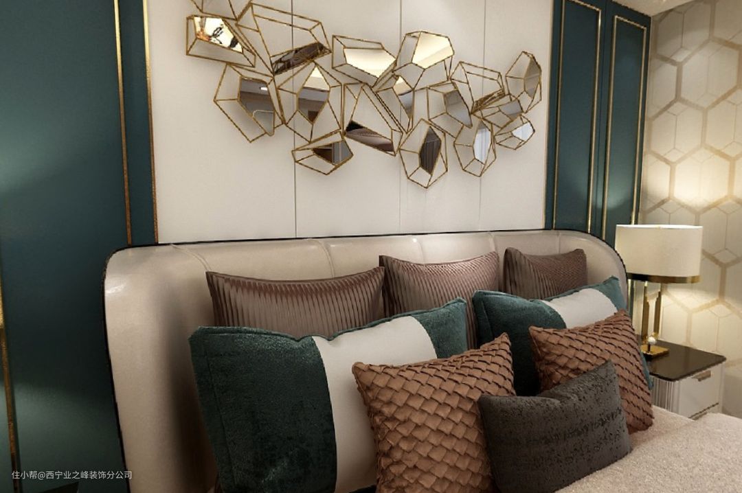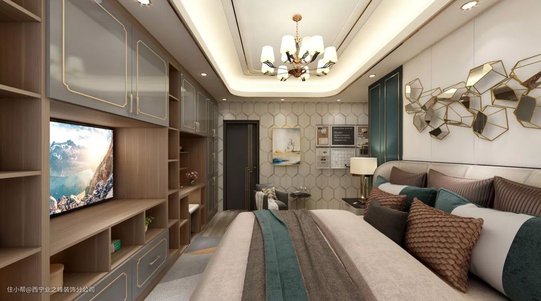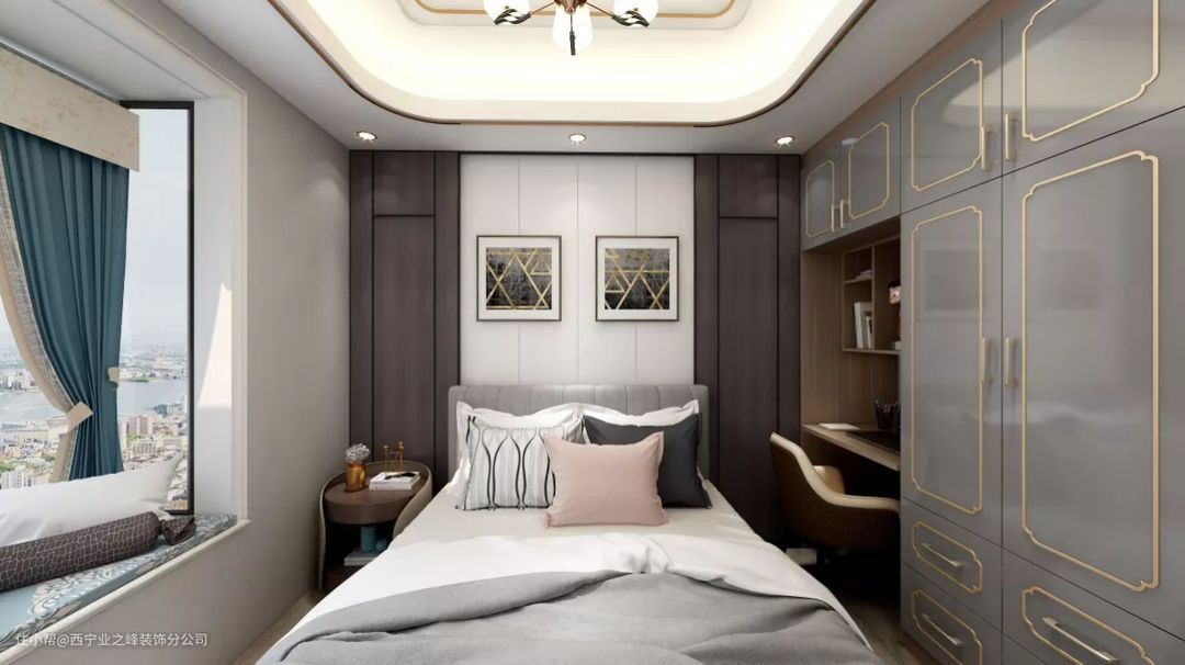 相比于客厅,主卧运用金色与墨绿搭配,色调搭配和谐典雅,窗户做了个榻榻米,收纳空间业务上杠杠的。整体是美感与实用同存,高品质生活一览无余