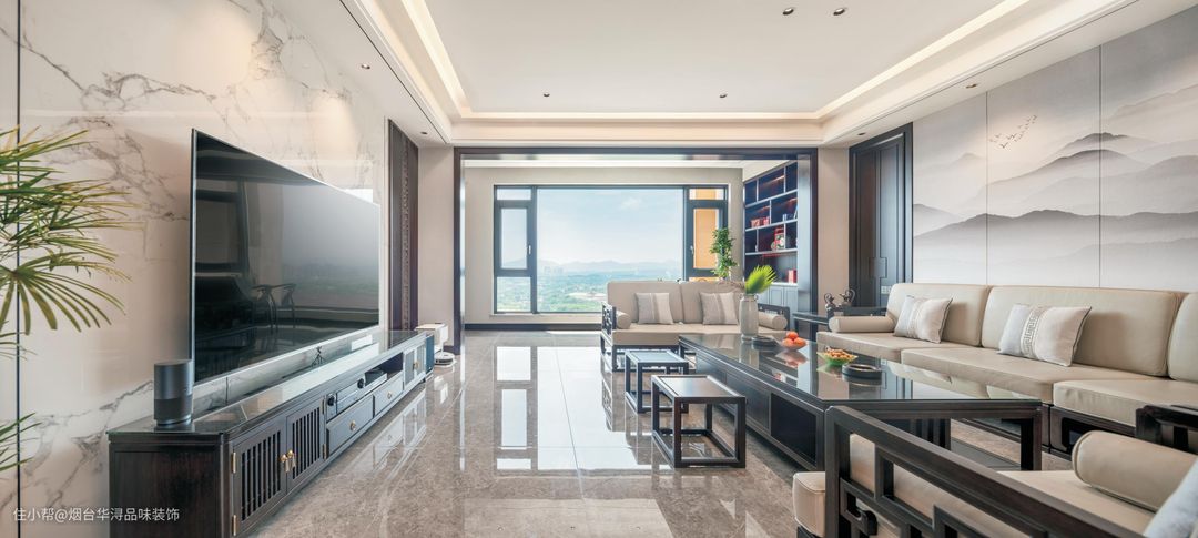 客厅背景墙采用水墨画形式的硬包加以点缀,沙发采用了浅色系的布艺材料,让空间更柔和。
