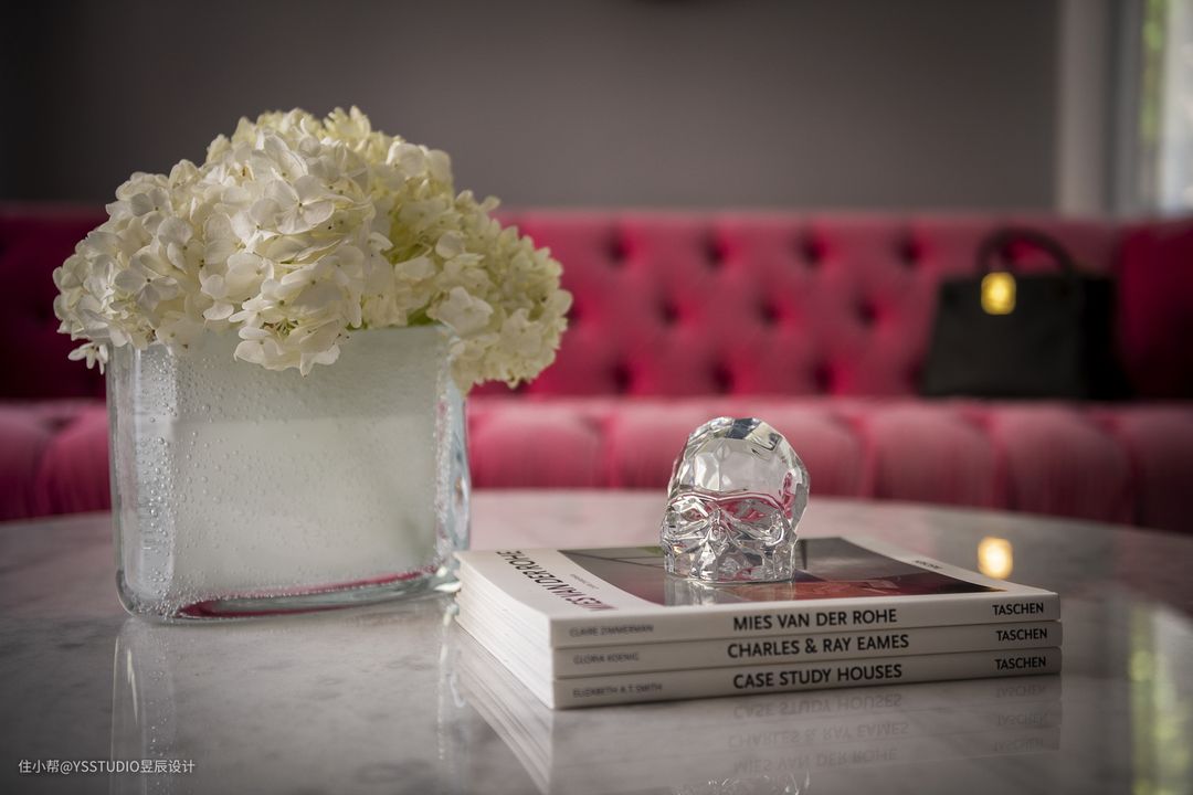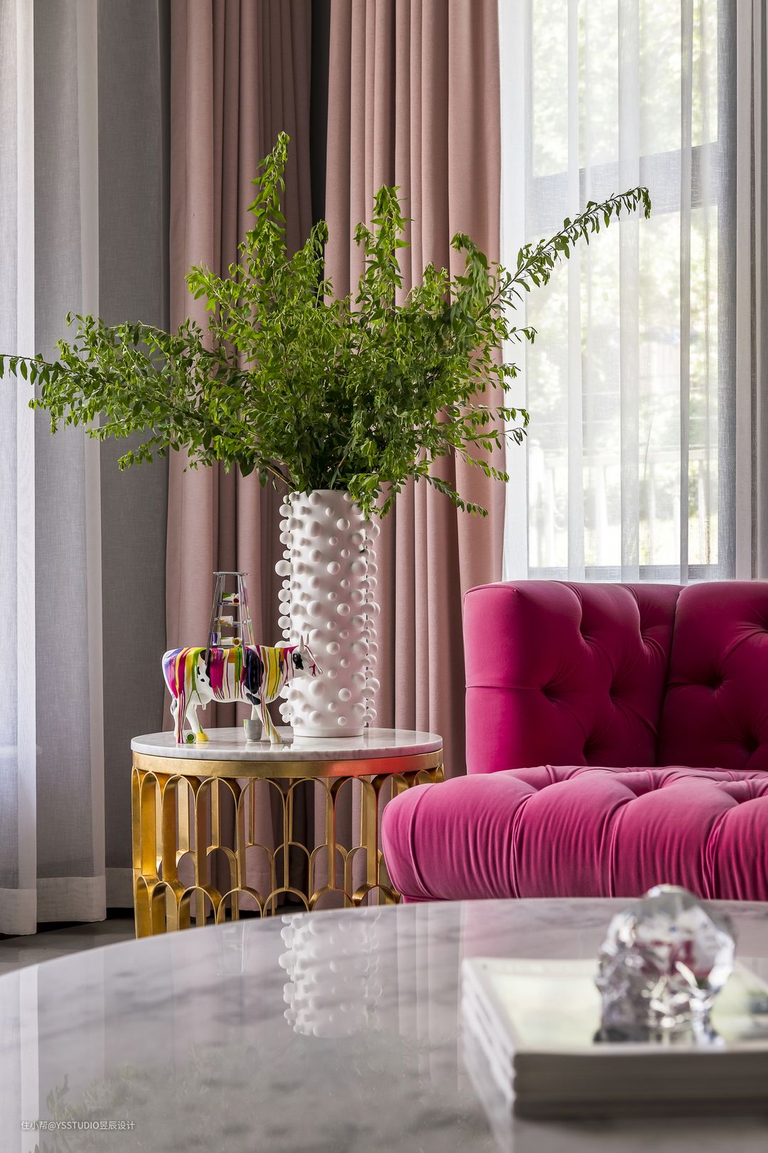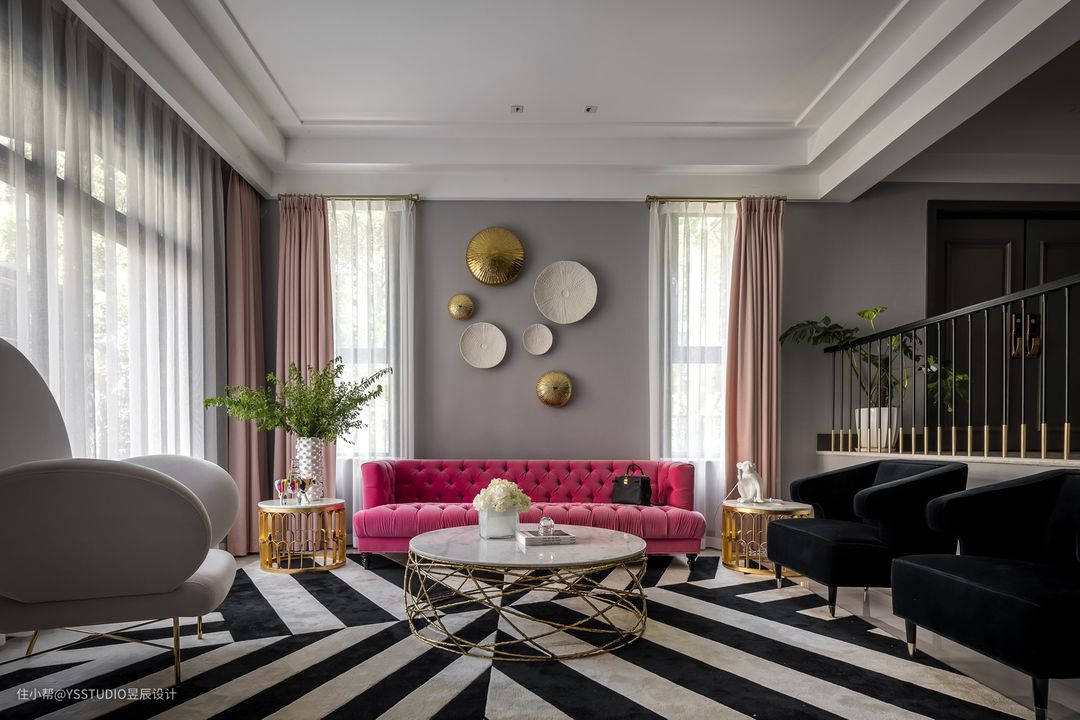 粉色主沙发第一眼就牢牢抓住眼球 玫粉色是属于女性的色彩 金色元素与沙发形成暖调呼应 时尚、温暖又柔和
