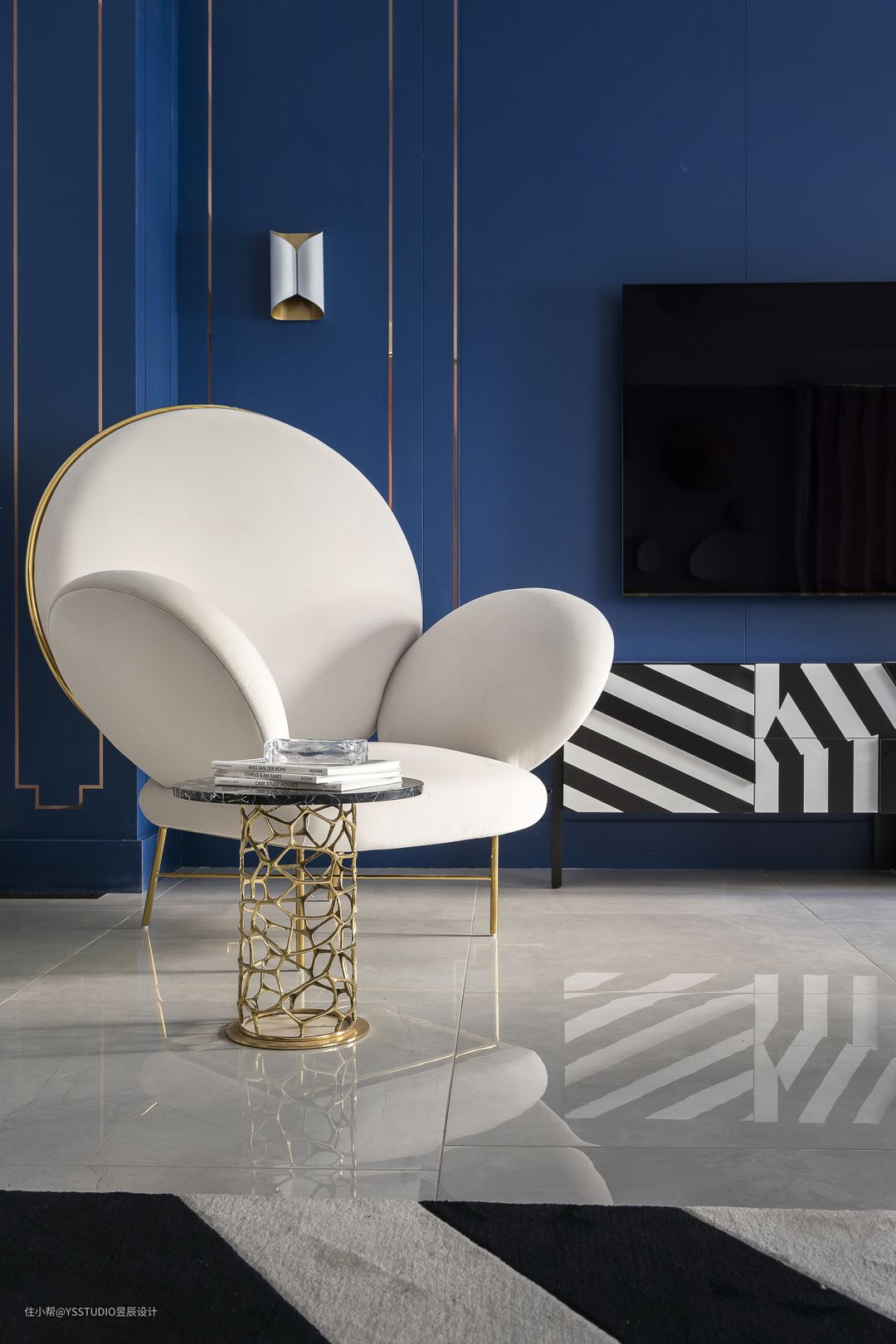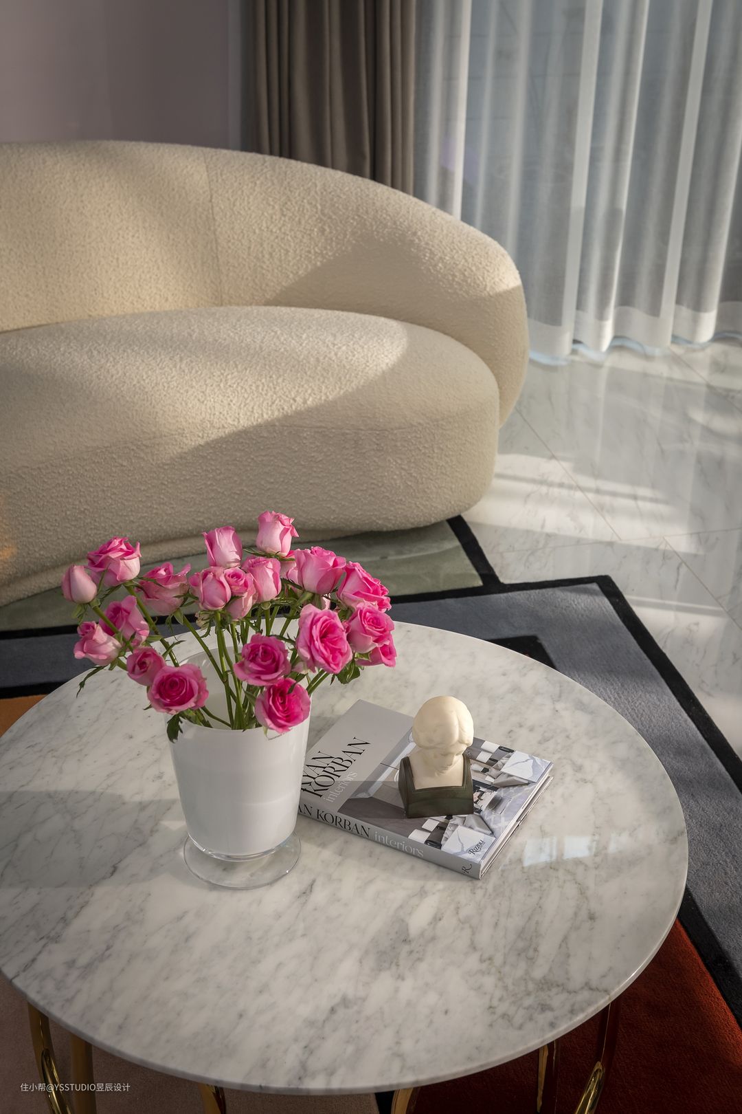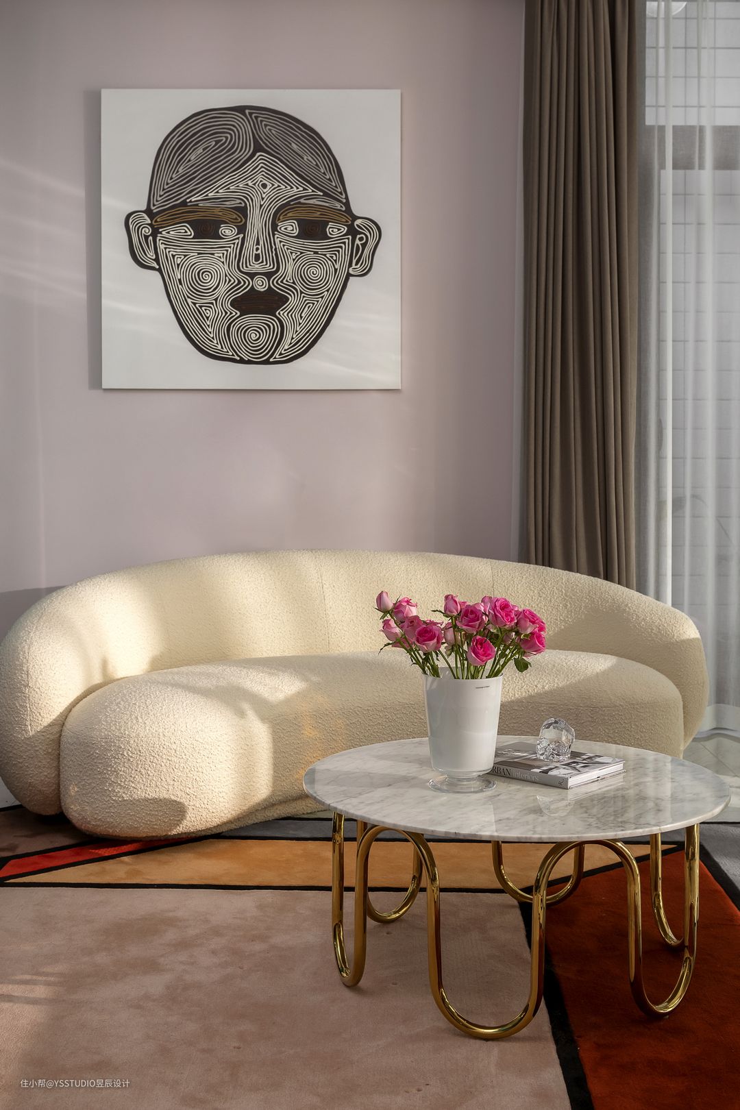 粉色主沙发第一眼就牢牢抓住眼球 玫粉色是属于女性的色彩 金色元素与沙发形成暖调呼应 时尚、温暖又柔和