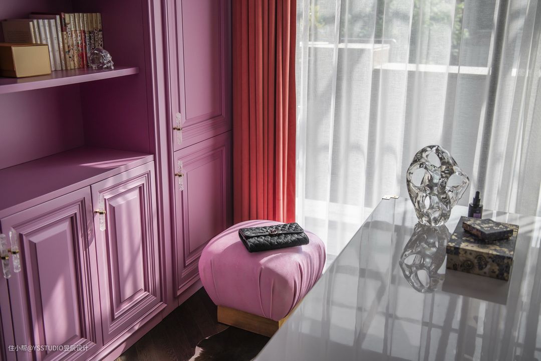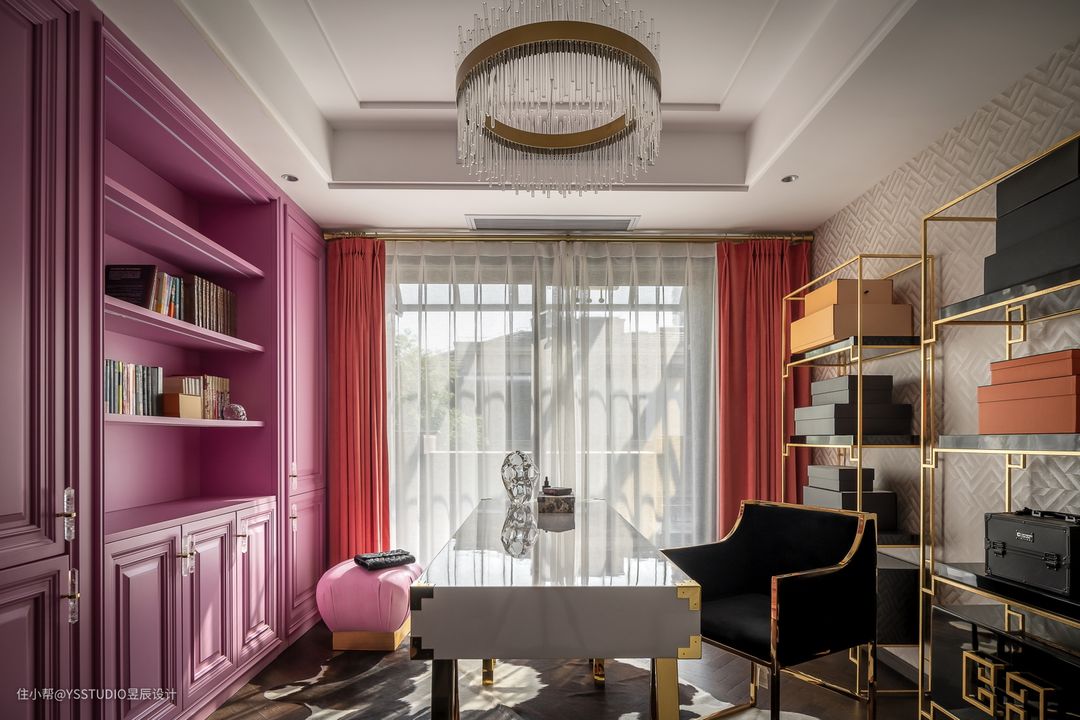 书房同样充满着浪漫的气息 每个女人心中都有一个童话梦 整壁粉色书橱,让整个空间充满梦幻感