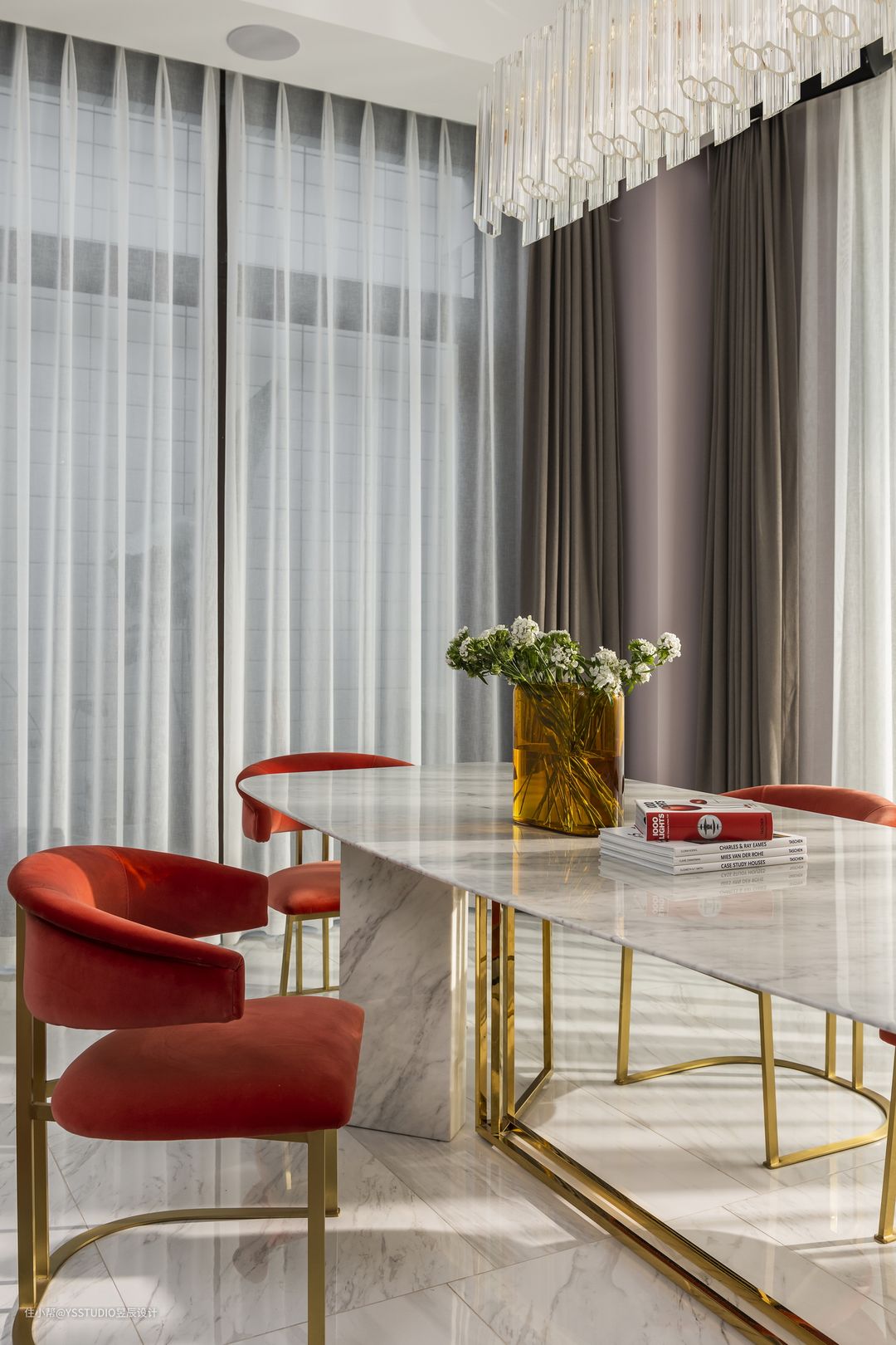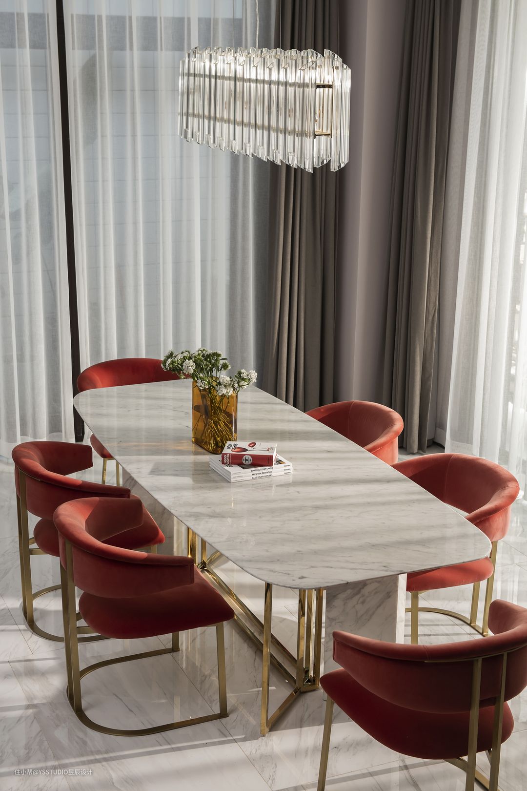 餐厅采用了时下最流行的长条型大理石餐桌 来自意大利的天然石材 搭配暖色餐椅,更刺激食欲 窗纱摇曳,如水线般垂落的水晶灯仿佛也在轻摆