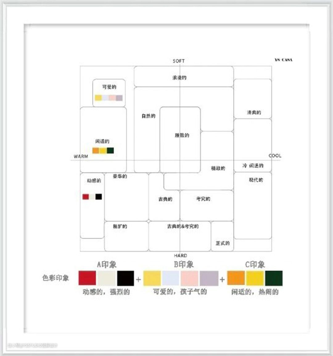 可以看到,业主对于家的氛围充满了有趣生动的向往 色彩印象主要集中在动感、可爱、舒适的区域 因此,我们也开动头脑风暴 为业主搭配出各种她想要的,家的样子