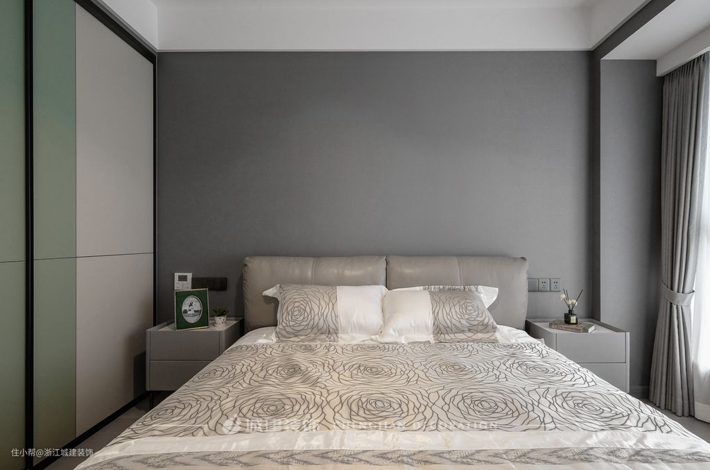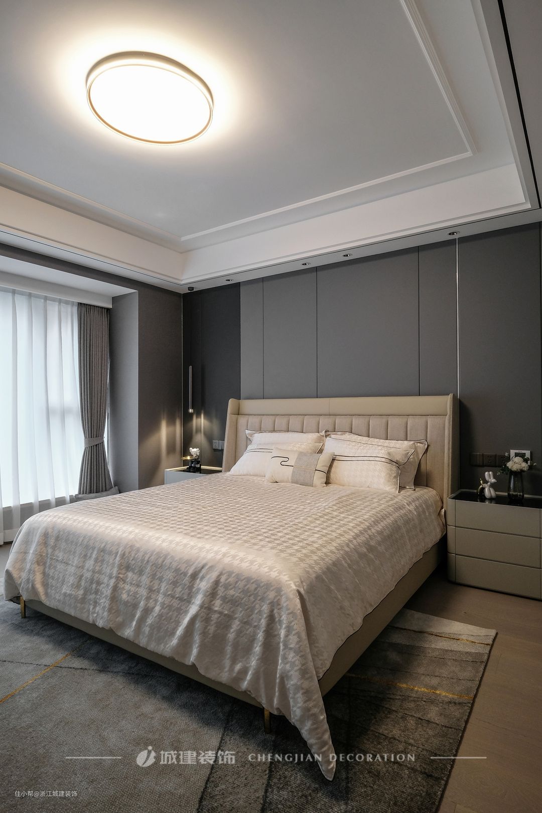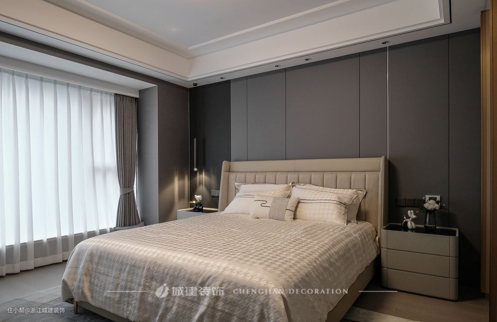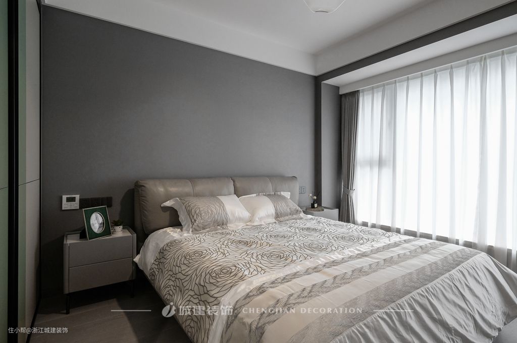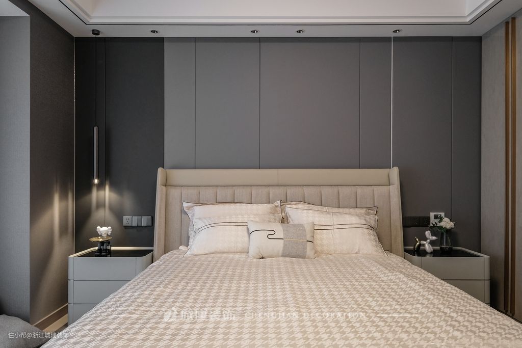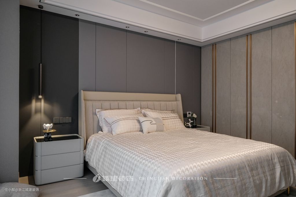 卧室 · The Bedroom 主卧,从墙面到衣柜,是灰色的深浅渐变,空间视觉更有层次;从硬装到软装,都选择极简的线条勾勒,摈弃繁琐,让作为休息的空间更显静谧。