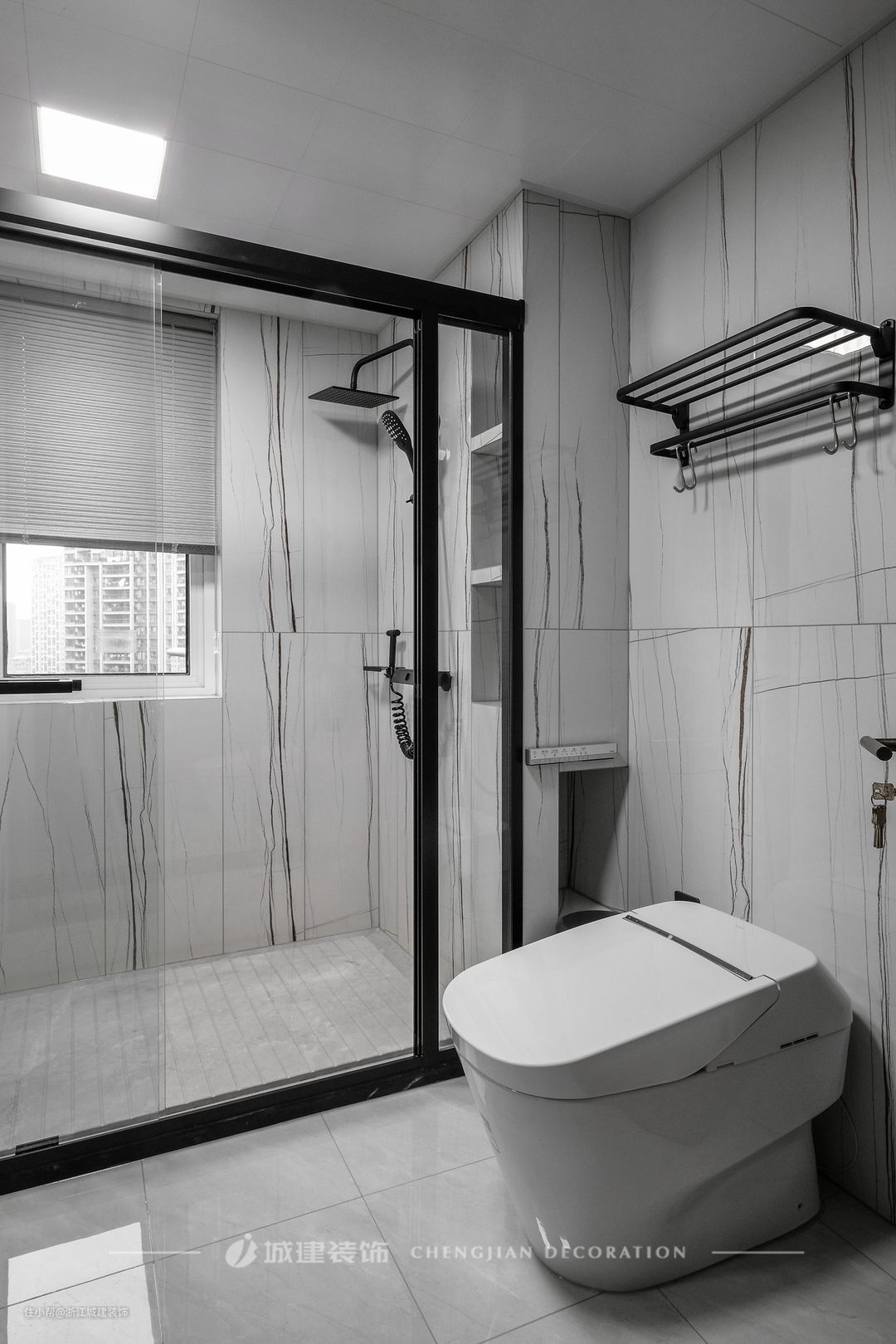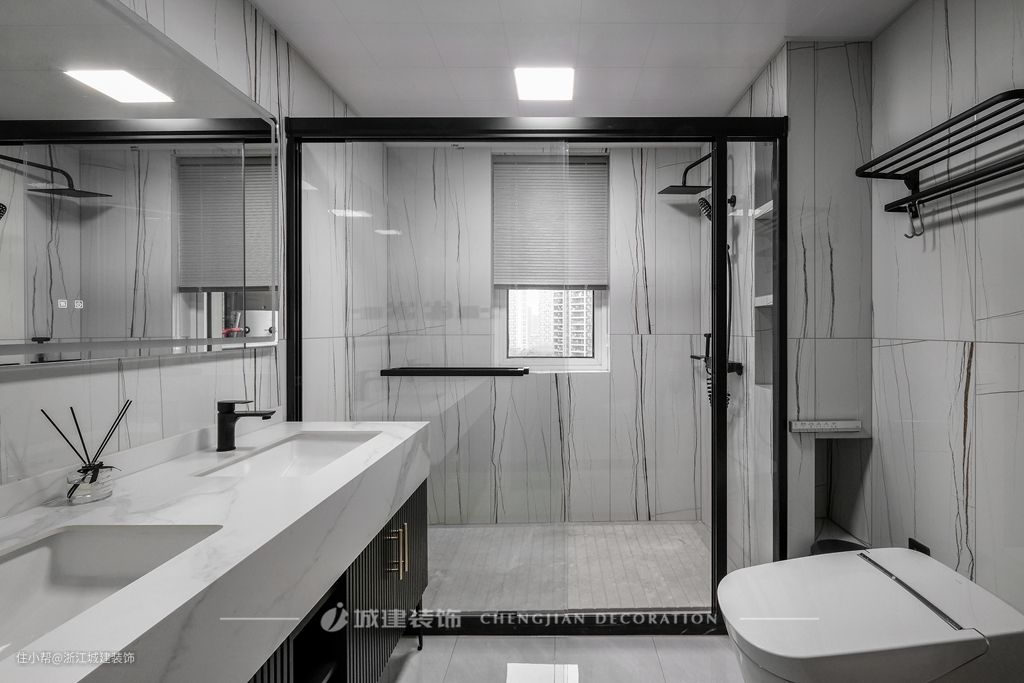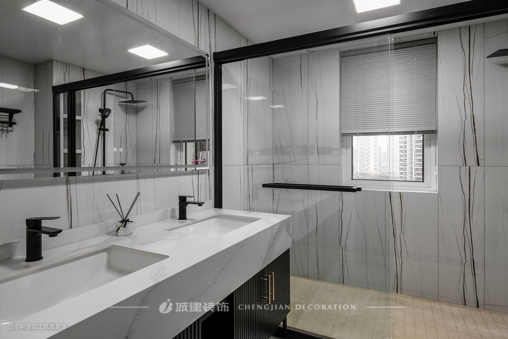 卫生间 · The Bathroom 卫生间以经典的黑白搭配。双台盆设计、超大智能浴室镜,让洗漱成为享受;一字型淋浴房十分宽适,舒缓的水流,洗去一天的疲惫。