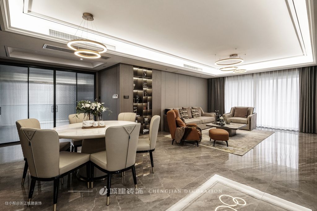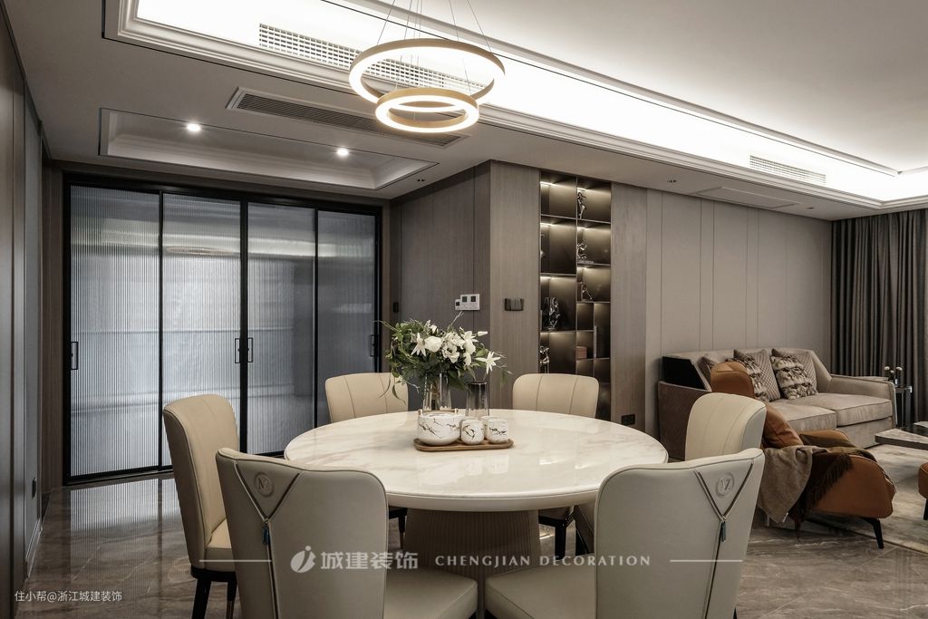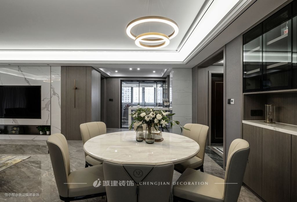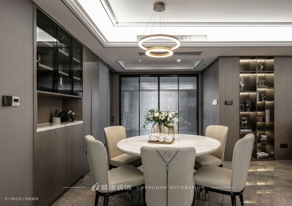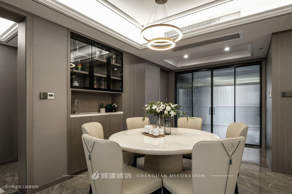 餐厅 · Dining Room 米白色皮质餐椅+白色大理石餐桌,轻奢格调的餐厅里,家人围坐,享受美食,温馨十足;长虹玻璃移门的运用,让南边阳台的光线渗透进来,餐厅空间视觉“呼吸感”更轻盈。