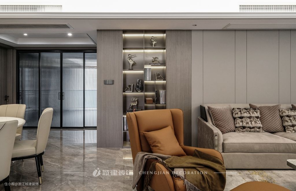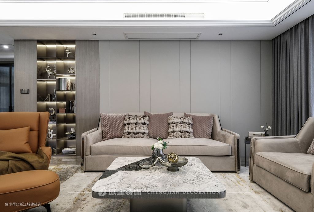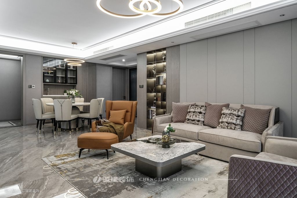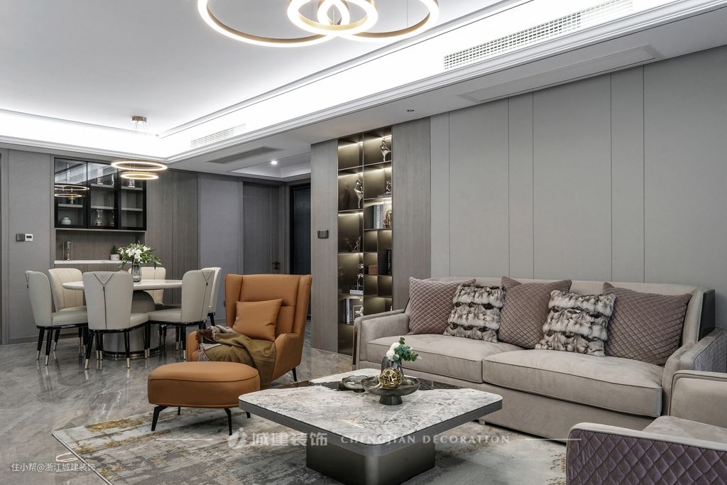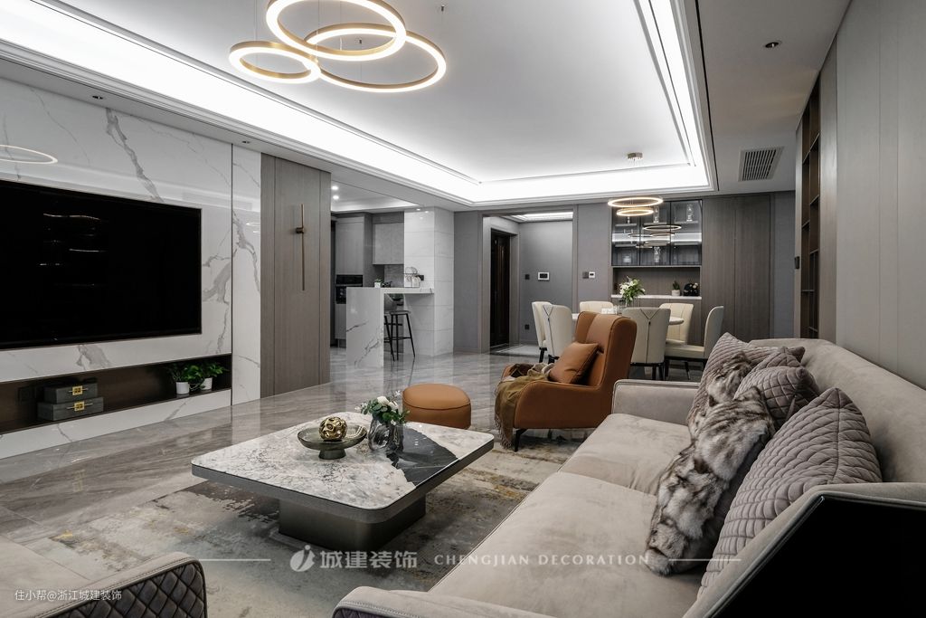 客厅 · Living Room 空间整体以灰色为基调,灰色的墙布、灰色的硬包、泛着柔润光泽的木饰面...克制而平和的氛围空间里,亮面石材与金属等元素的相映,让低调的轻奢质感不经意流淌,传递出温暖有品质的生活气息。