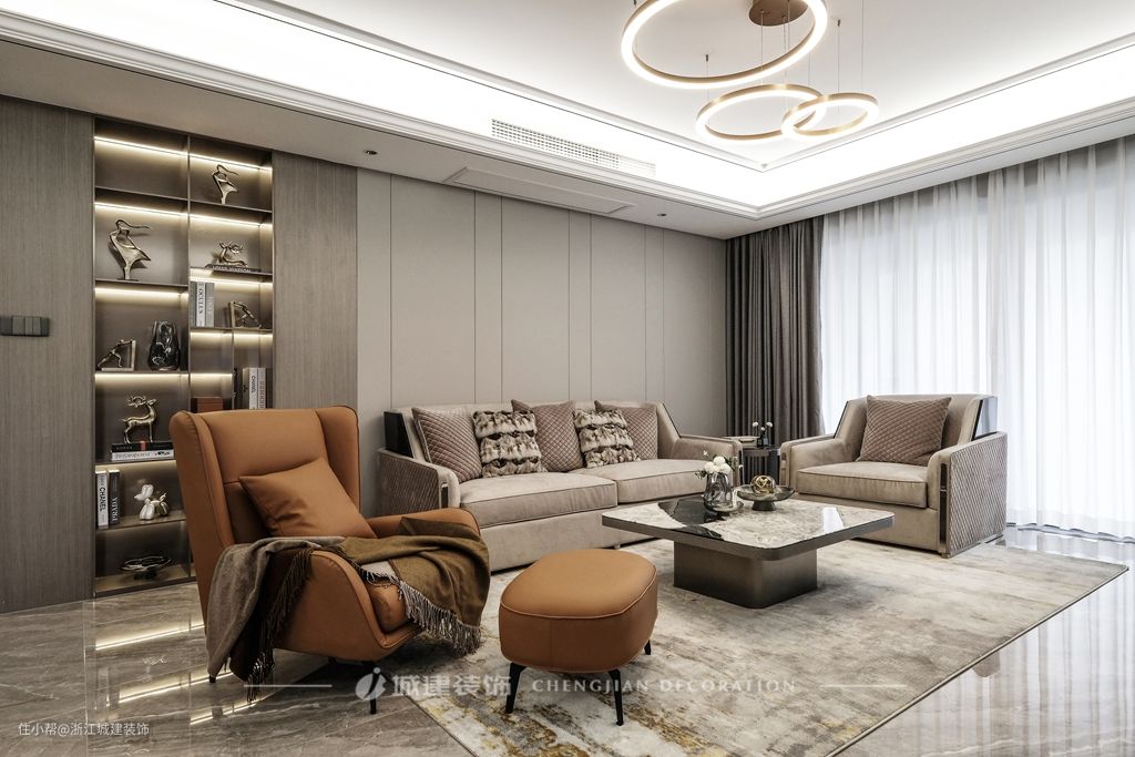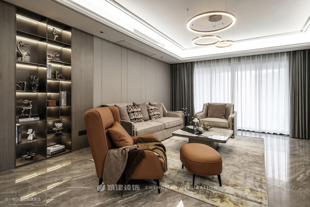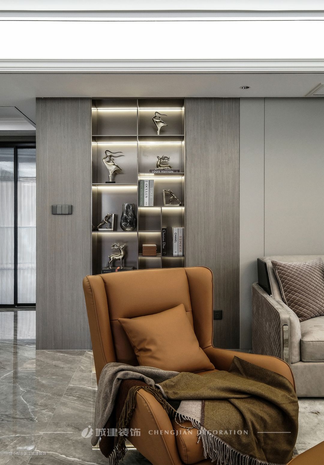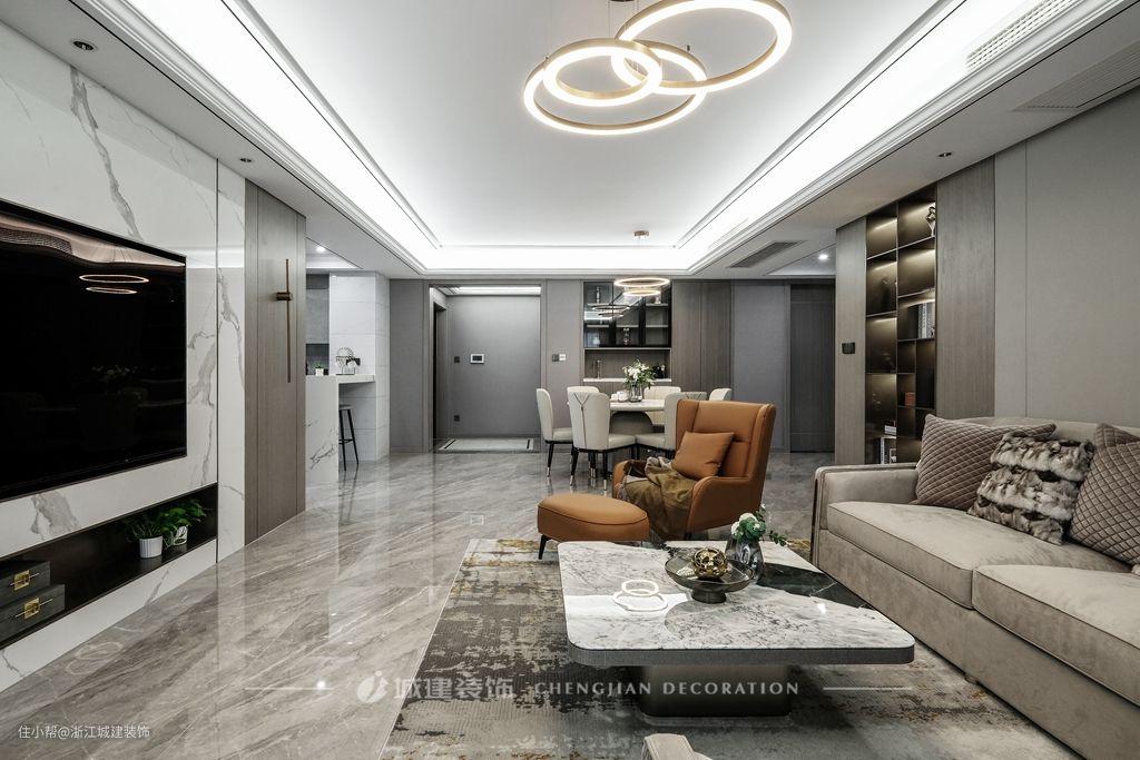 客厅 · Living Room 空间整体以灰色为基调,灰色的墙布、灰色的硬包、泛着柔润光泽的木饰面...克制而平和的氛围空间里,亮面石材与金属等元素的相映,让低调的轻奢质感不经意流淌,传递出温暖有品质的生活气息。
