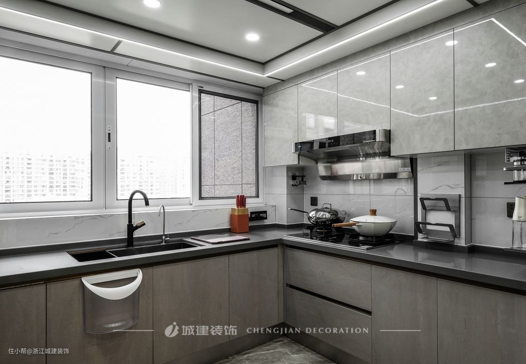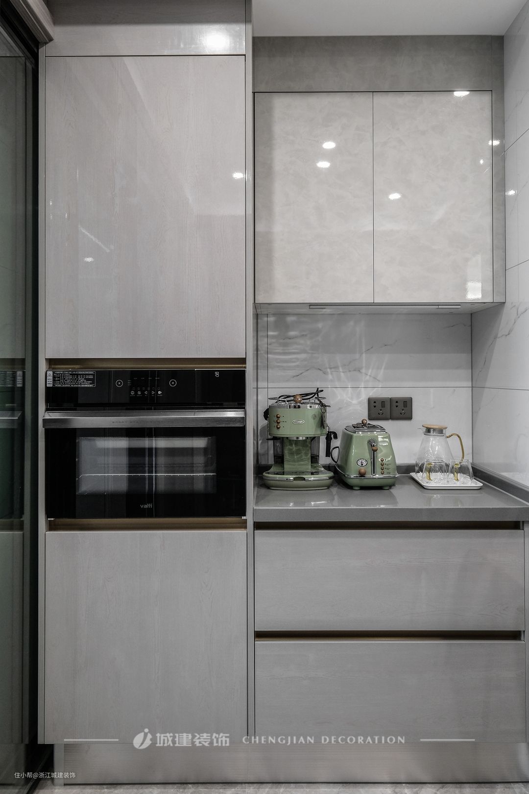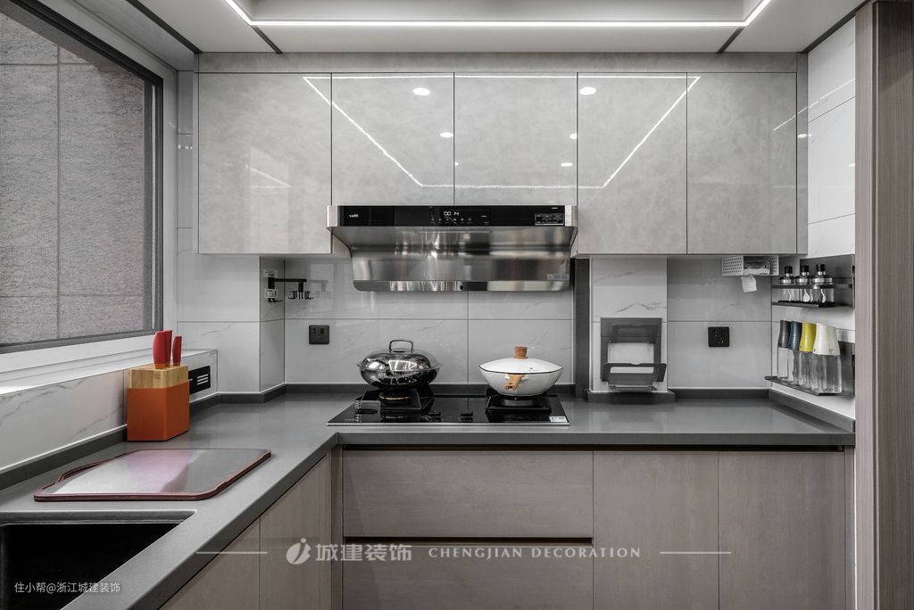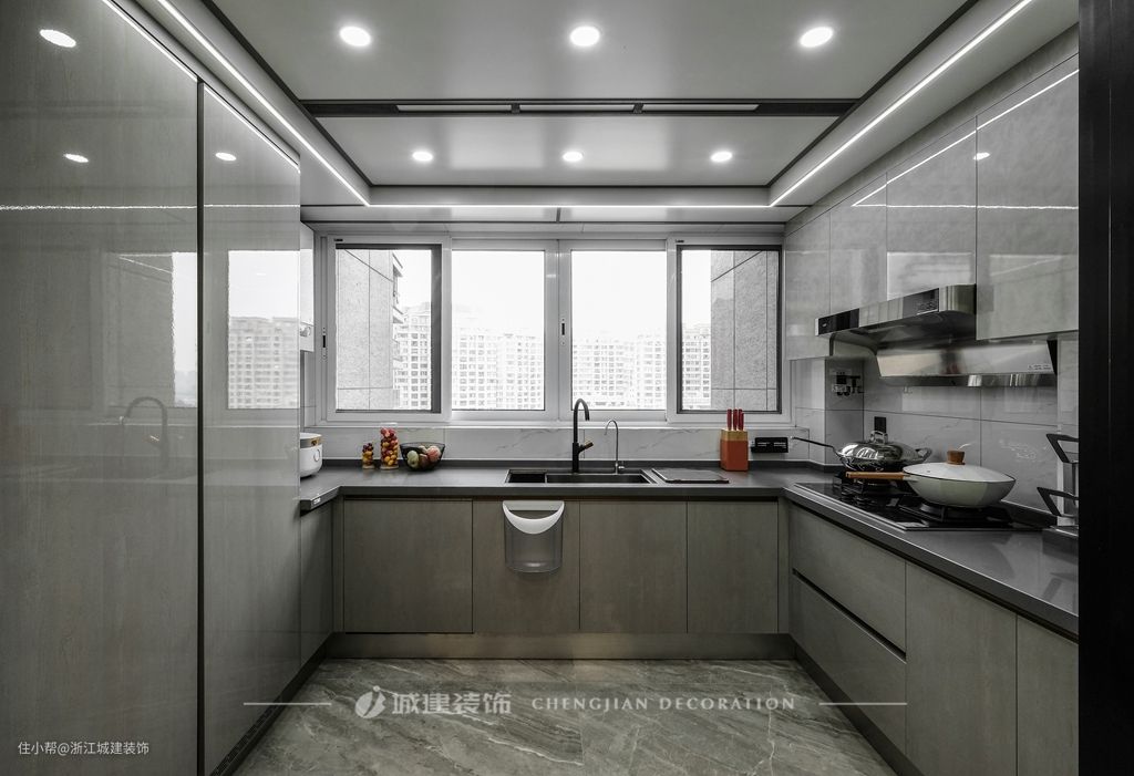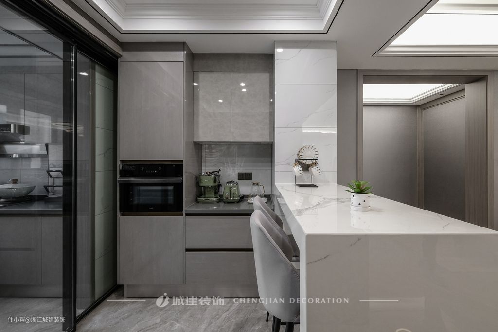 厨房的玻璃移门,补充了西厨区光线的不足。u字形厨柜,满足了日常烹饪操作空间,亮面的灰色,雅致有格调,嵌入式冰箱让空间更统一。