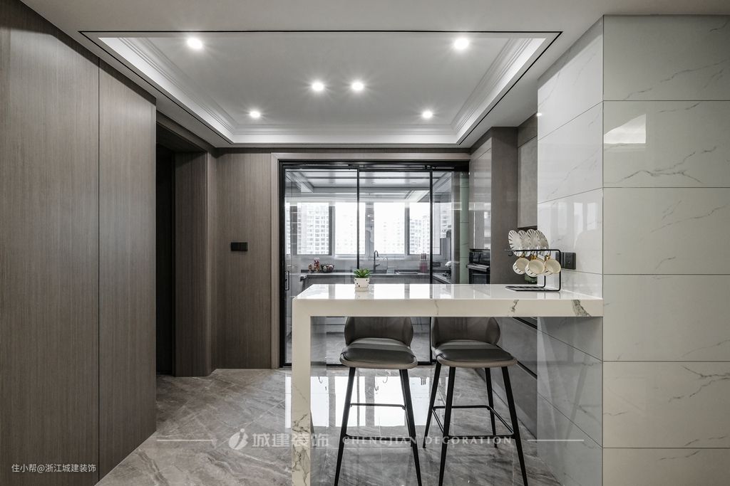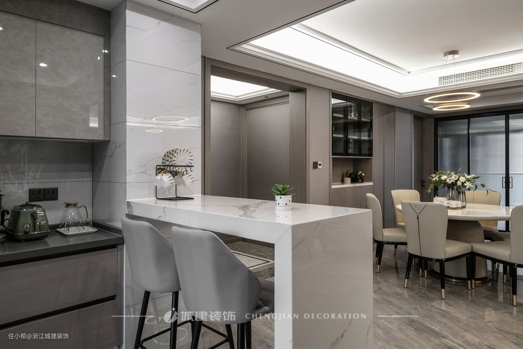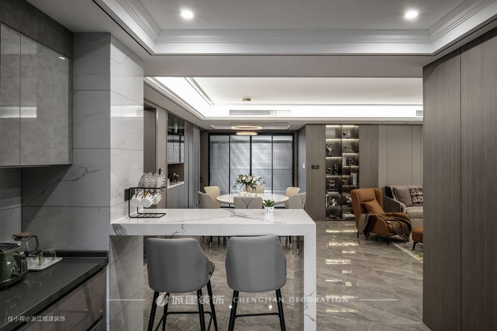 开放式西厨区,白色台面吧台与白色墙砖既是空间之间的区隔过渡,也是与客餐厅元素的相互呼应,让整体空间更有层次更和谐。