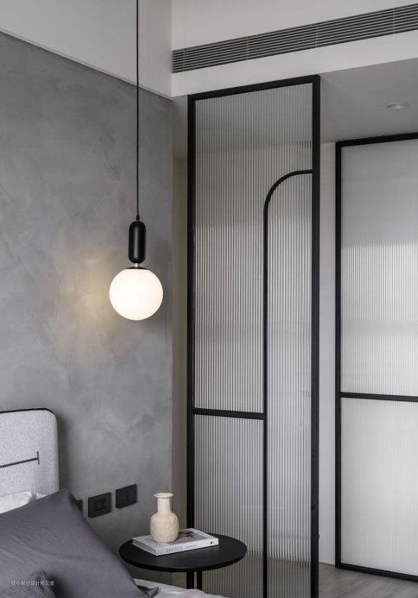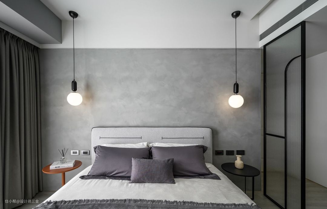 卧室的设计追求是功能与形式的统一,床头背景墙是微水泥,在形式上形成了联系,软装搭配也是同色系的极简又耐看~