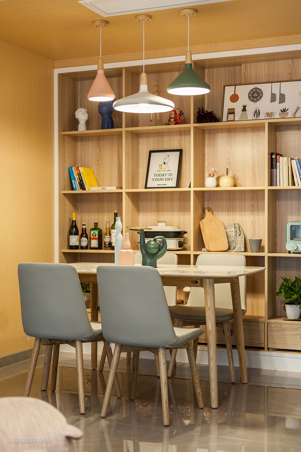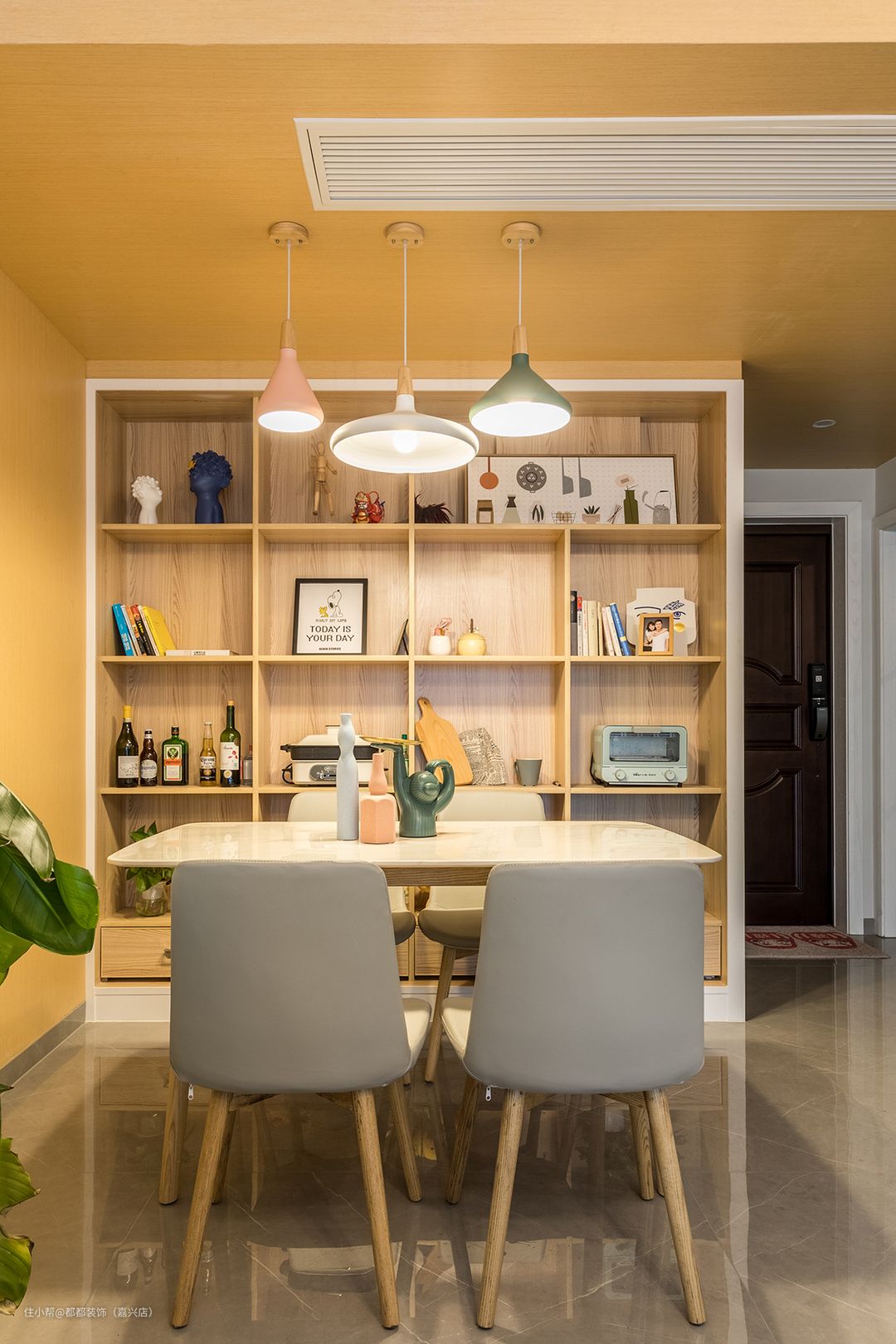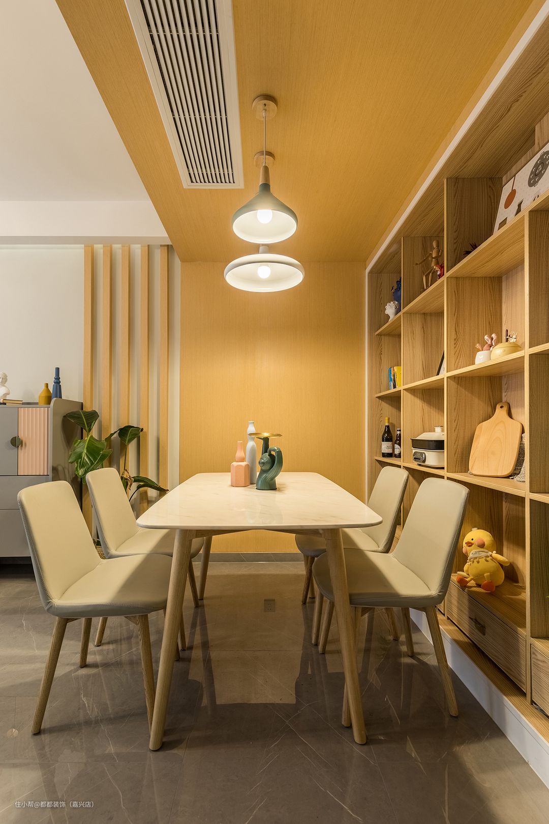 餐厅与客厅相接,整个空间都是开放式布局,以暖黄色为主色调,与客厅视觉效果起明显对比,冷与暖,在效果上不但不冲突,却非常舒适。营造就餐时温馨的氛围,木质格柜可以更好地收纳小样物品,皮质餐桌椅色调柔和干净。#晒晒你家的餐厅