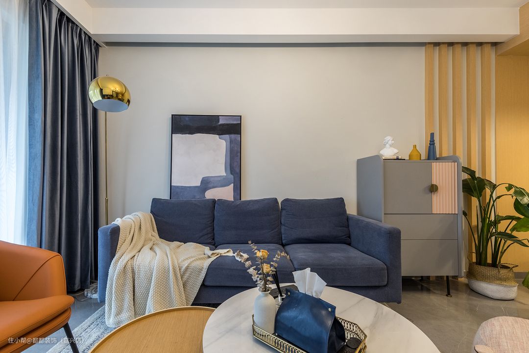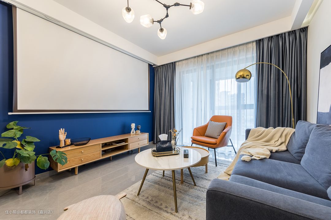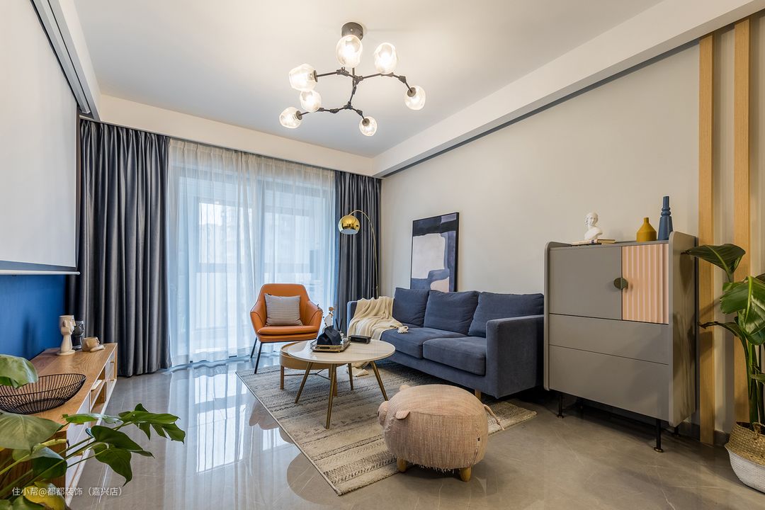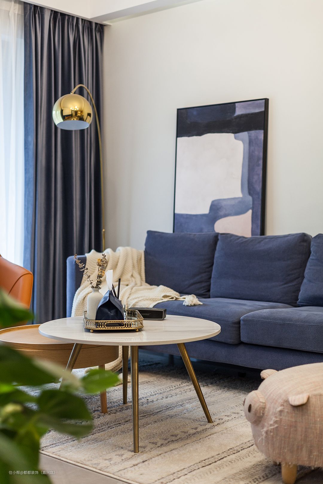 本案空间小巧且精致,海蓝色为主色的北欧风客厅,清新明朗。布艺沙发与艺术色块油画相呼应,大大的落地窗增加了空间明亮度,金属质感的灯具和橙黄色皮质单人沙发,亮眼又活跃,北欧风家里不能少的就是充满生机的绿植。#客厅装修,你更喜欢哪种风格?