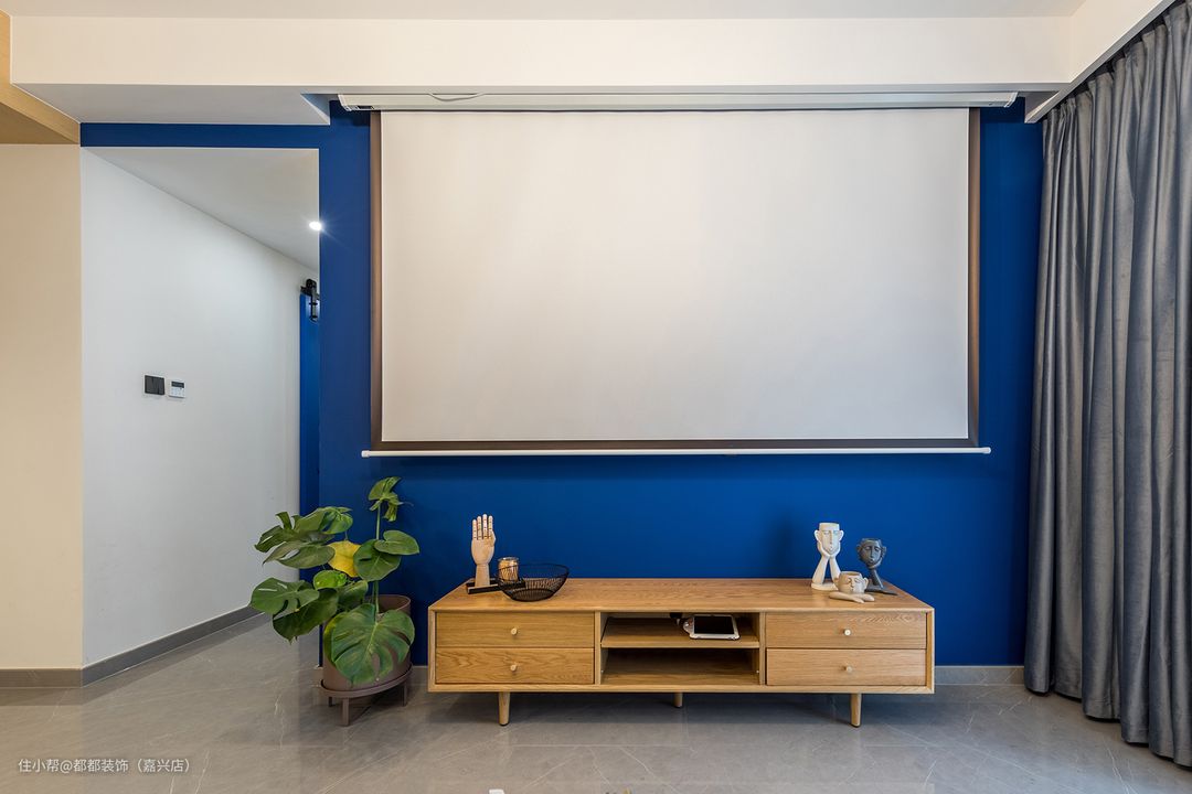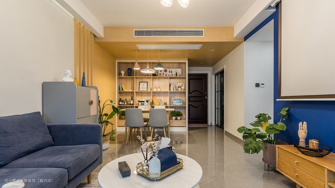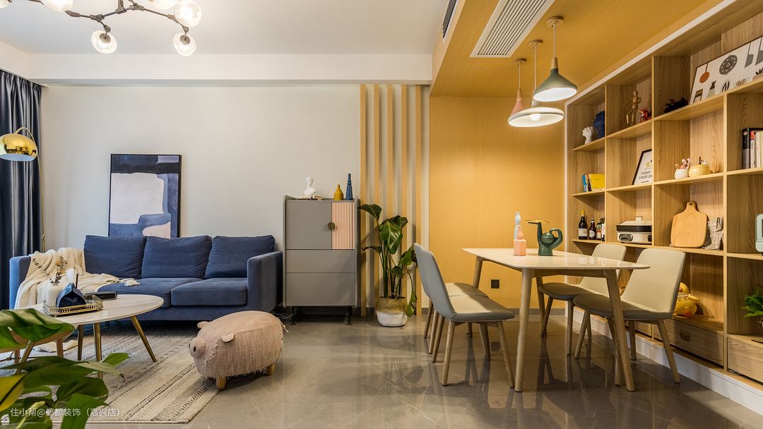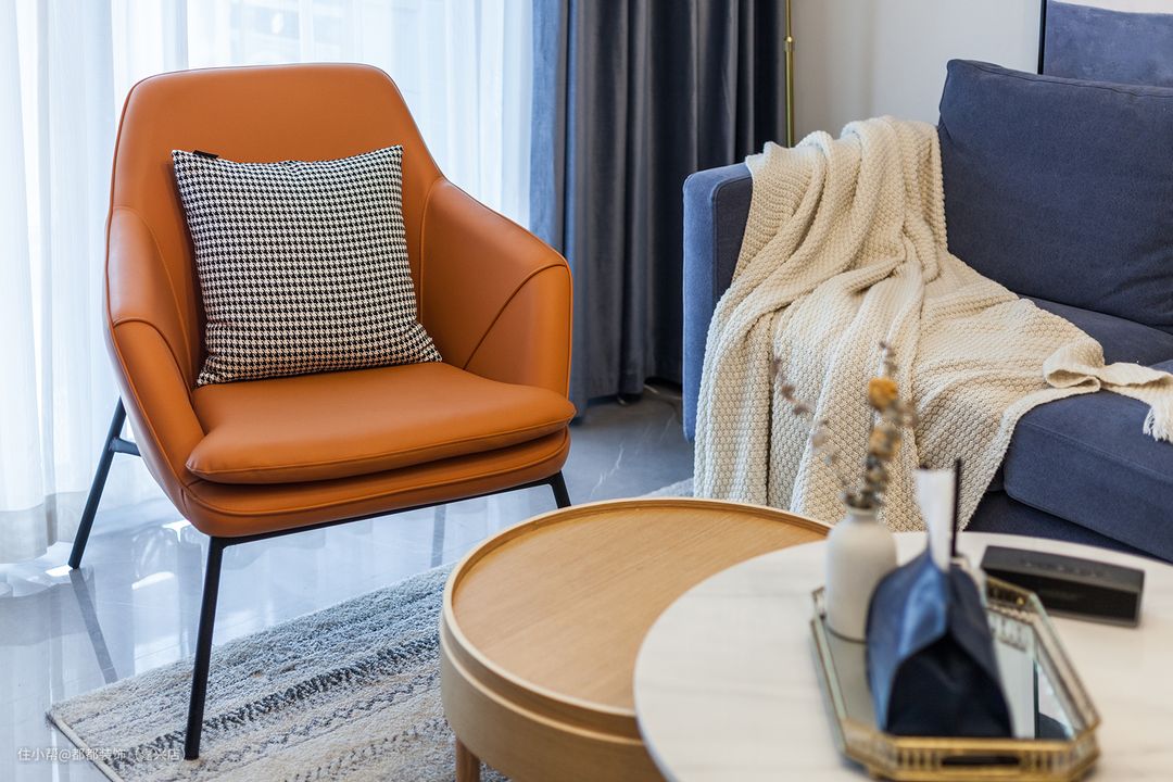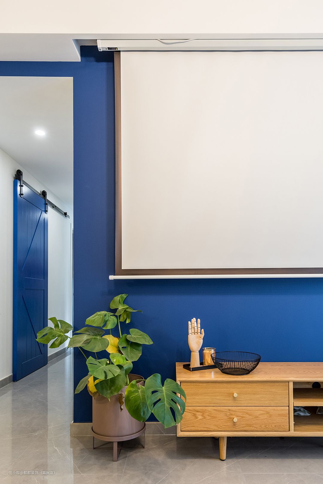 本案空间小巧且精致,海蓝色为主色的北欧风客厅,清新明朗。布艺沙发与艺术色块油画相呼应,大大的落地窗增加了空间明亮度,金属质感的灯具和橙黄色皮质单人沙发,亮眼又活跃,北欧风家里不能少的就是充满生机的绿植。#客厅装修,你更喜欢哪种风格?
