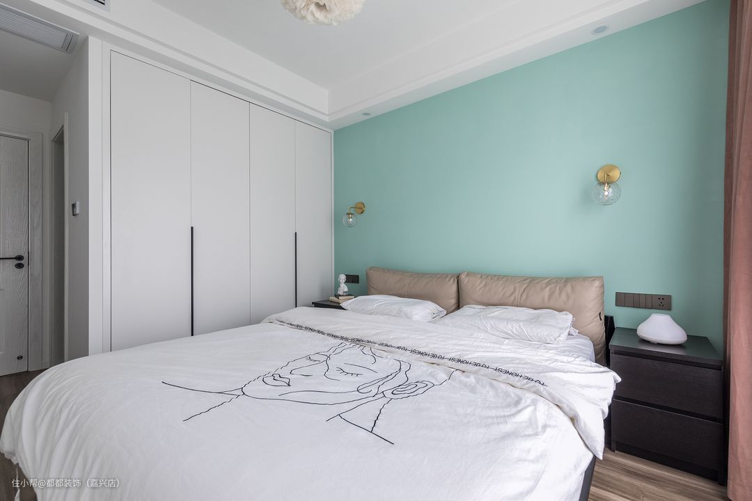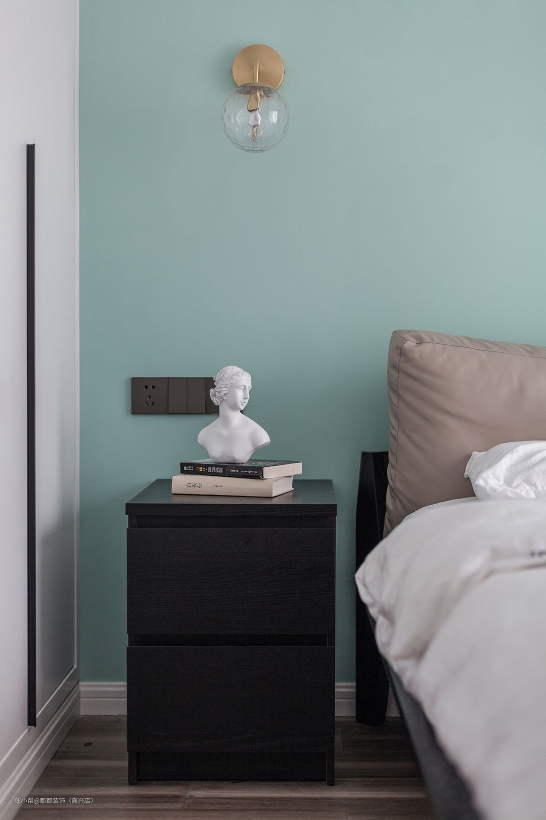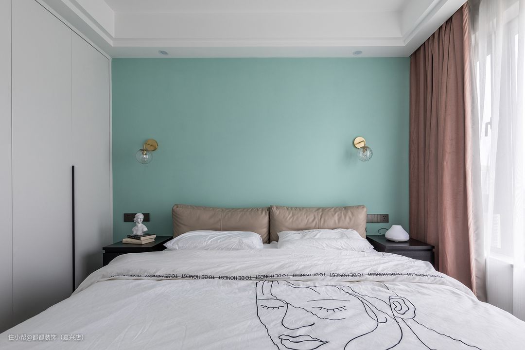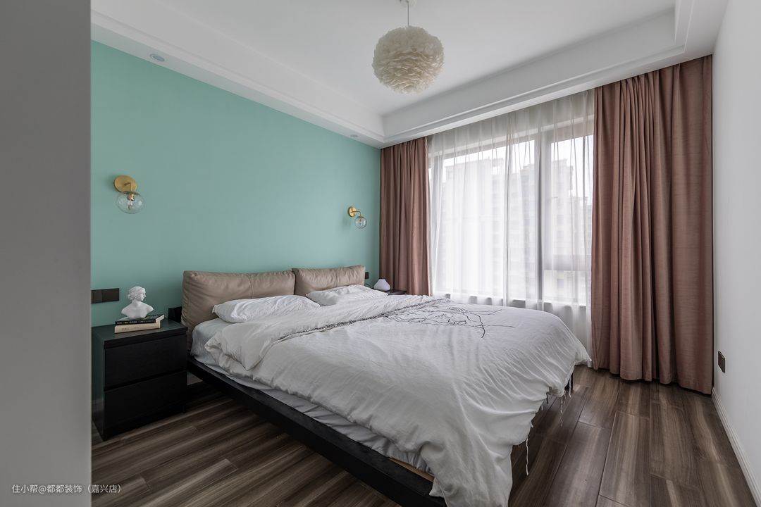 卧室以舒适为主,薄荷绿的墙面搭配豆沙色的窗帘,清新灵动,大大的窗户使房间通透明亮,暗色系木质地板沉稳简约。#怎么提升房间颜值
