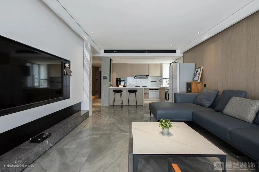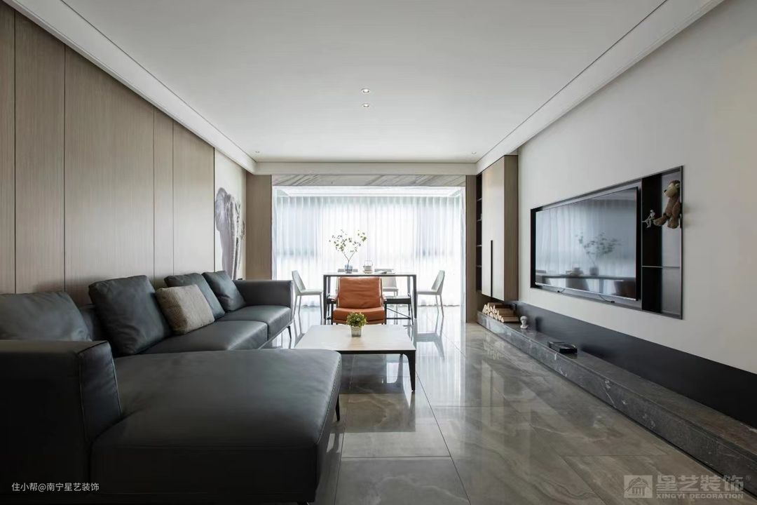 全屋做瓷砖通铺使整体更具空间感,电视机不做背景墙,而是选择将电视机隐藏至墙中,墙面整齐如一没有任何突兀感。