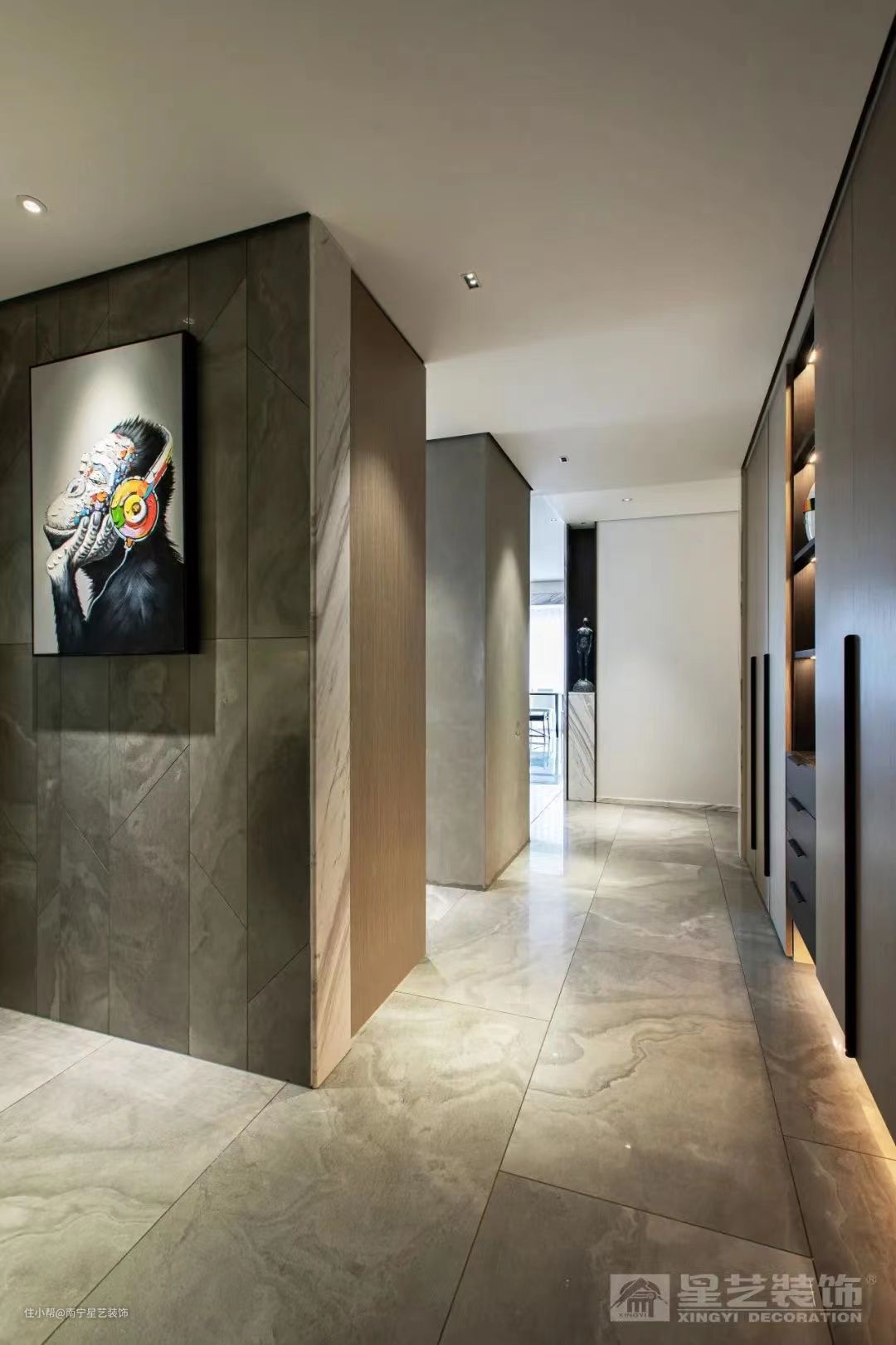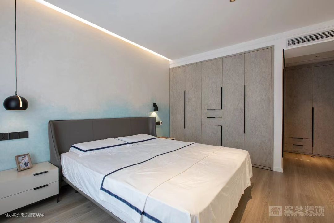 墙面采用灰色水泥漆,柔和灰调与原木色之间的互动;天花隐藏的灯带、壁灯和吊灯都为暖色系,无主灯的灯光氛围更让人放松,营造出温馨的睡眠空间;衣柜门做隐藏设计,整体简约自认一体