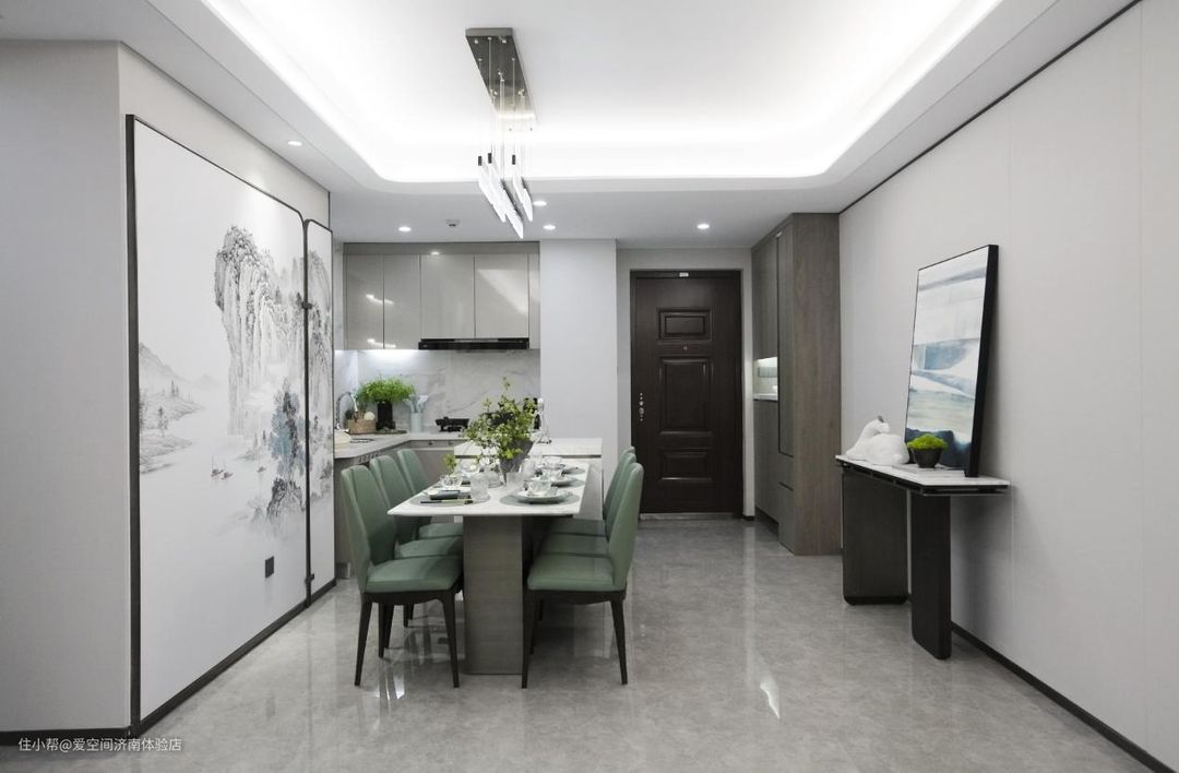 开放式的家居设计让空间更显宽敞明亮。进门玄关打造到顶鞋柜,进来就是家里的餐厅位置,方形岩板餐桌搭配浅绿色餐椅,营造出自然舒适,温馨和谐的用餐环境,一家人围坐用餐,其乐融融。