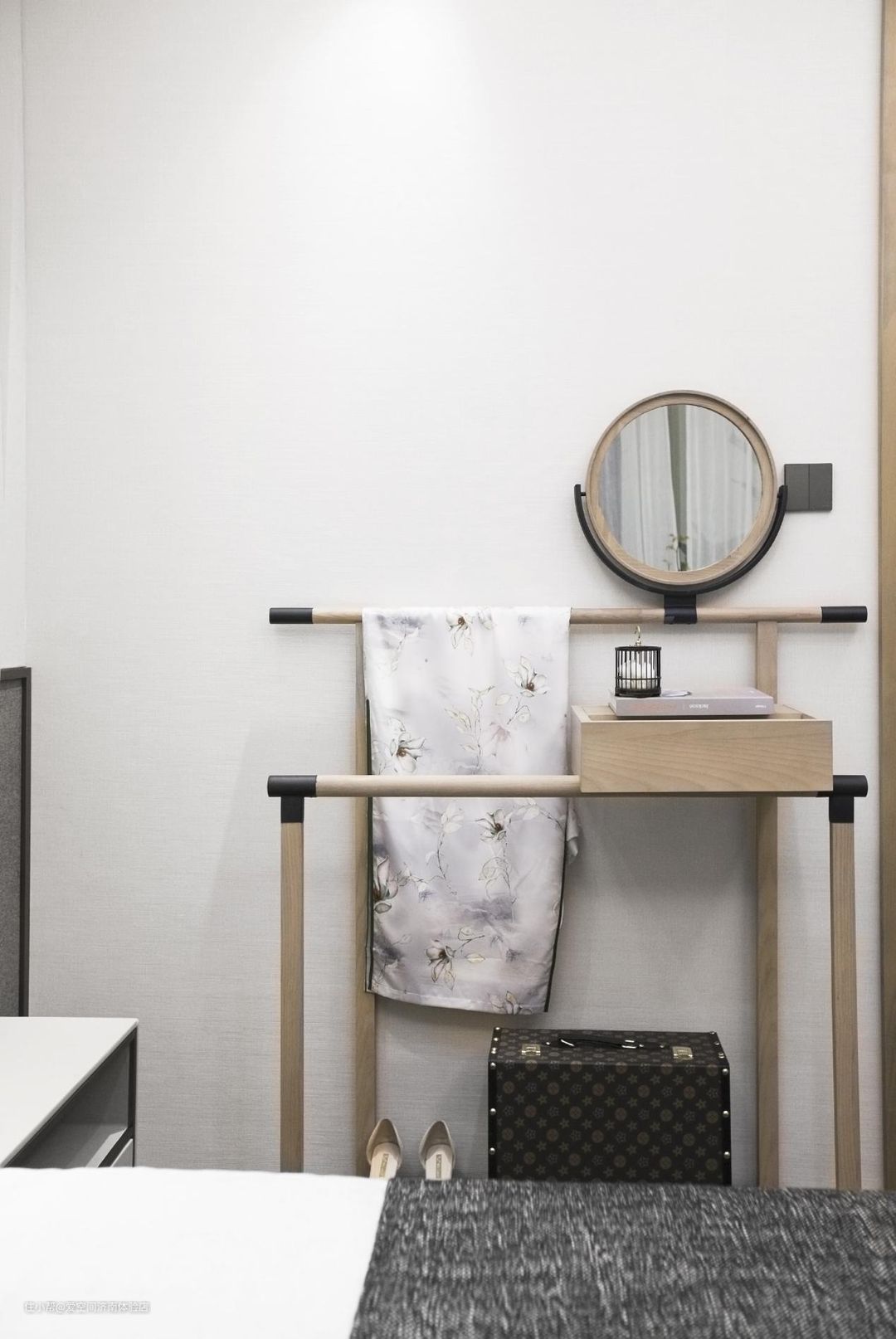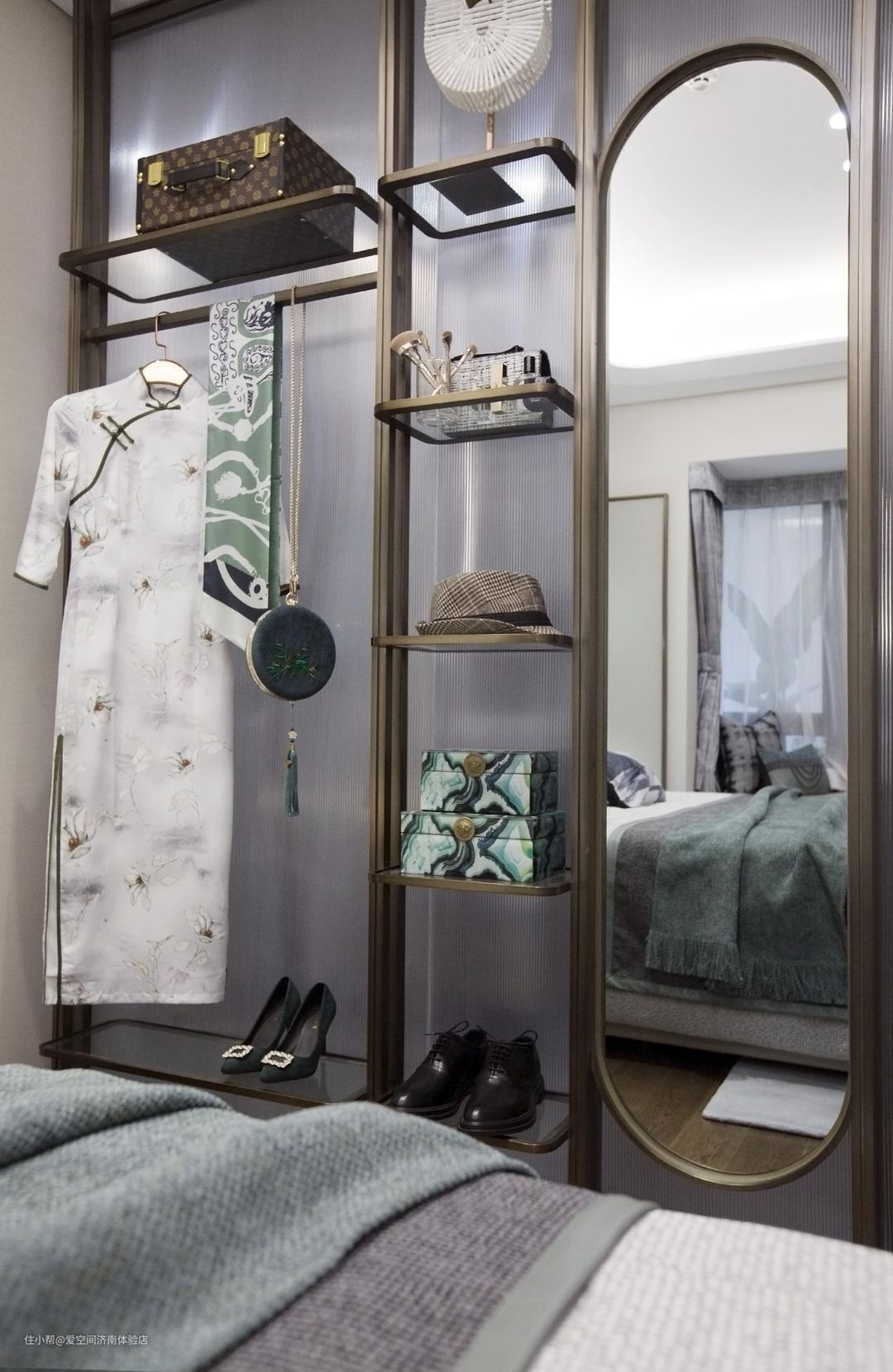 开放式的衣帽间以古风形式呈现在眼前,给人的感觉是十分华贵与端庄的。全身镜也方便日常仪容的整理,方便实用的同时也能凸显中式独有的高级气质。