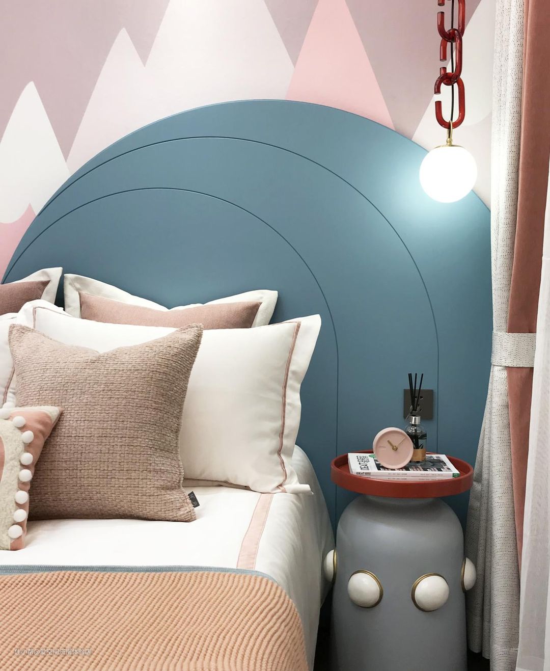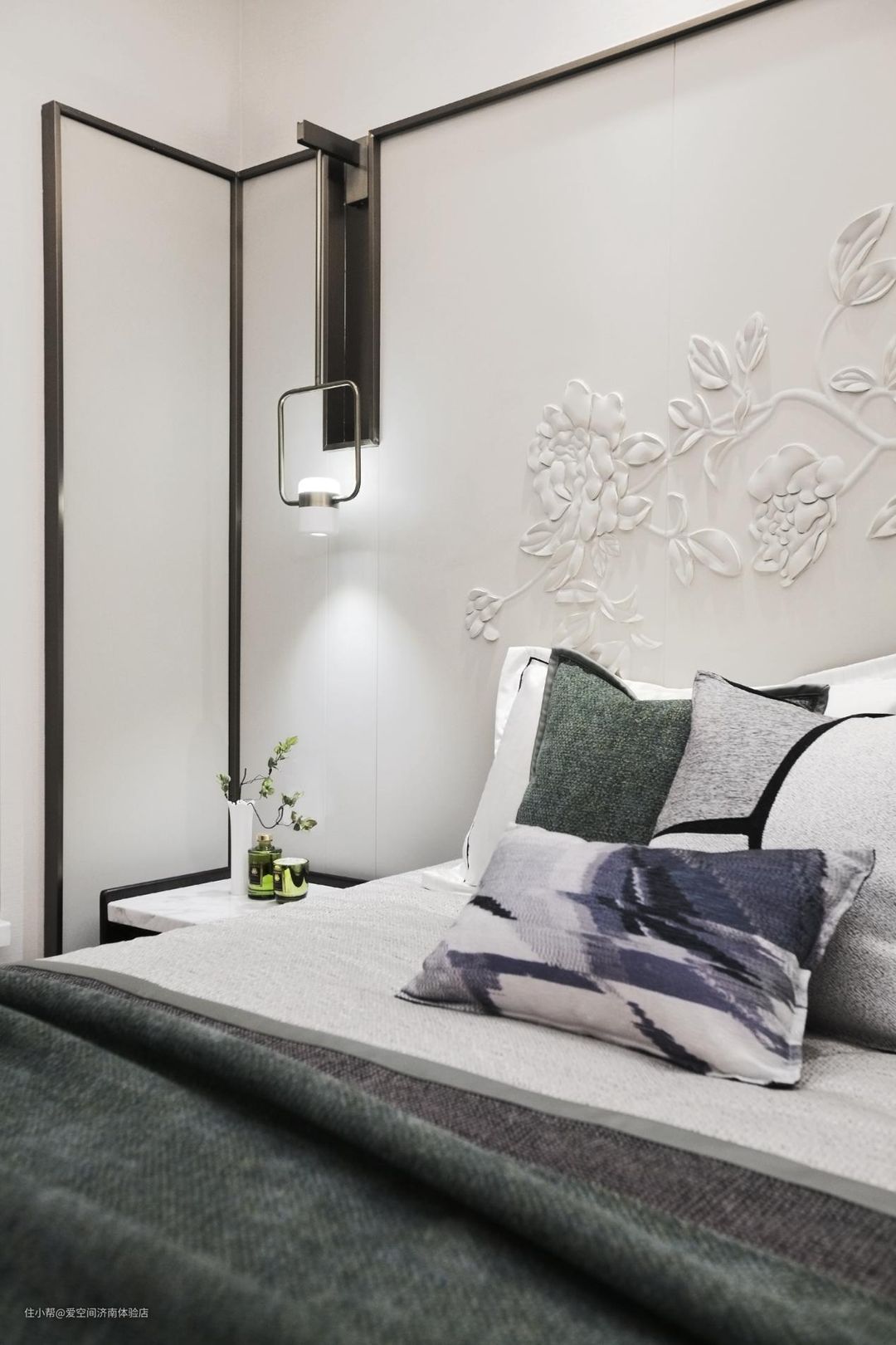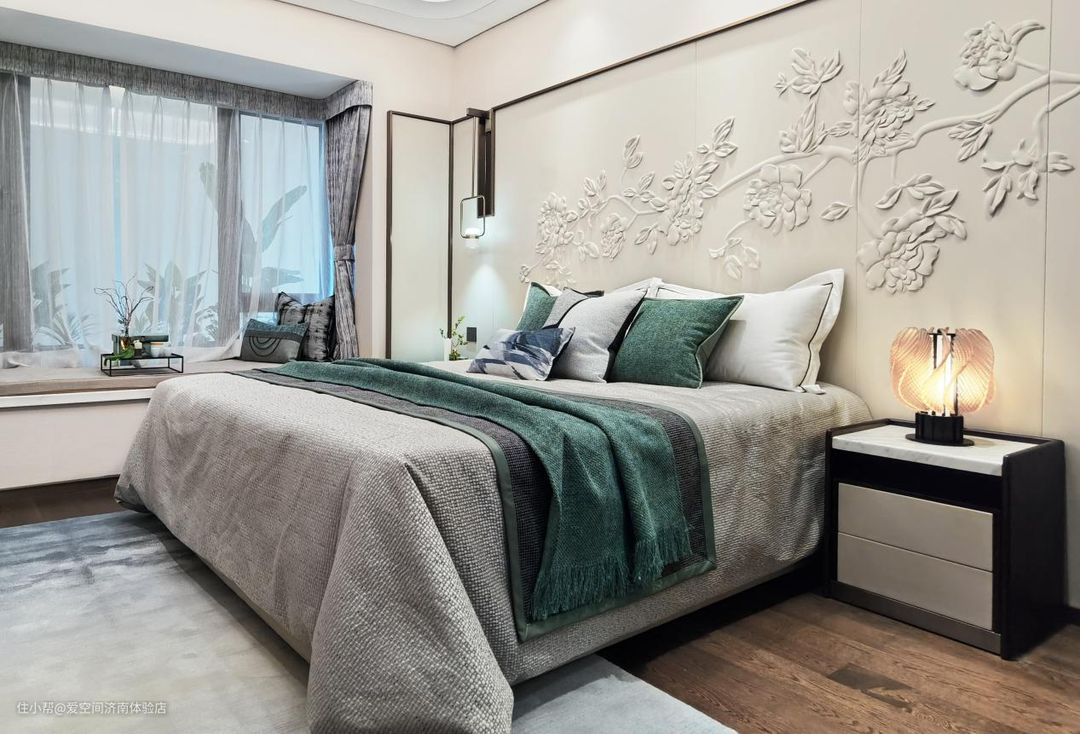 卧室床头的立体墙饰很有真实感,韵味十足。个性吊灯的布置也让卧室空间变得从容而温情。