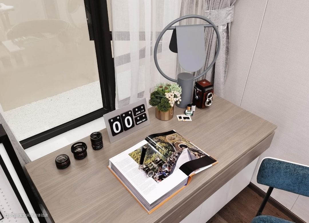 原木材质的小书桌看上去很有质感,自然的木质纹理也给人清新雅致的视觉体验。
