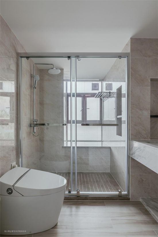 卫生间是普通的居家型设计,玻璃推拉门实现干湿分离,将淋浴房与马桶区域完美分隔开来。小窗户增加采光与通风,壁龛增加收纳,都能够让卫生间看起更加宽敞透亮。
