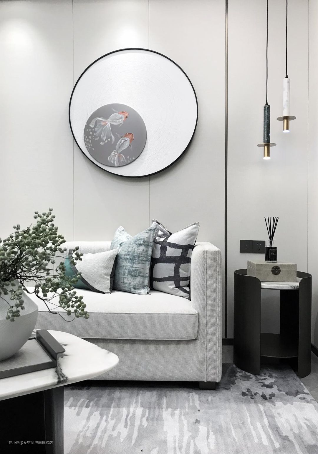 简约大气的白色沙发,背景墙以同色系的护墙板装饰,挂一副圆形画作点缀,运用大量的中式风元素装点细节,显得简约大方,精致无比。