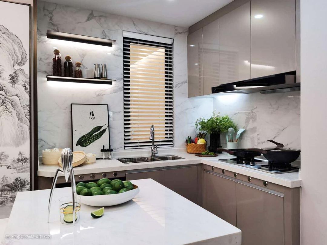 L型厨房布局方便厨房操作的同时,也节省了厨房空间。中间打造宽大的岛台设计,让生活更加方便