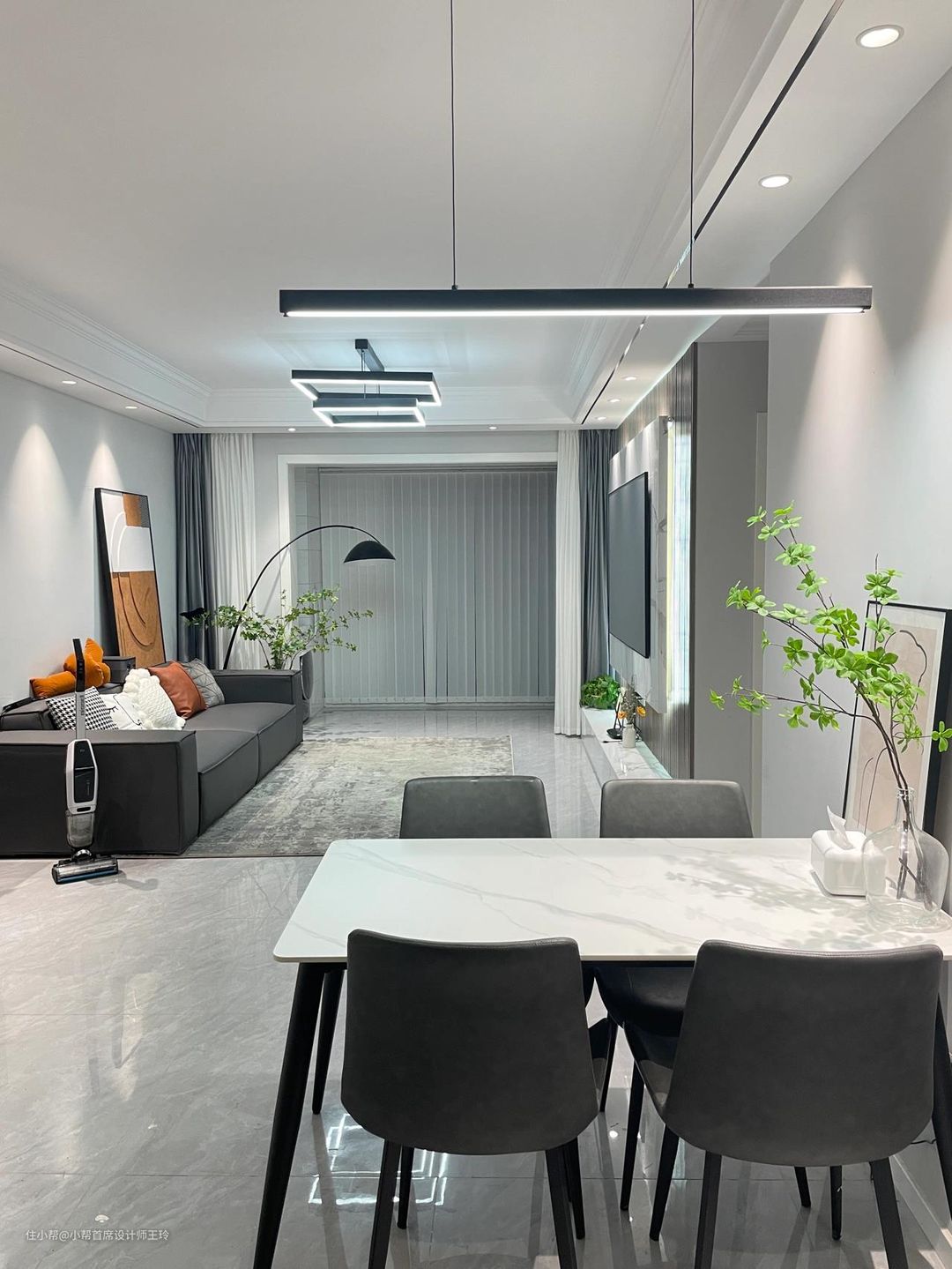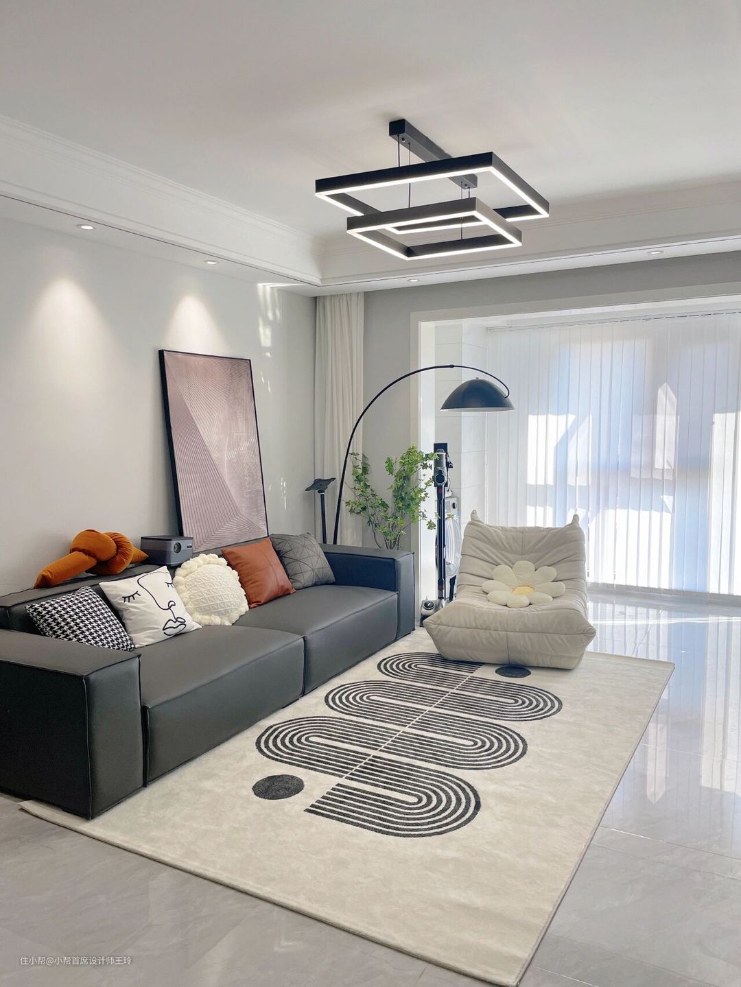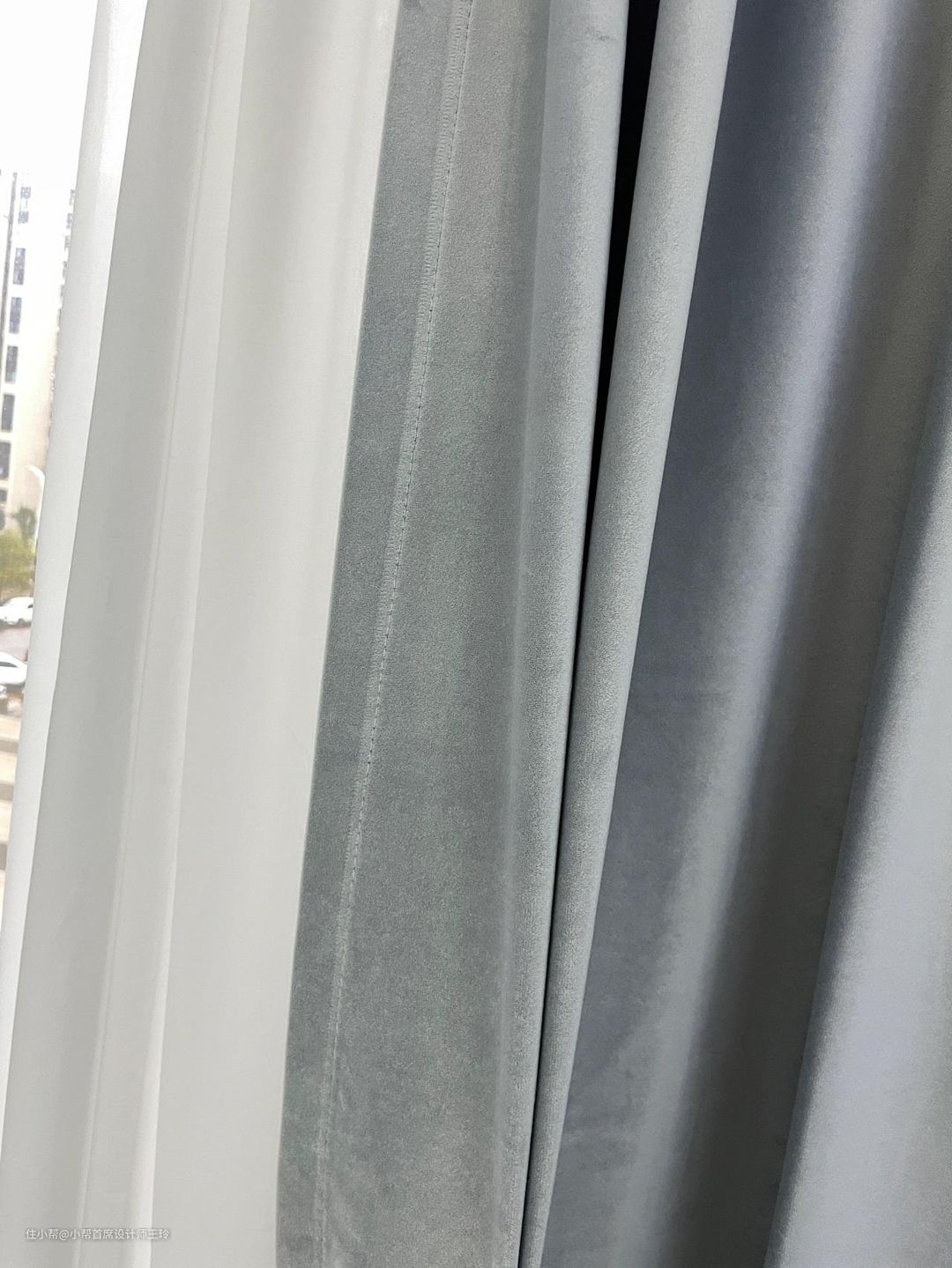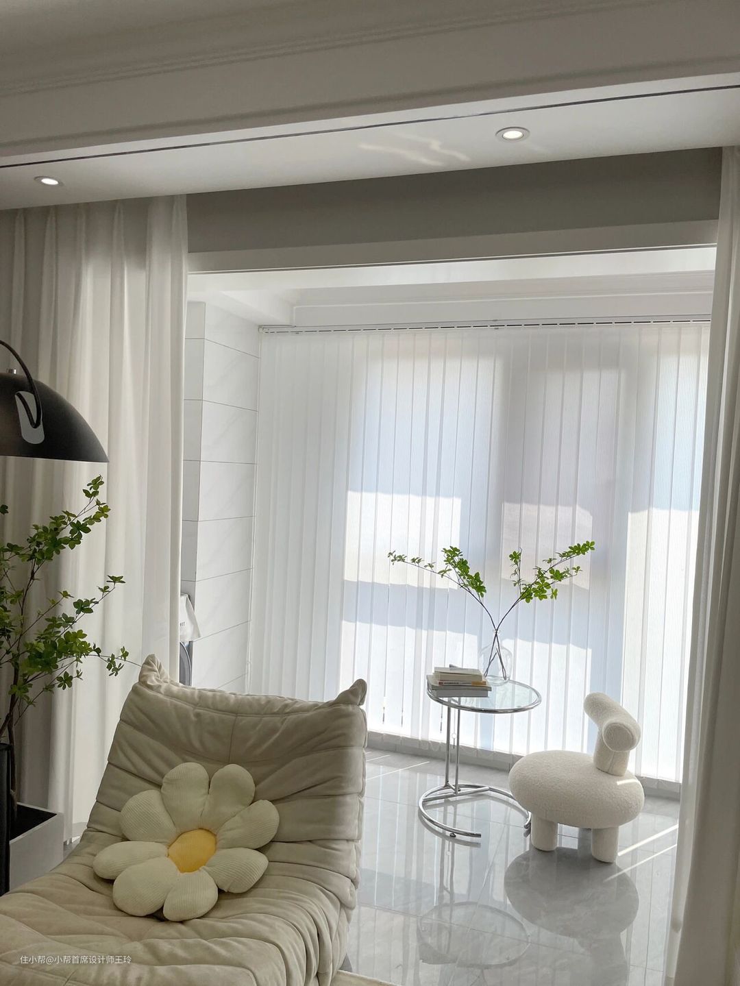客厅素棉纱,透光不透人,阳台竖百叶帘,整体黑白灰,客厅也不考虑什么遮光问题,全部用的白色显得亮堂也很好看