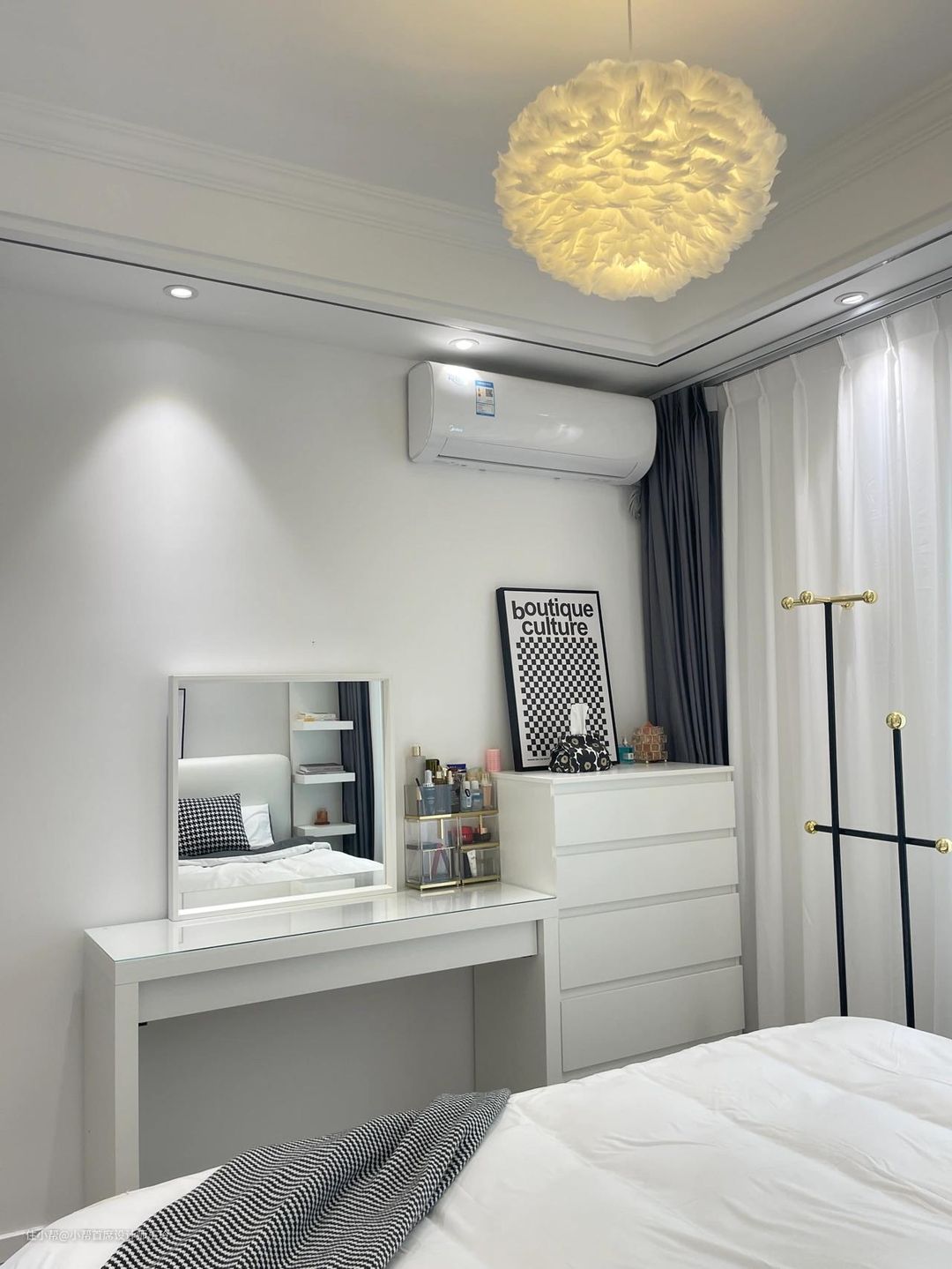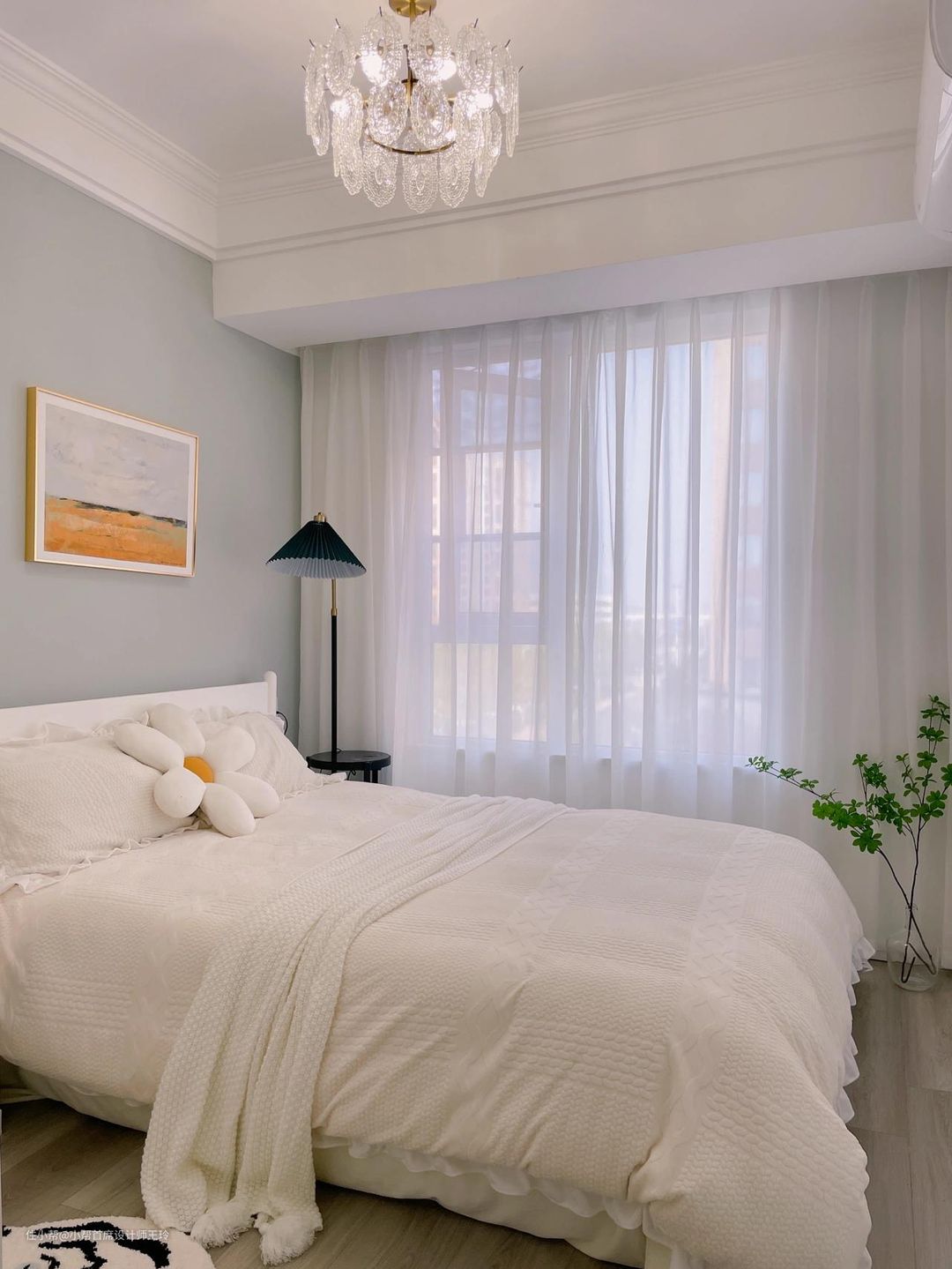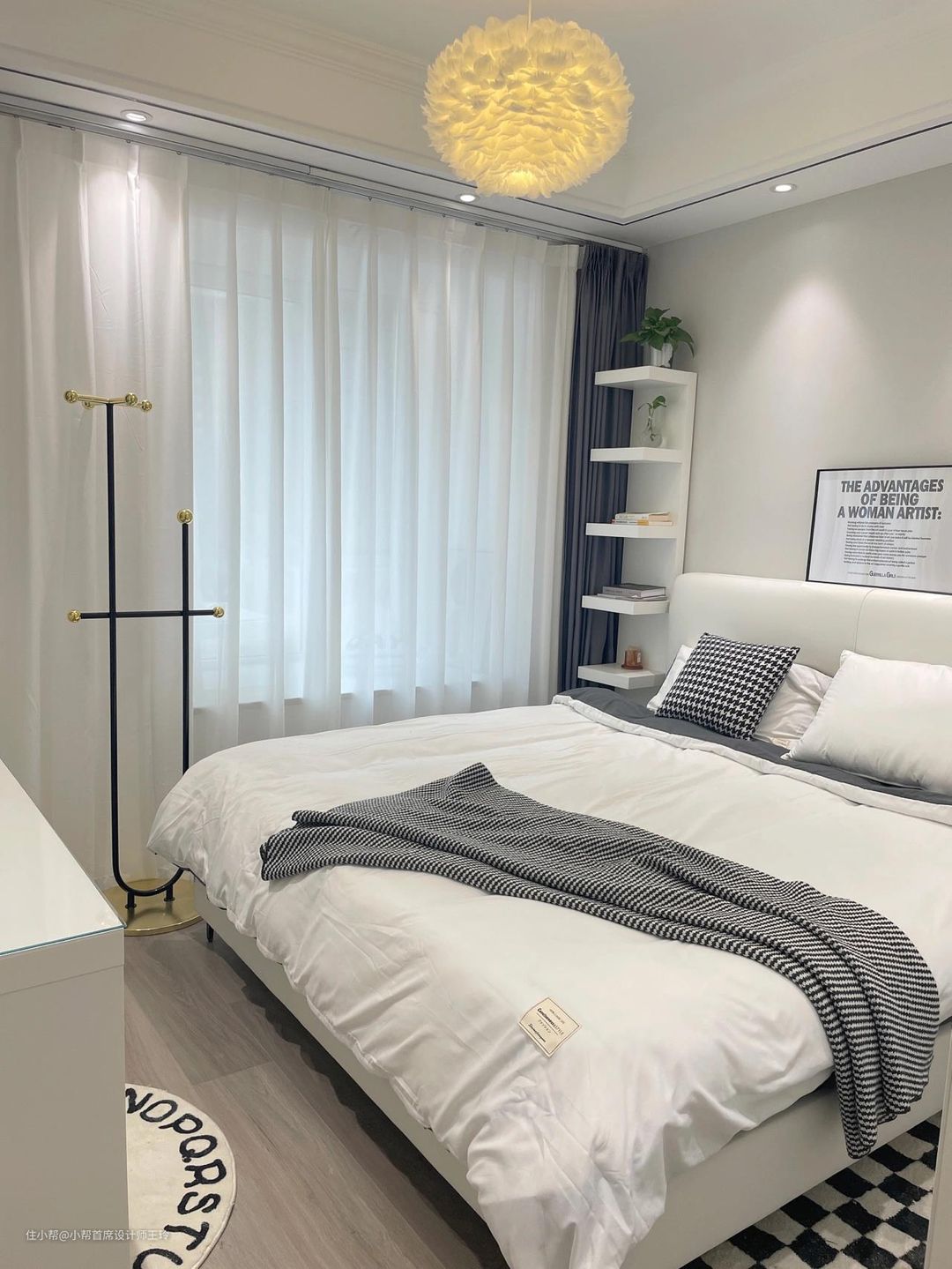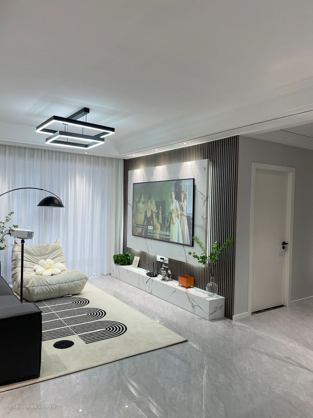客厅素棉纱,透光不透人,阳台竖百叶帘,整体黑白灰,客厅也不考虑什么遮光问题,全部用的白色显得亮堂也很好看