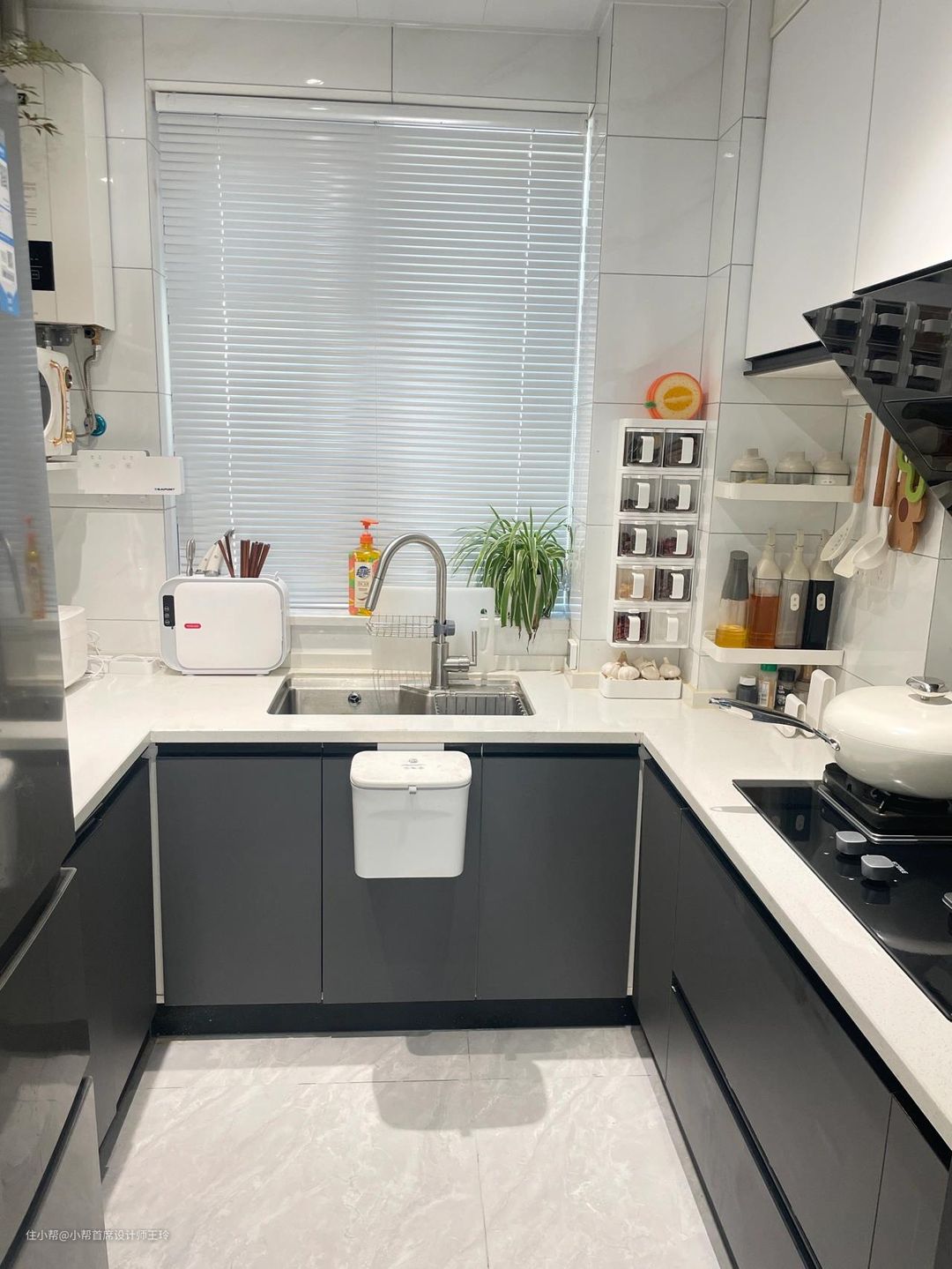 U字型简约灰色系厨房装修,装完中间大概1.15米的距离,并不拥挤,长2.1 宽2.0台面850
