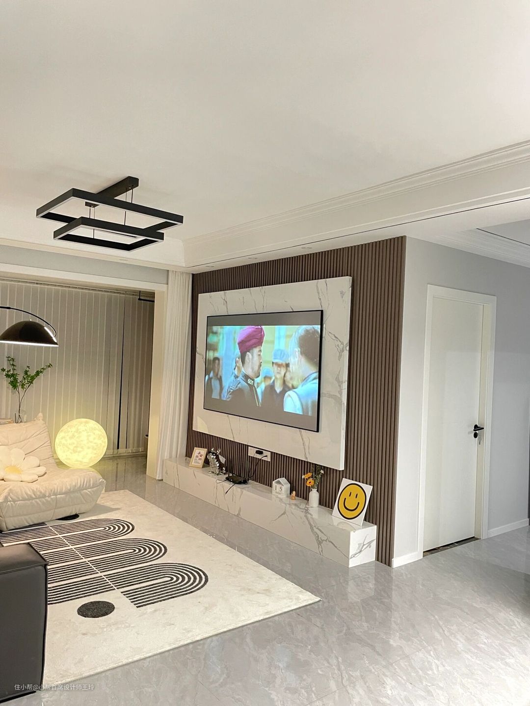 客餐厅通刷的太空漫步,用的普通的白漆我亲自调色,非常浅,采光好的时候淡淡的灰色,人造大理石和咖色木饰格栅,大理石需要木工打底,格栅是粘上去的,整体我感觉还是有点复杂吧