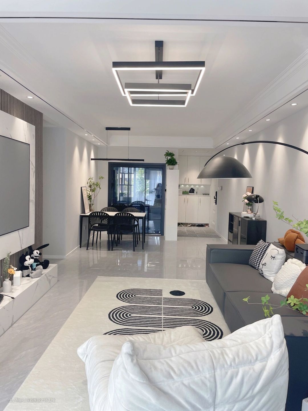 家客厅选的符合现代风格的简约线条灯,既满足日常照明也不缺设计感,射灯是4000k中性光,不惨白,谁不喜欢明亮的感觉,不管选什么灯,尽量色温统一。