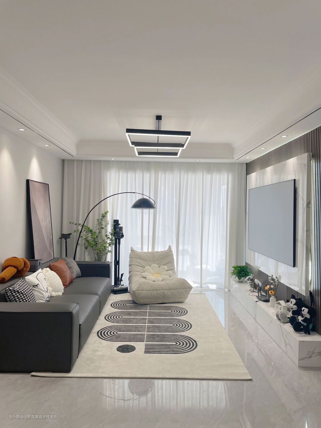 客厅素棉纱,透光不透人,阳台竖百叶帘,整体黑白灰,客厅也不考虑什么遮光问题,全部用的白色显得亮堂也很好看