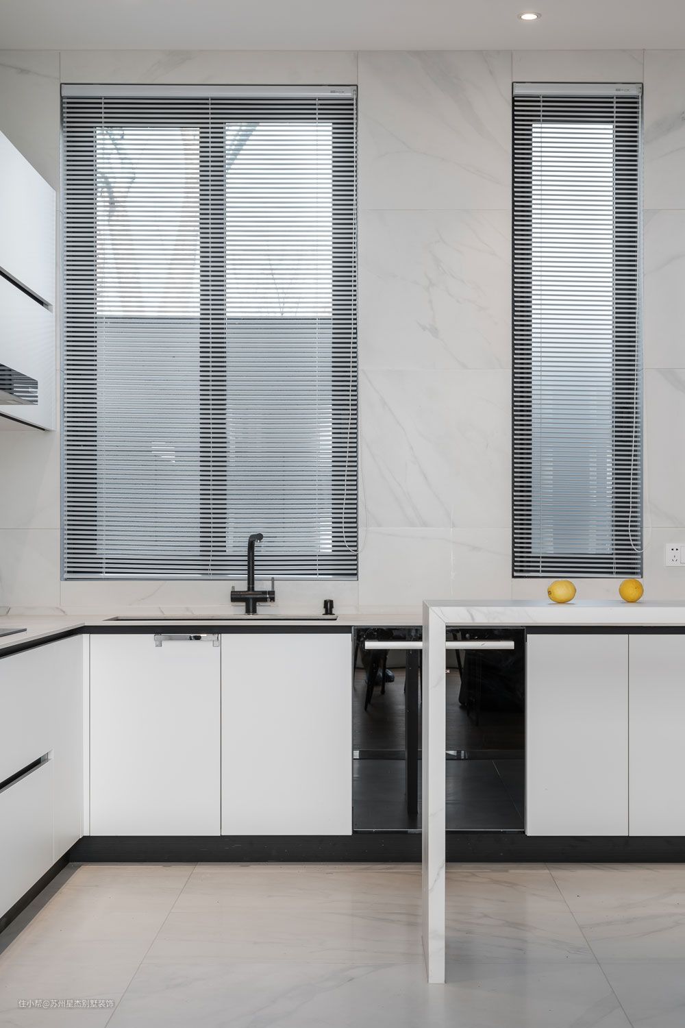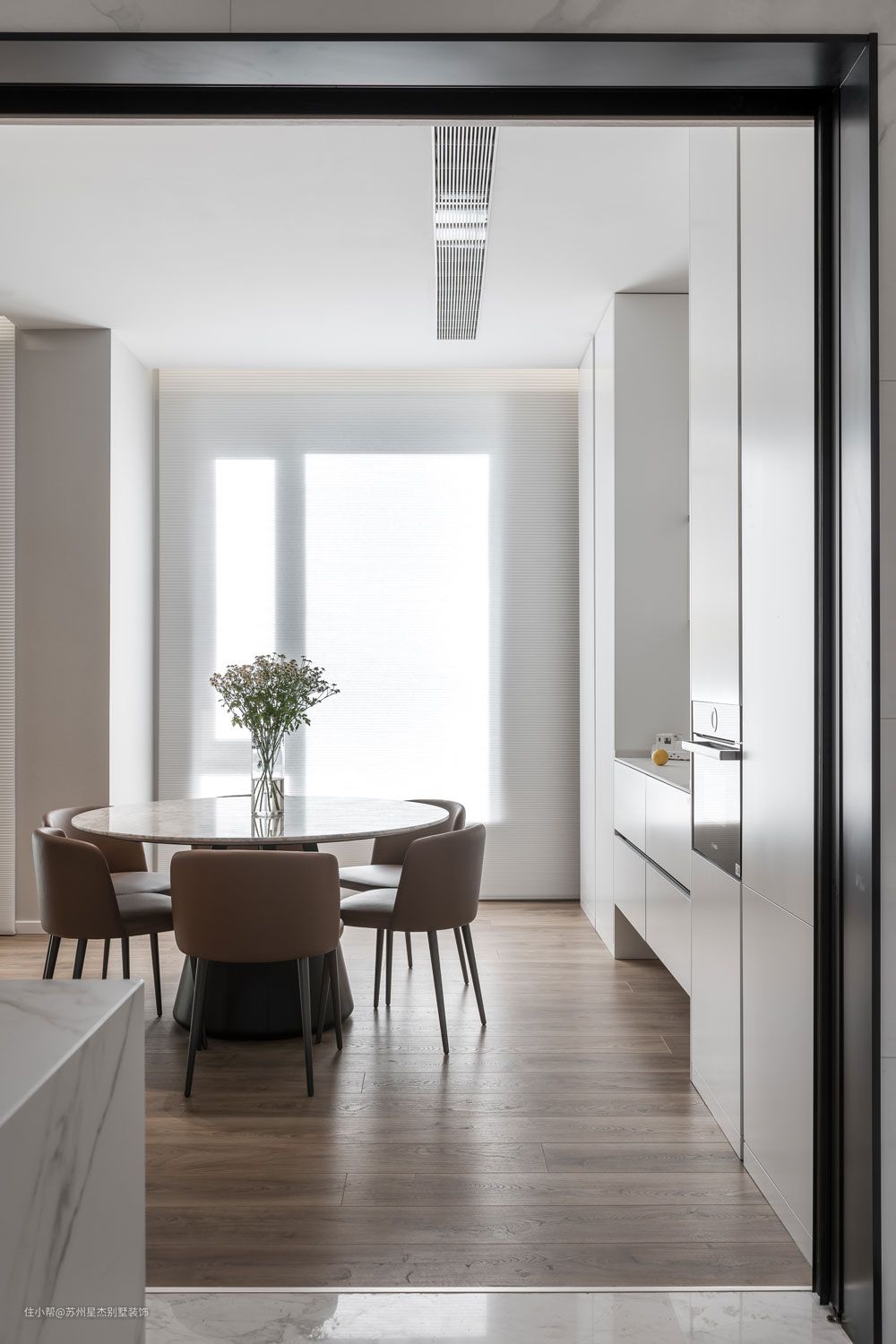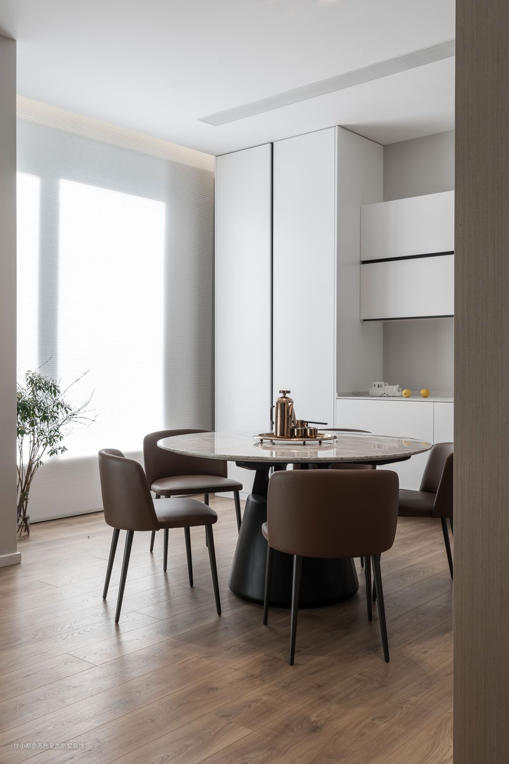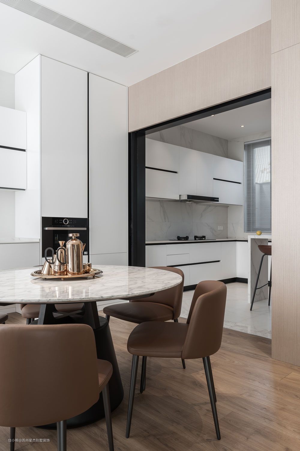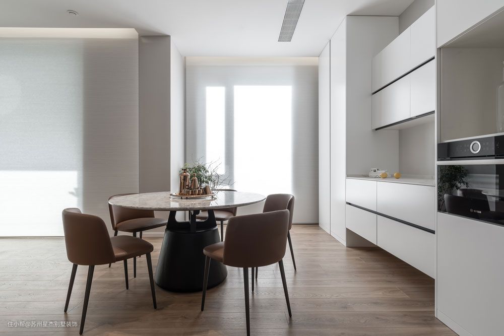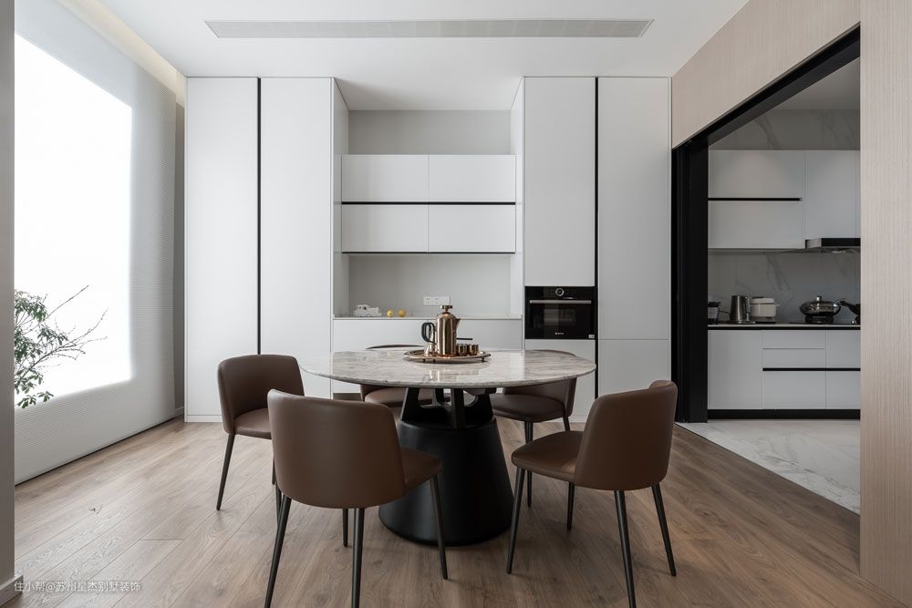 小而精致的圆形大理石餐桌,五位的用餐位,足够满足业主家日常生活需求。耀目的白色收纳柜体,以黑色金属线条作嵌入,现代科技感十足。