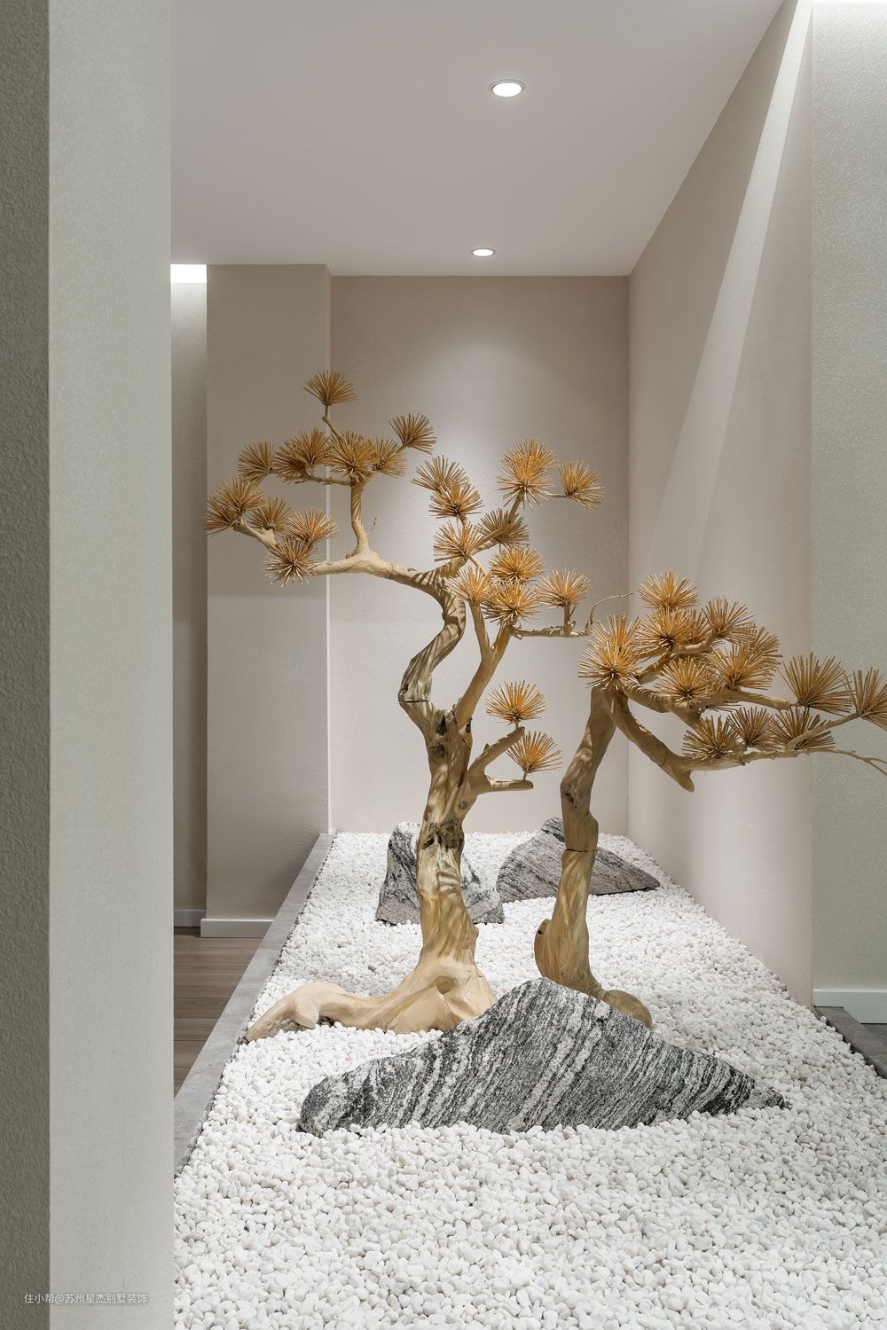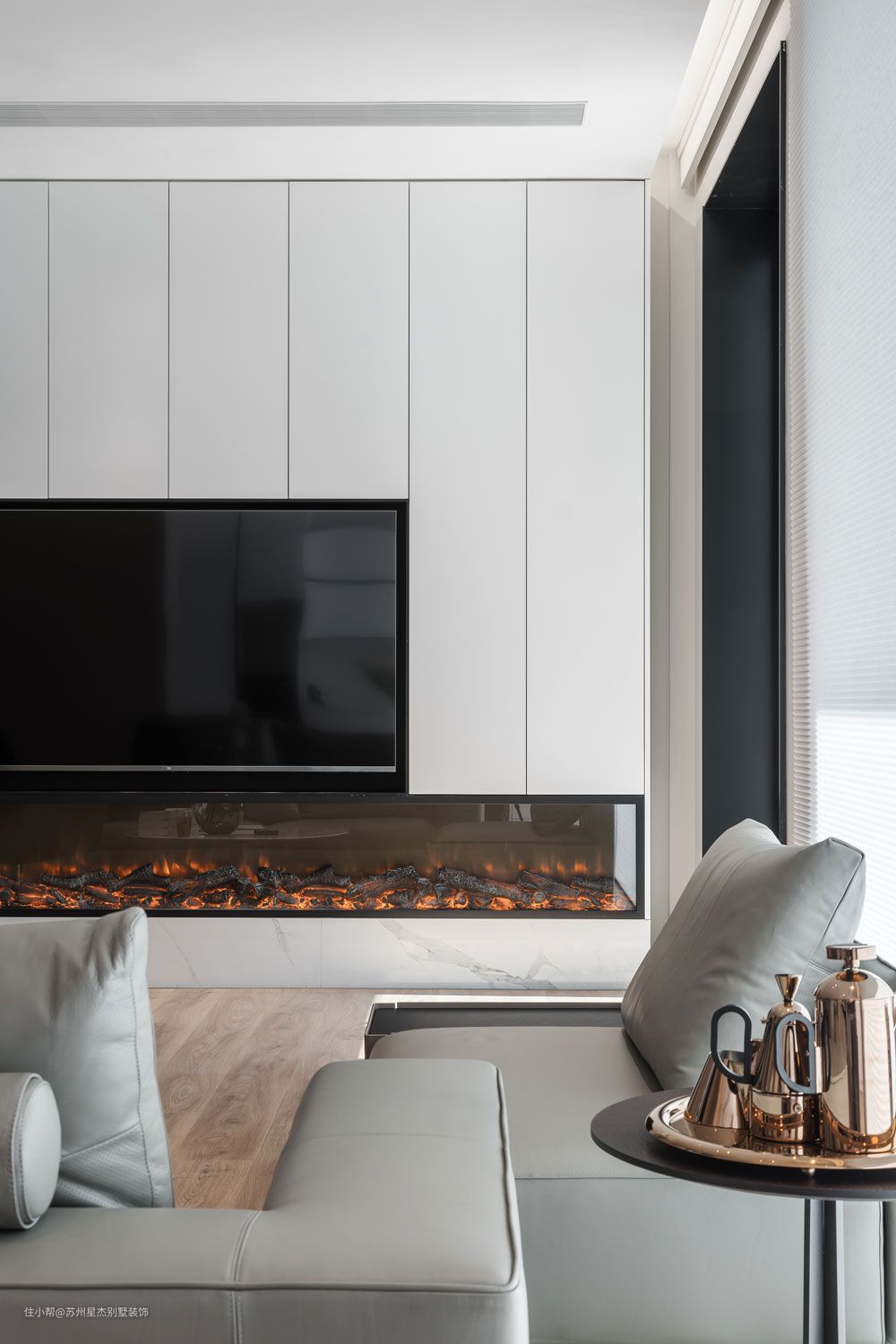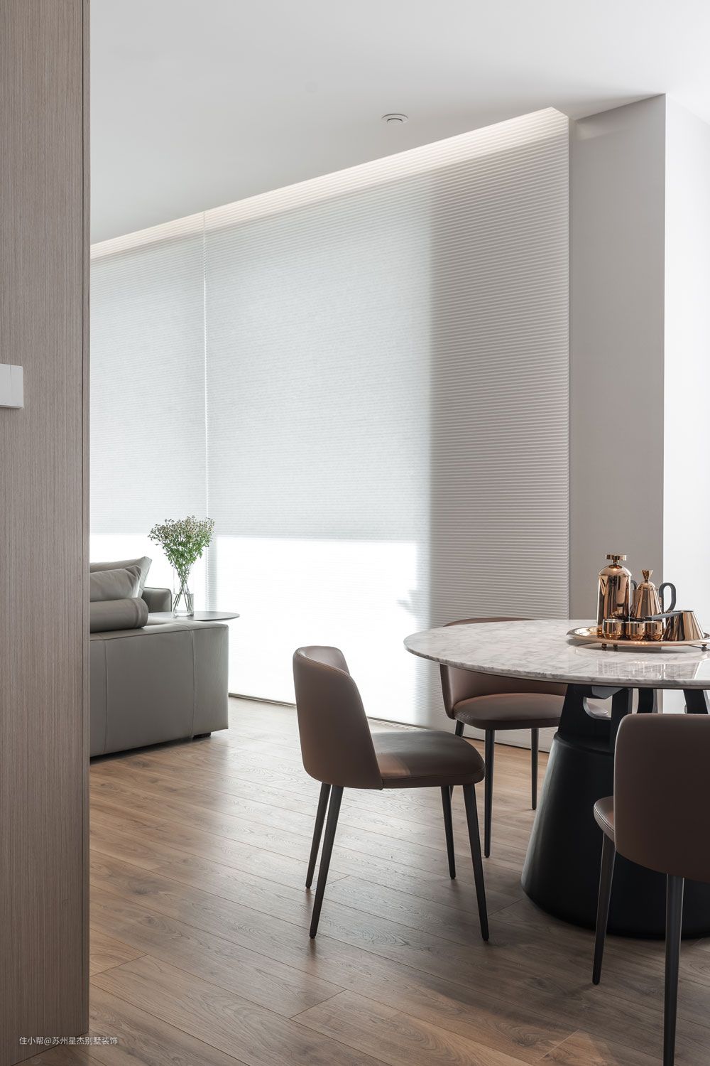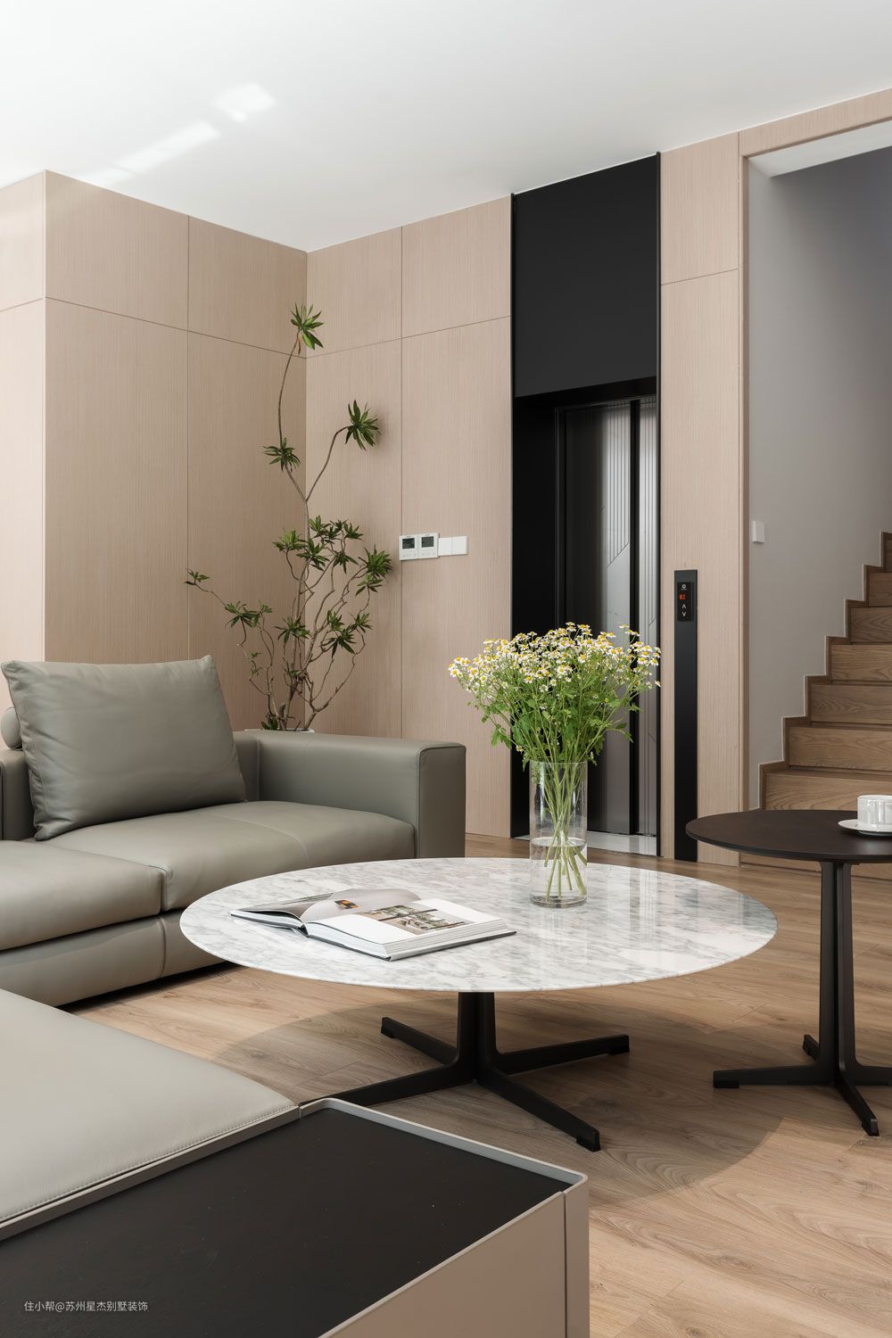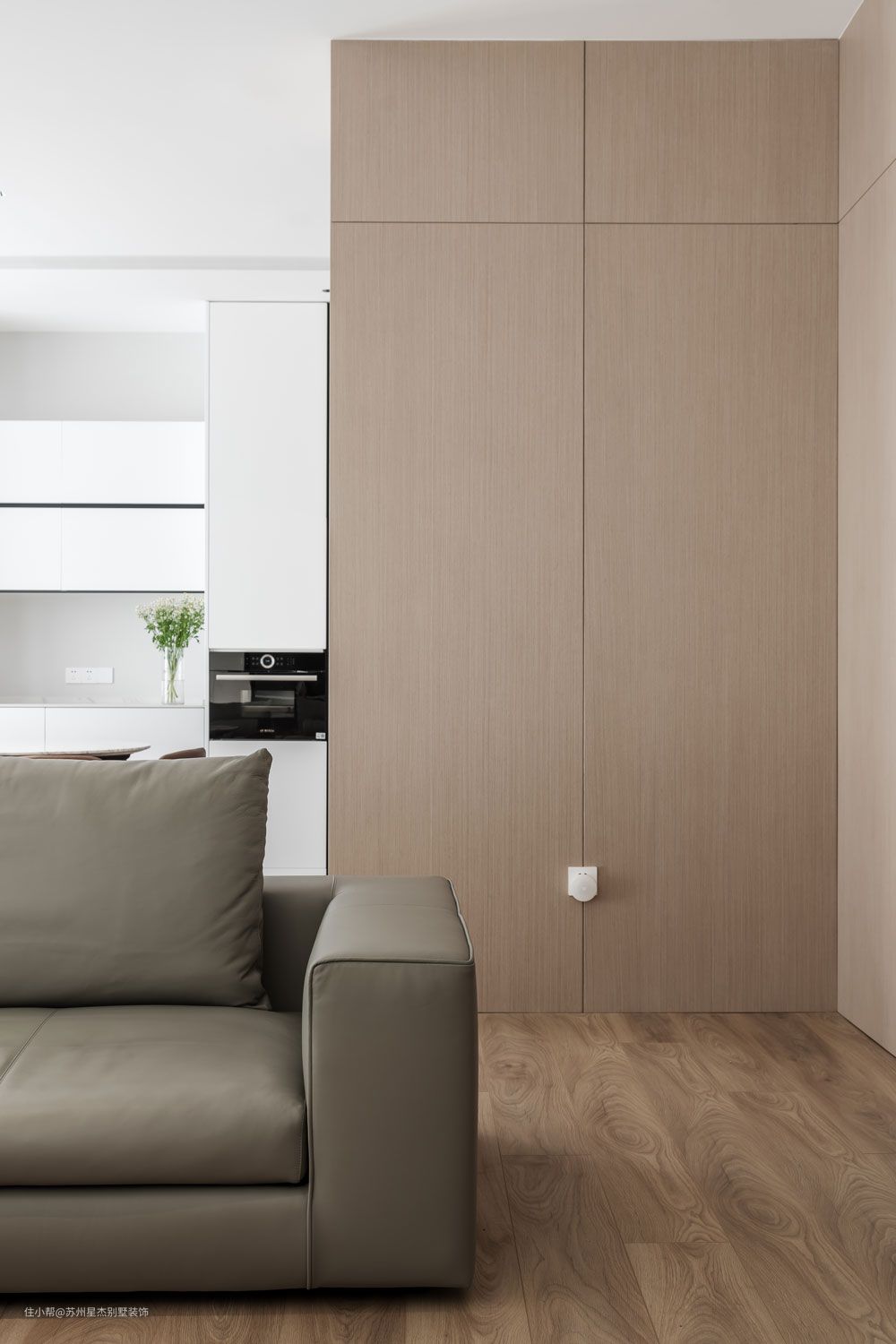 未入住的房子,绿色植物俨然先于人,成为了这个家的主人。暖意的木饰面和绿意盎然的青枝,肆意伸展。