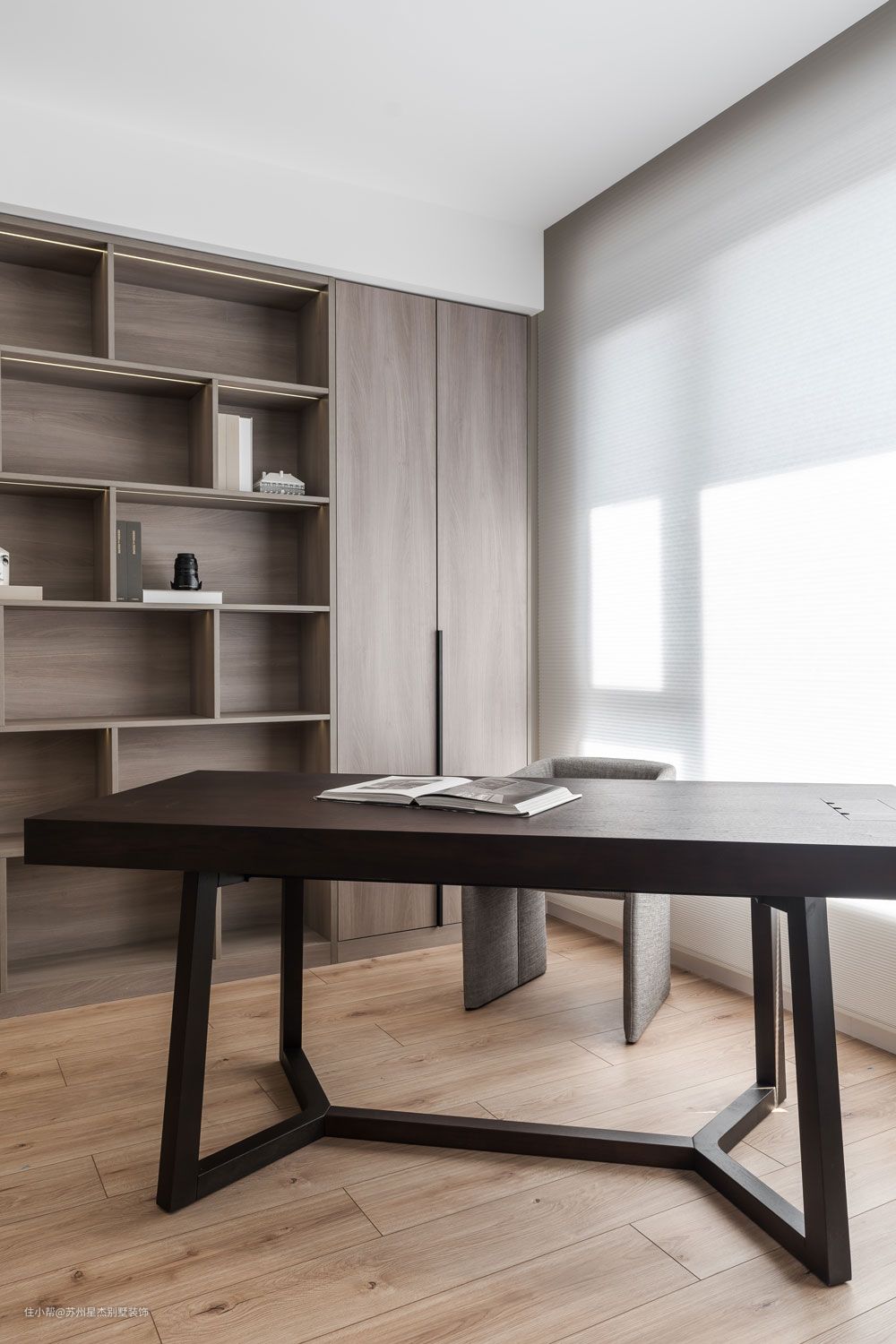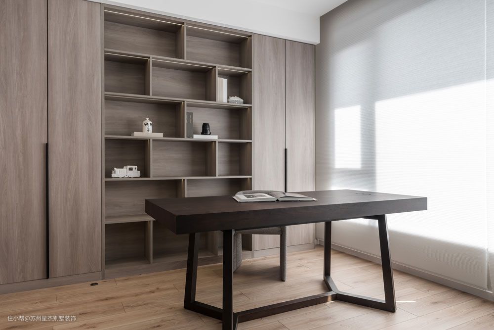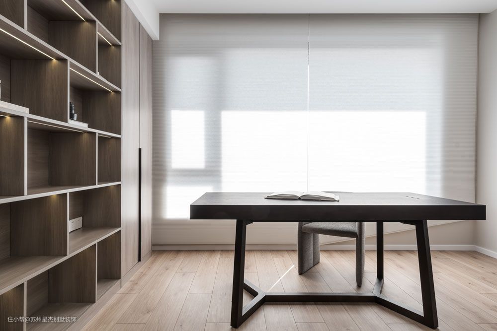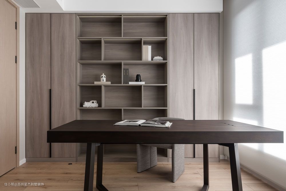 在新家里,所有人的一天总是跟随阳光开始,到开放式厨房和餐厅吃早餐,继而在书房,开启一天的冥想、阅读和创作。素净的胡桃木色呈现出侘寂之美,为书房营造出了天然的静谧氛围感。