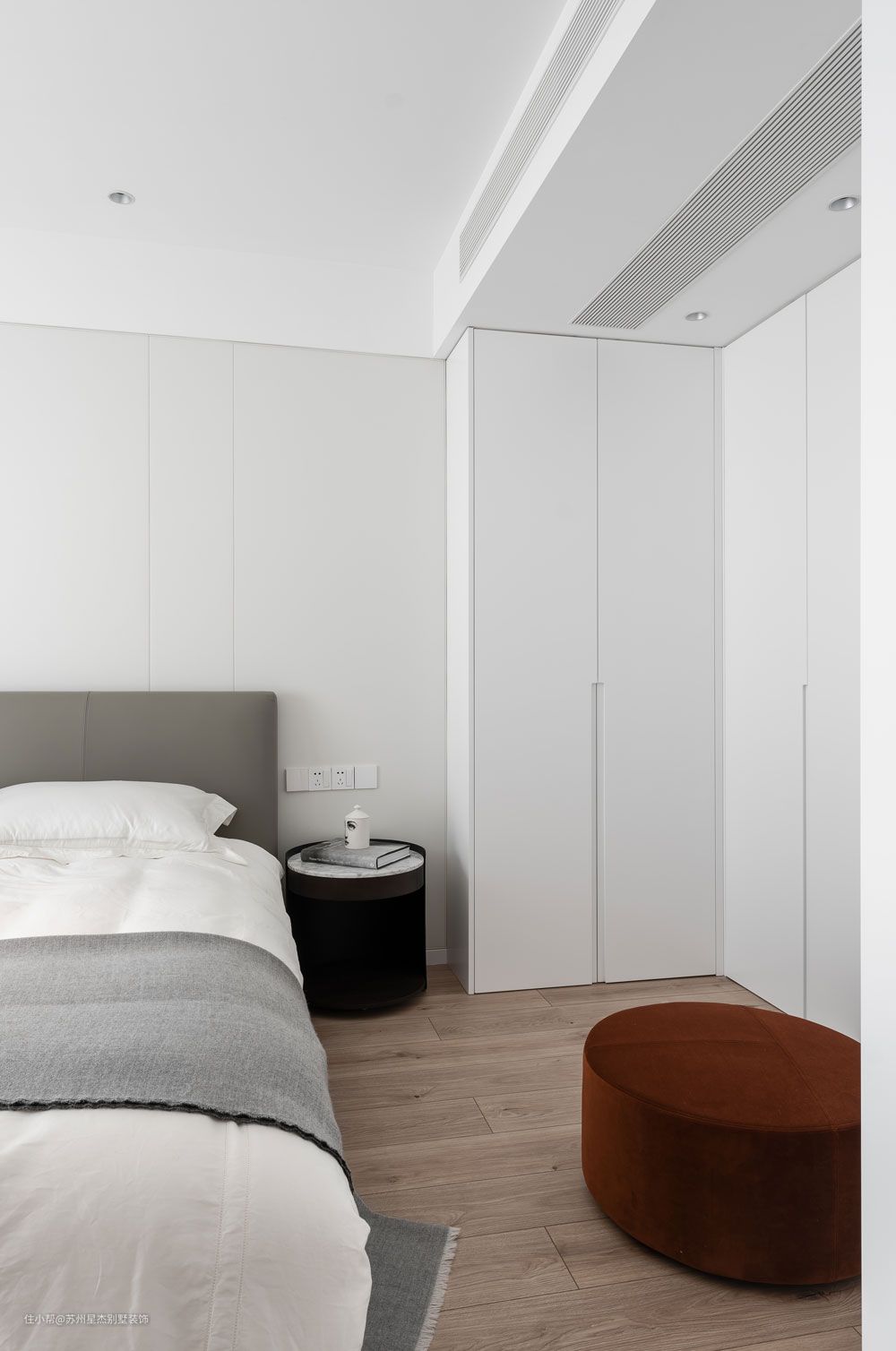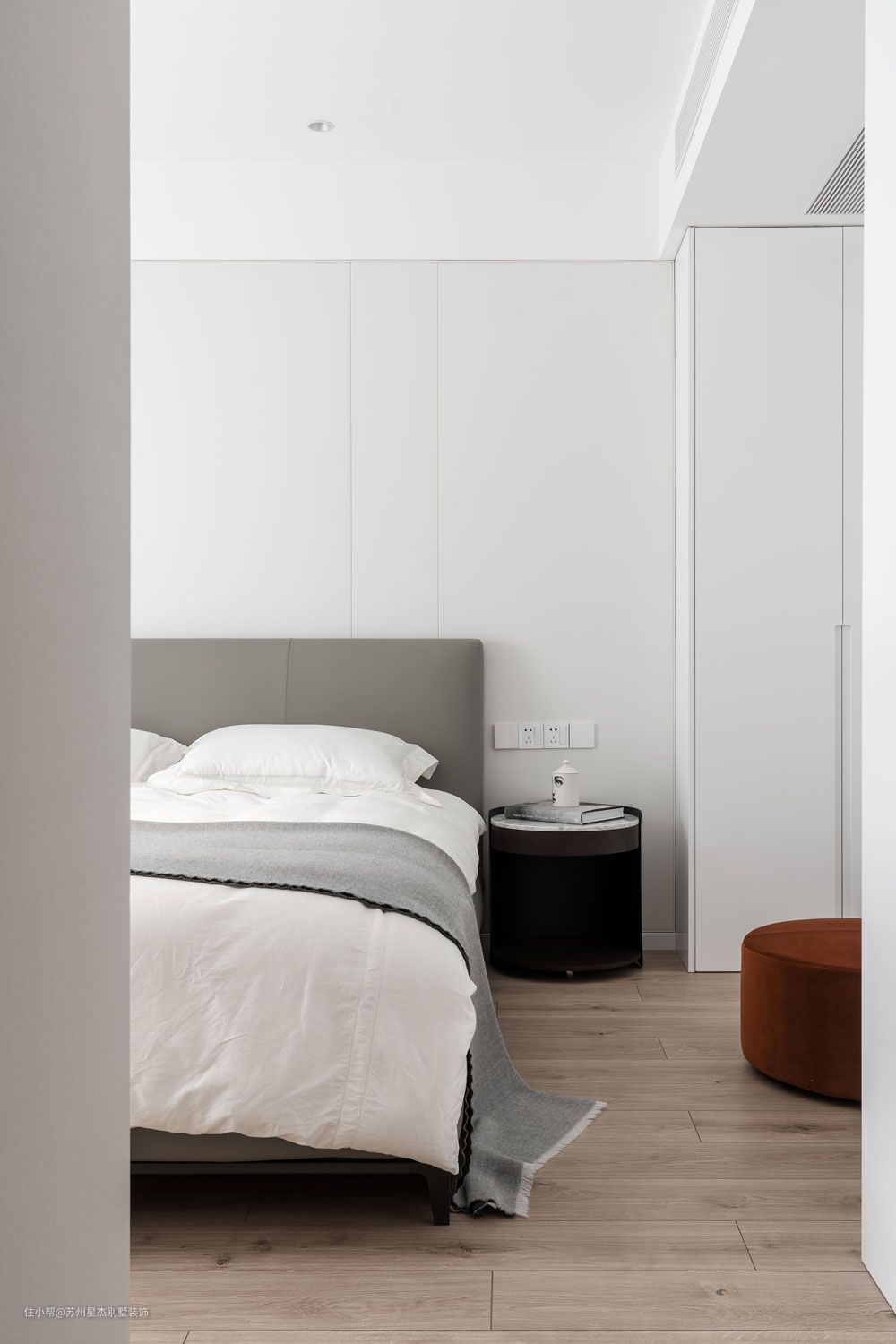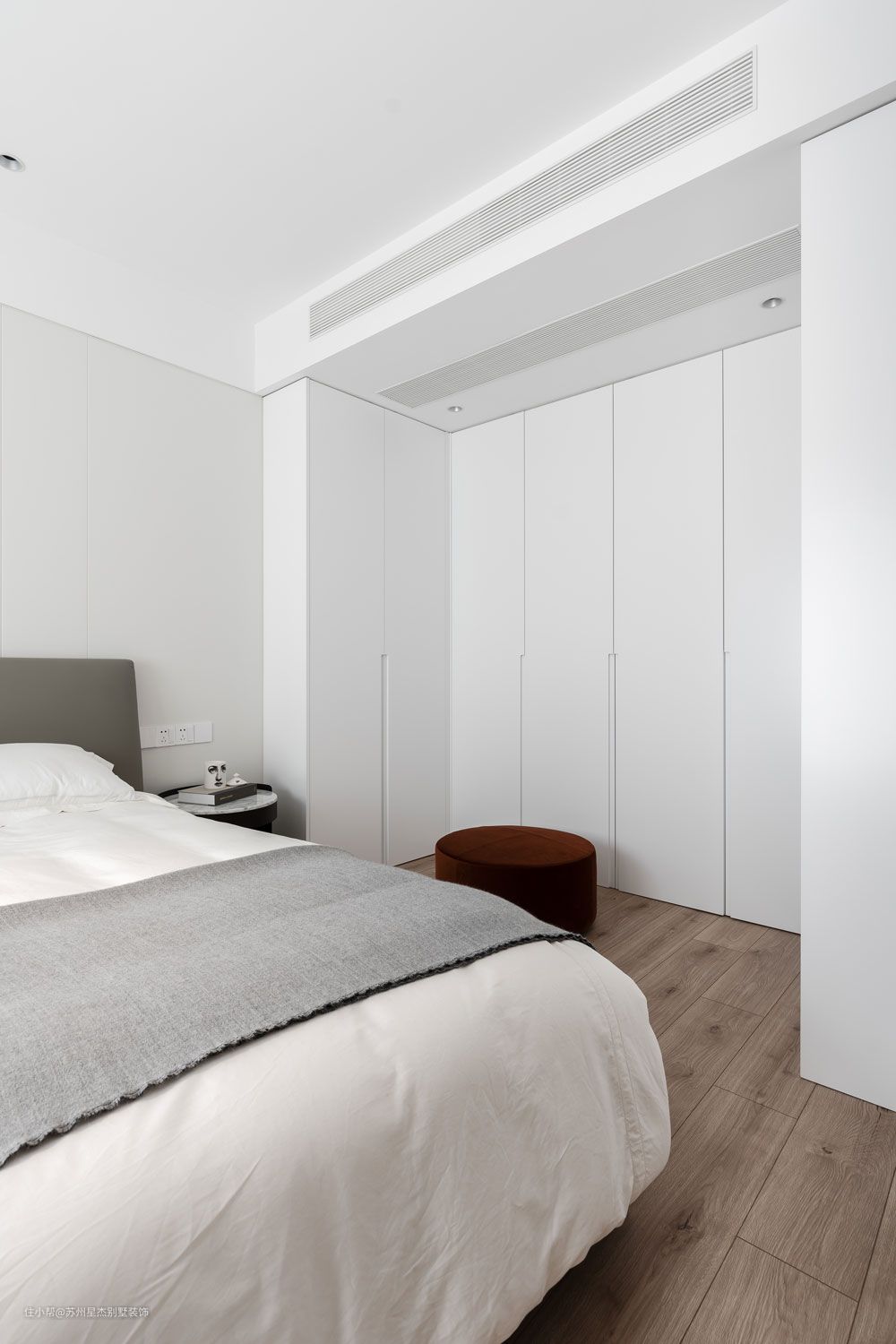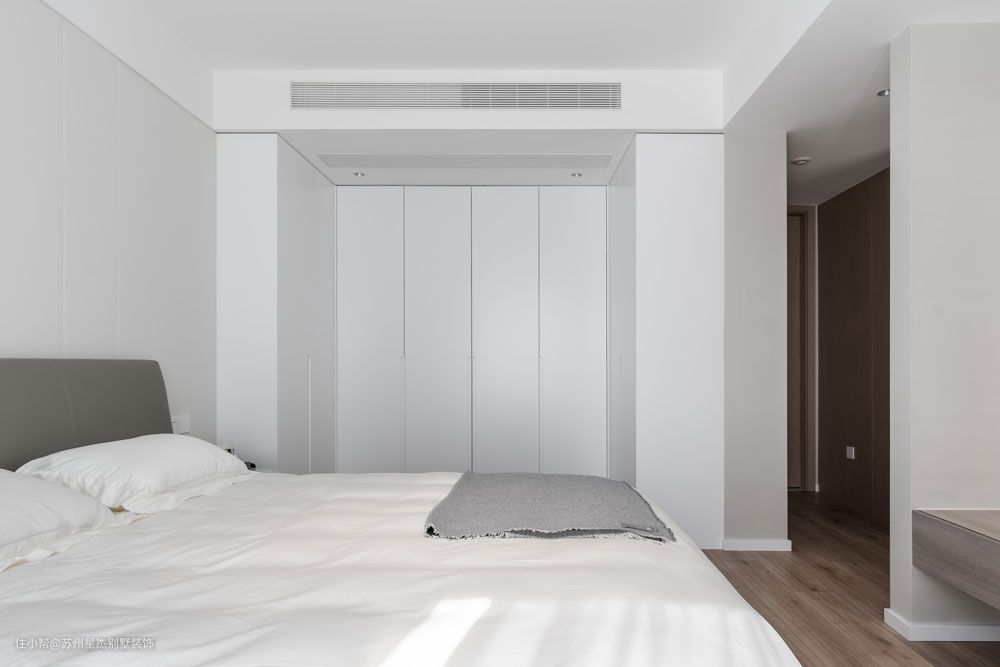 卧室被设计得如同一个白色容器,温暖的光束与精美家具在一片纯白之中闪光。