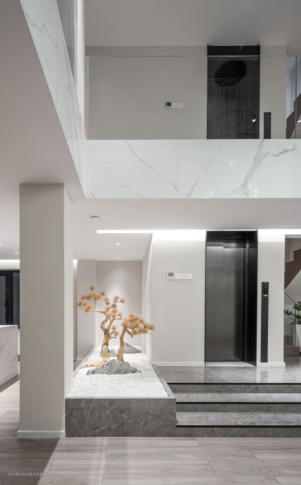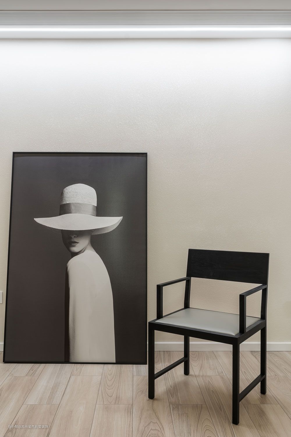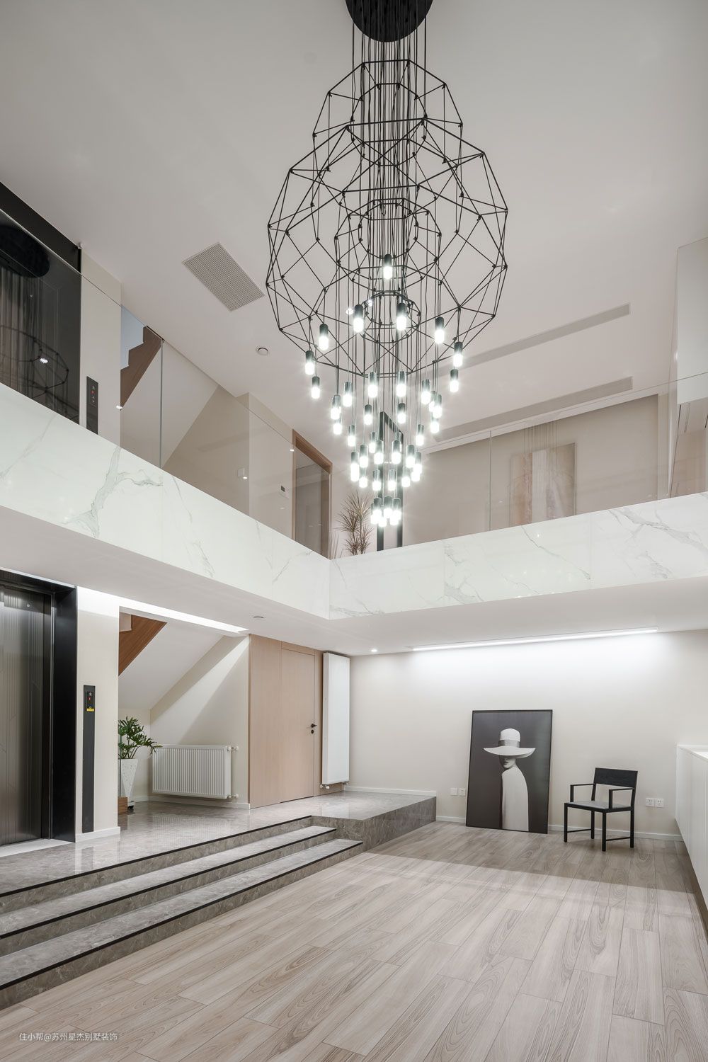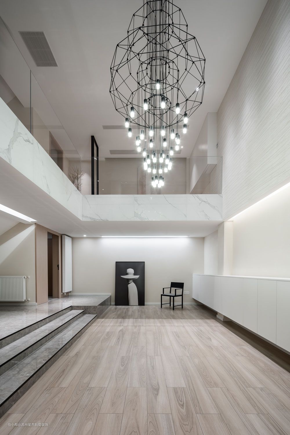 然而,拥有深度并不意味着抹去趣味,地下室的挑空,被一盏几何造型的金属异形吊灯占据,一幅画,一张西扎书椅,留出空间,存有留白。