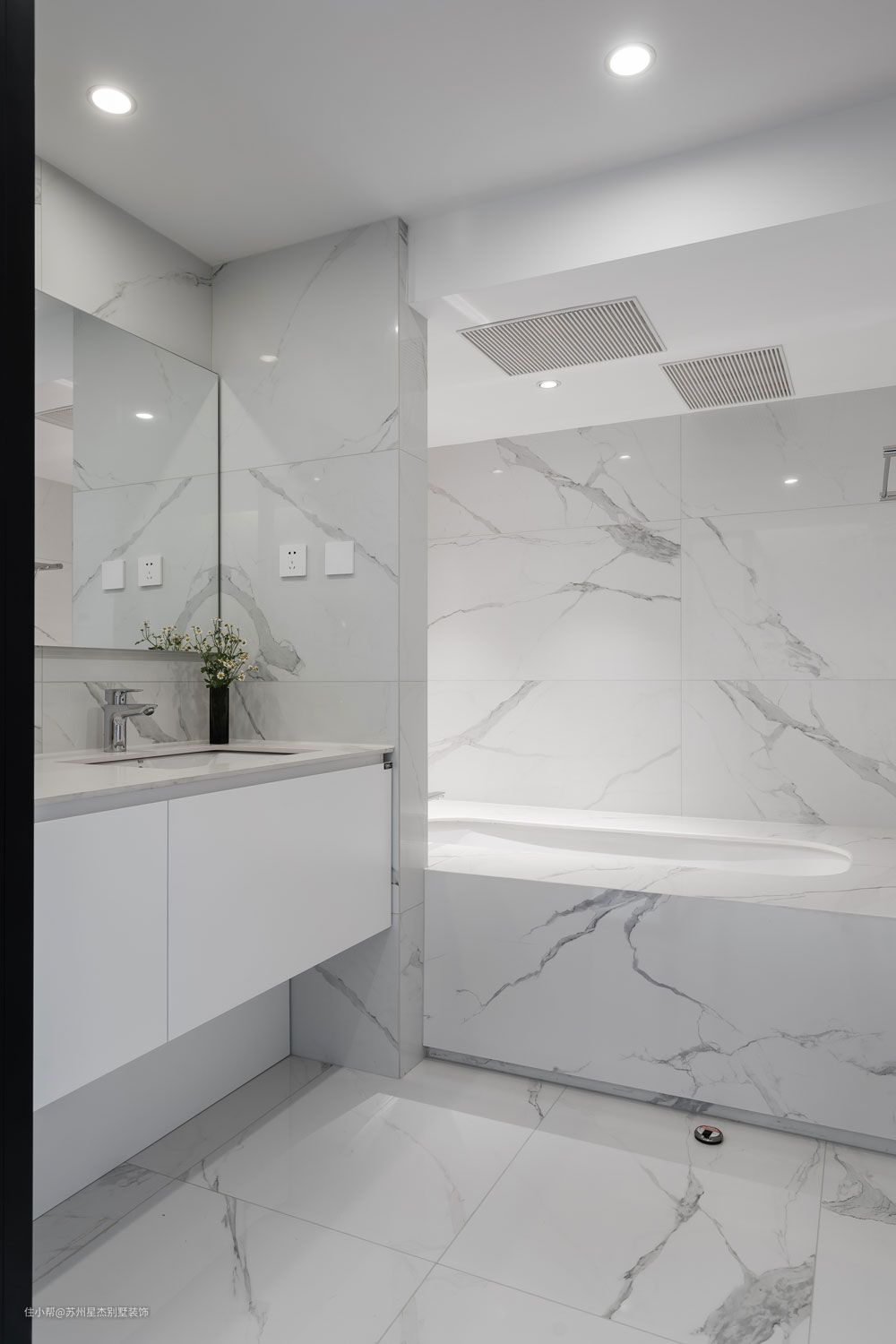 大理石纹理爬满了整个浴室空间,浅浅淡淡的线条和色块,像是不经意被泼上墙的中式水墨画。
