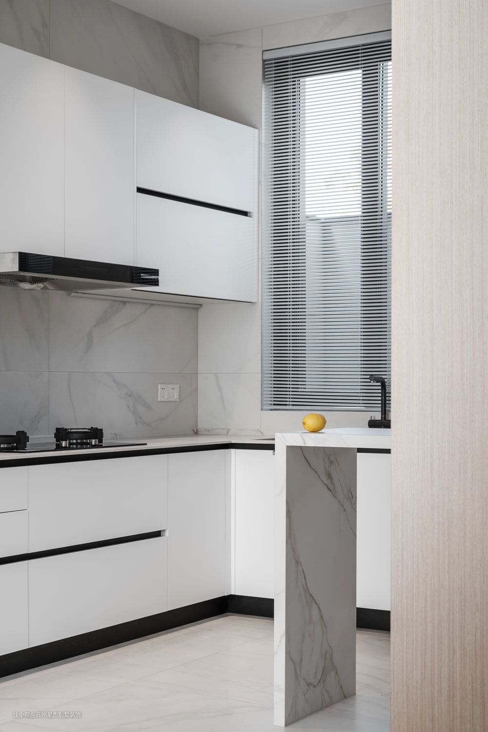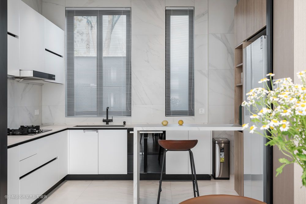 结合业主的诉求与想法,烹饪空间与用餐空间被一扇玻璃移门分隔开在两侧。在极简风格的设计中,意义的简明不如意义的丰富,功能既要含蓄也要明确,喜欢黑白灰但不喜欢非黑即白,所以设计师增加了木色、棕橘色。