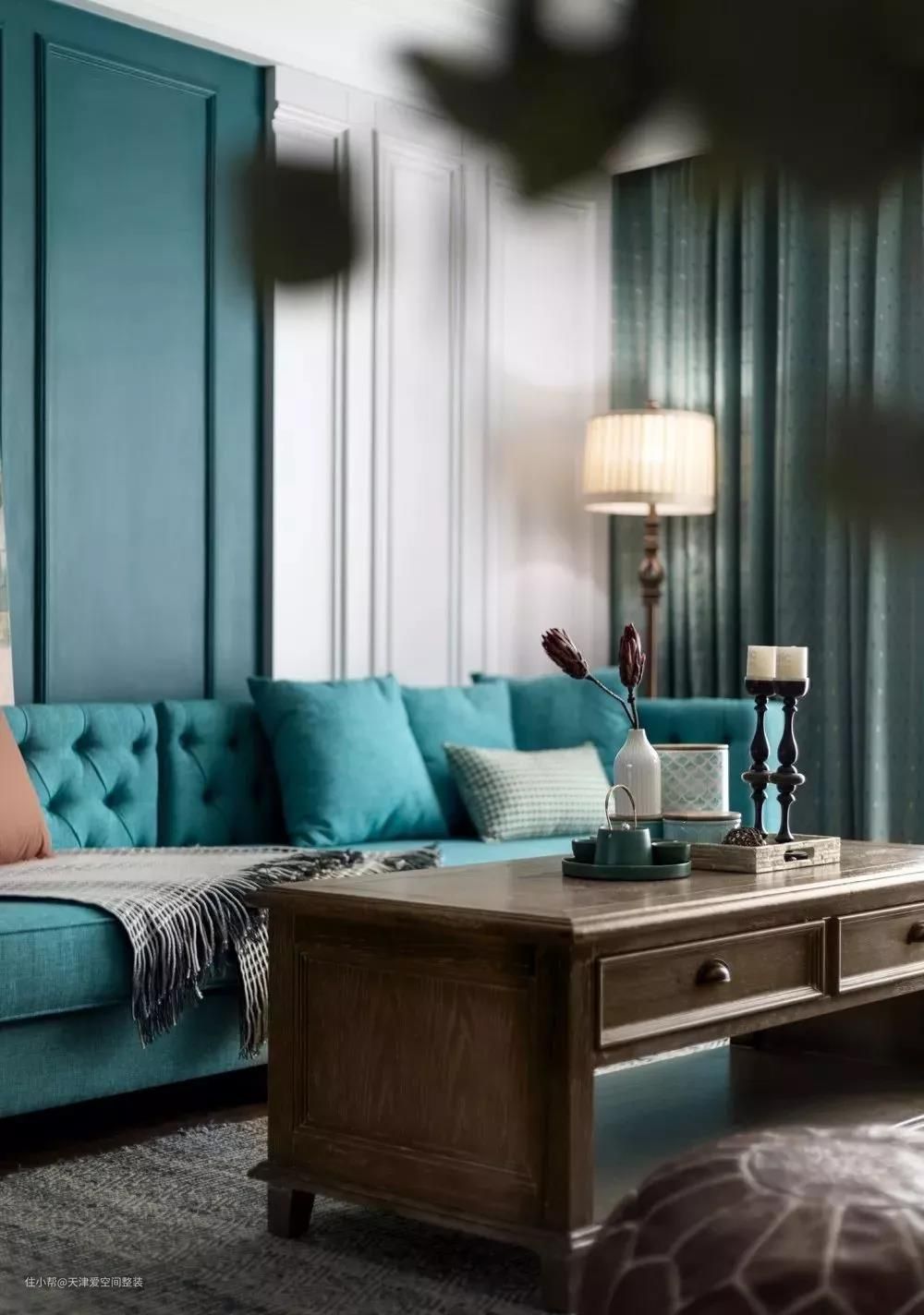 客厅运用祖母绿、白色、灰色、深棕色等多种颜色搭配,营造出温馨、舒适、雅致之感。主沙发选择了手感细腻、坐感舒适的棉麻材质,色彩上与背景墙属于同色系,整体比较的和谐。 顶部四周用凸面石膏线全包,安装了金属玻璃吊灯,充满了复古田园的情调。