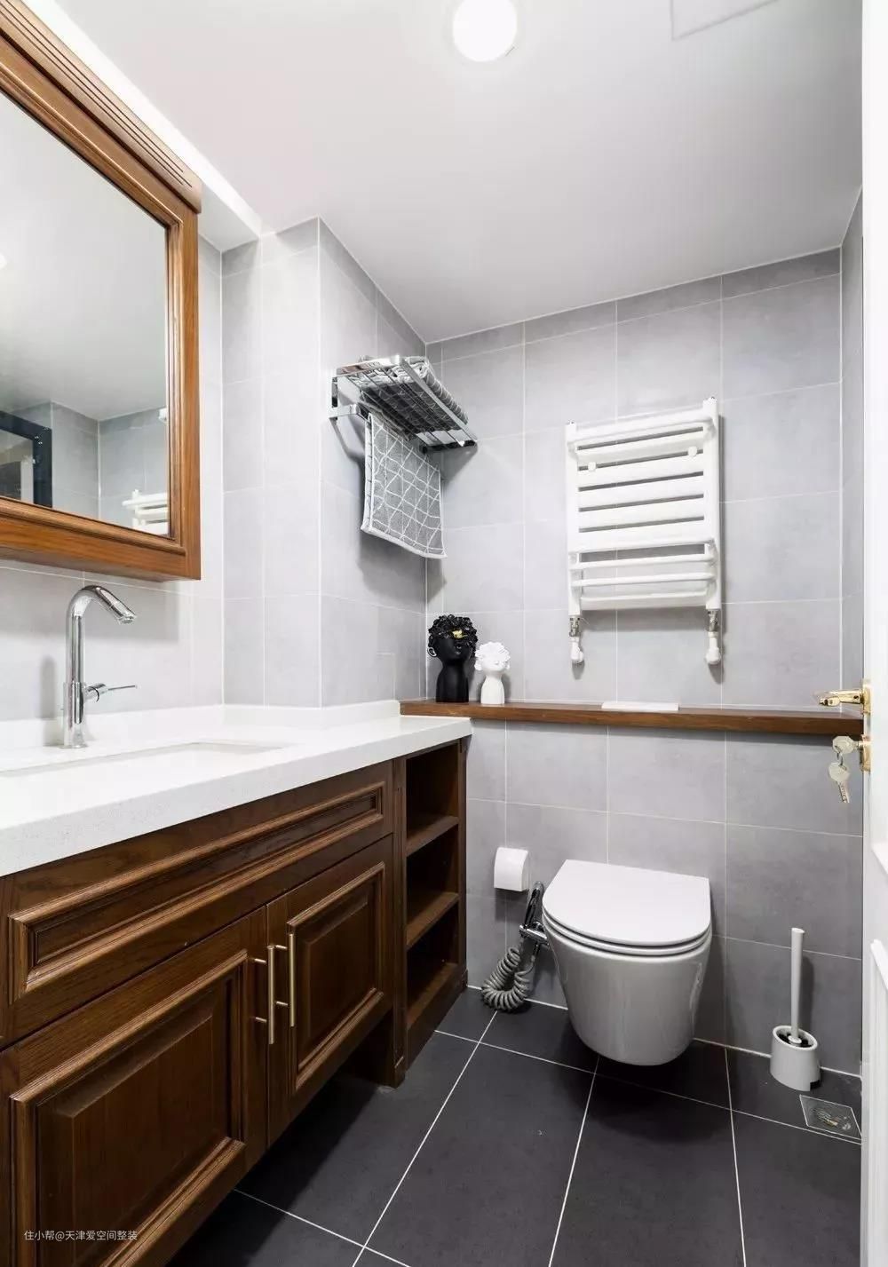 卧室的独立卫生间选用灰色系地砖和墙砖铺设,端庄典雅。台盆柜门选用樱桃木材质,上面安装了金色把手,镜子也用木质边框包裹,弱化了空间的冰冷感。